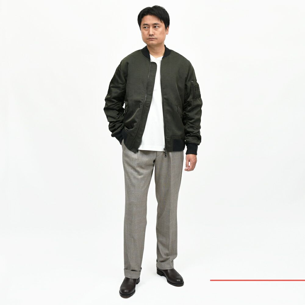 意外性がありながらも合わせ自体は特に難しくありません、個人的にはブルゾンの雰囲気を引き立たせる為にインナーやパンツはクリーンなもので合わせたいですね。