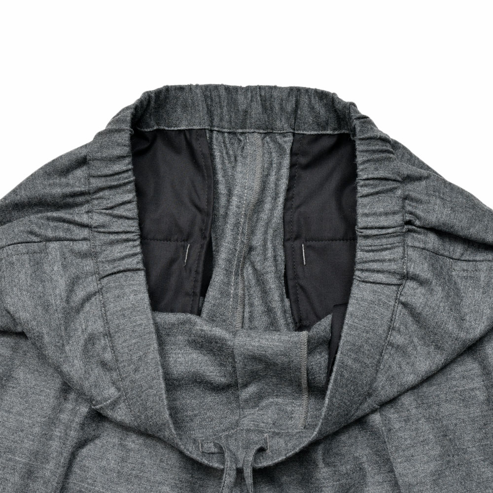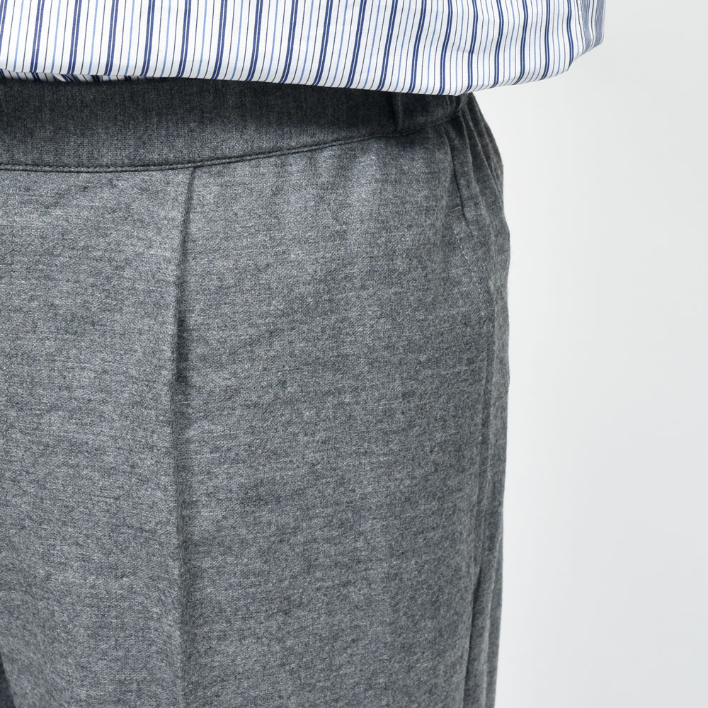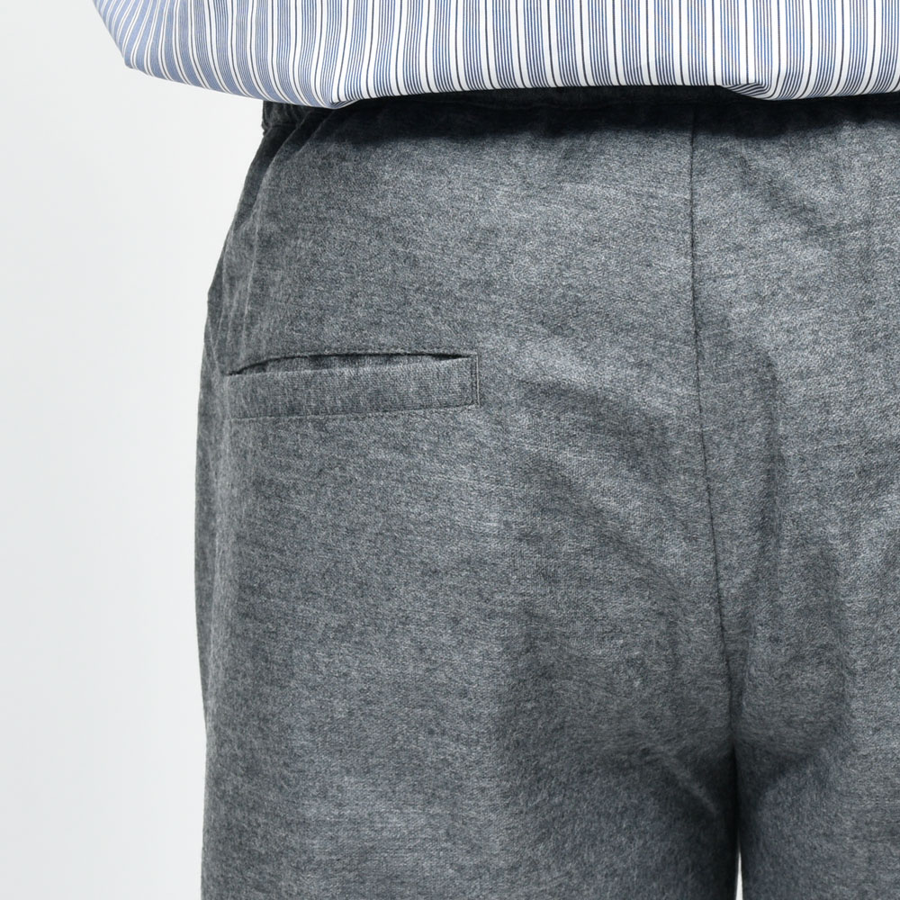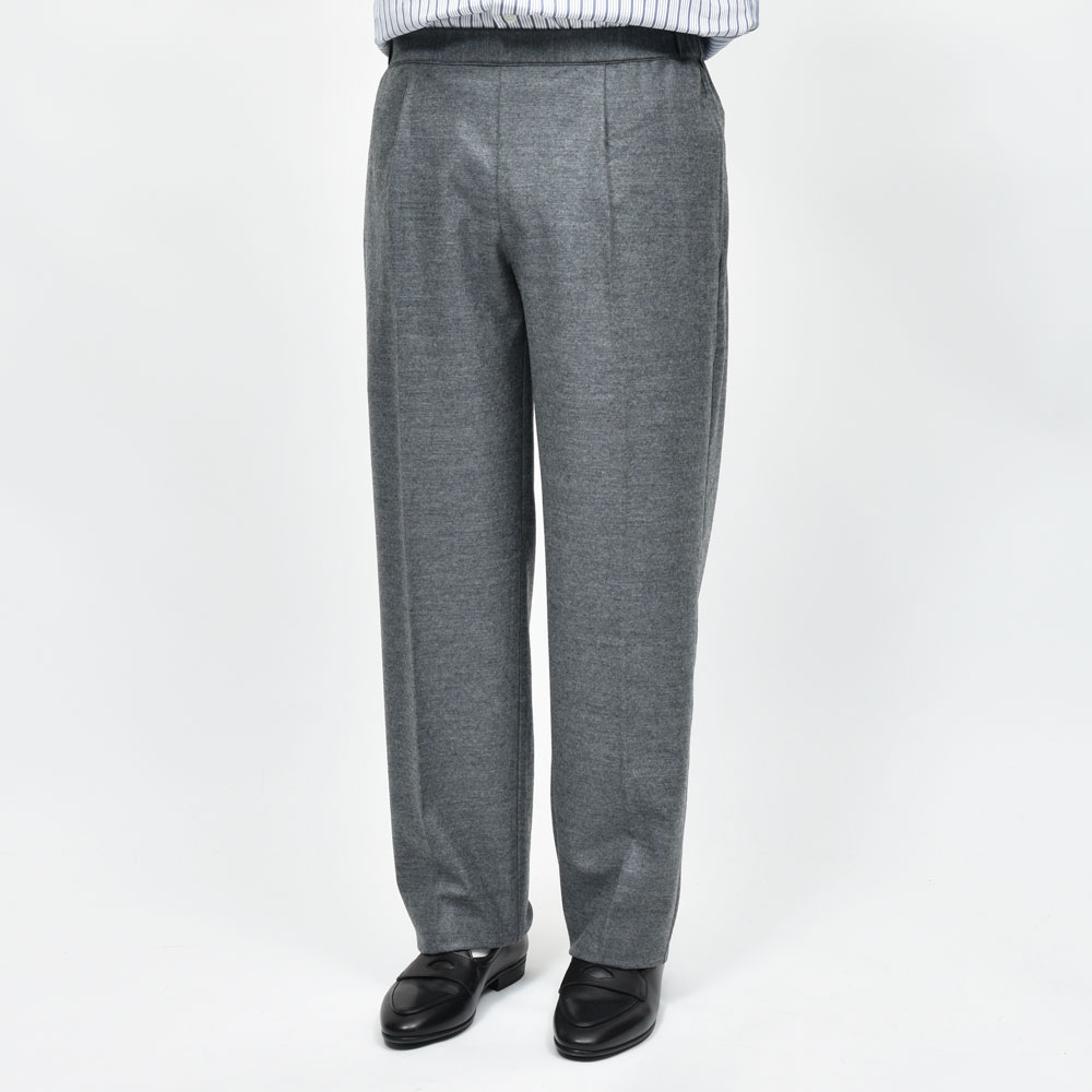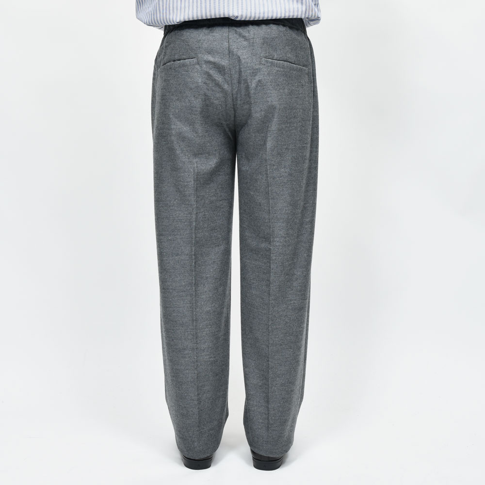 シルエットは緩やかなテーパード型になっていまして、どちらかというとストレートに近しい感覚でお使いいただける塩梅に。またウエストは1プリーツ、後ろ部分のみゴムを入れることによって穿き心地と見栄えの良さを両立した気の利きよう。