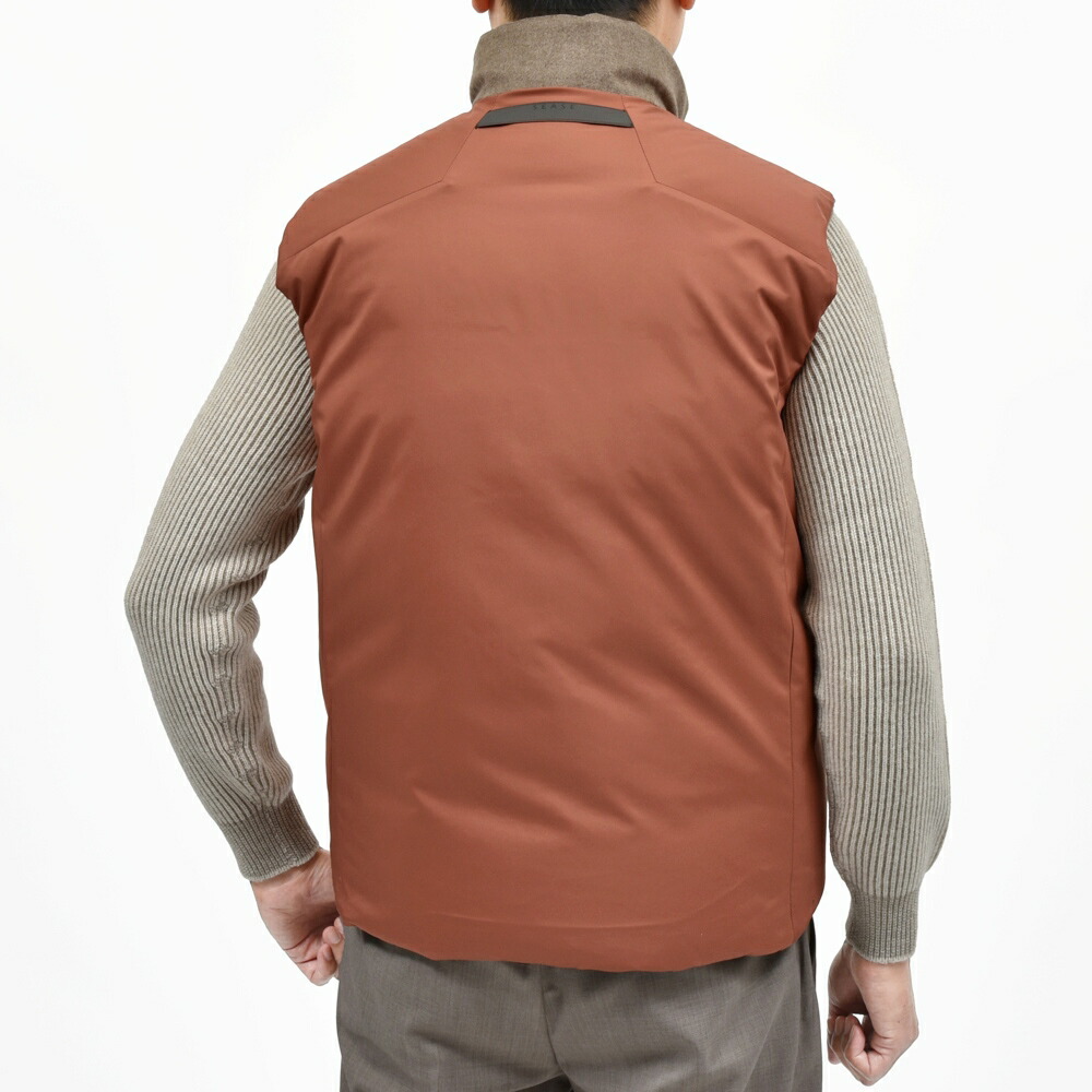 ソラーロは表に下糸のちらつきが出て玉虫状に見える生地になるんですが、このダウンベストはリバーシブルで、表にチラついているオレンジを裏地のポリエステルで表現しています。なので、実際に裏地を見ている様なイメージでリバーシブルベストとして着て頂けるというこだわりですね。