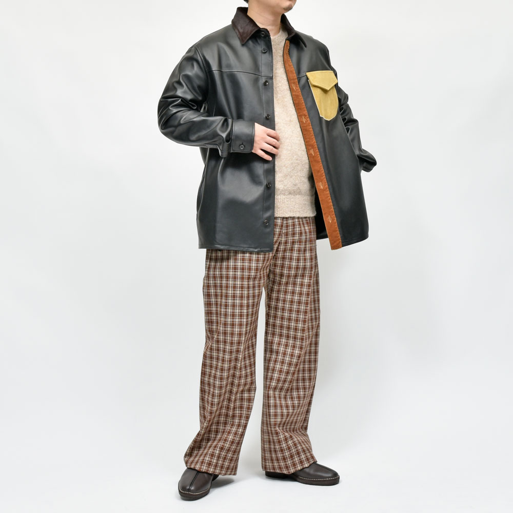 レザーシャツは素材使いで既に特徴的なのでシンプルにまとめるのがセオリーですが、そこに独自の味付けを施すことでオリジナリティある見え方になります。これは普通のブランドでは敬遠されるとは思うんですが、MARNIという長年培ってきた歴史がデザインに説得力を生み出し、ストレートに「良いな」と思わせる仕上がりになっています。