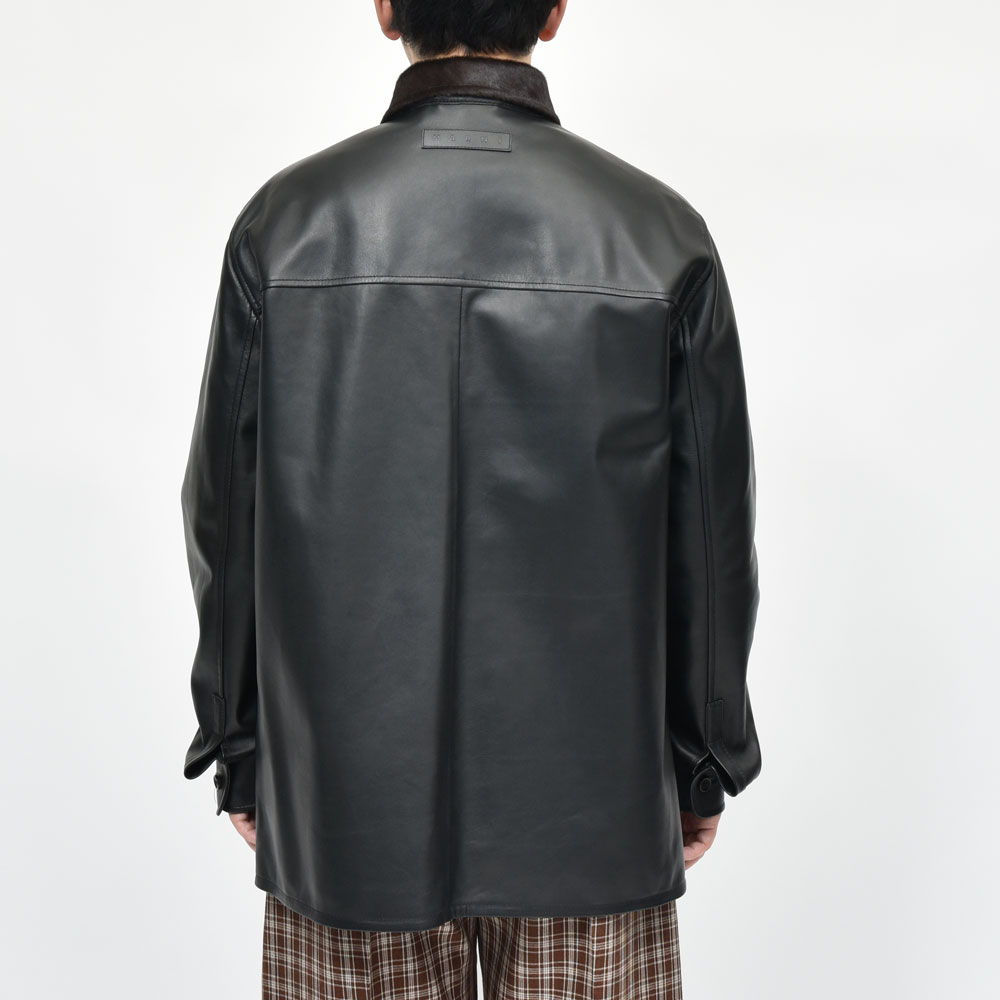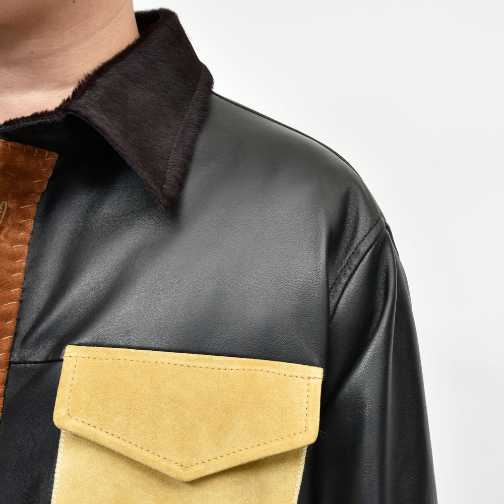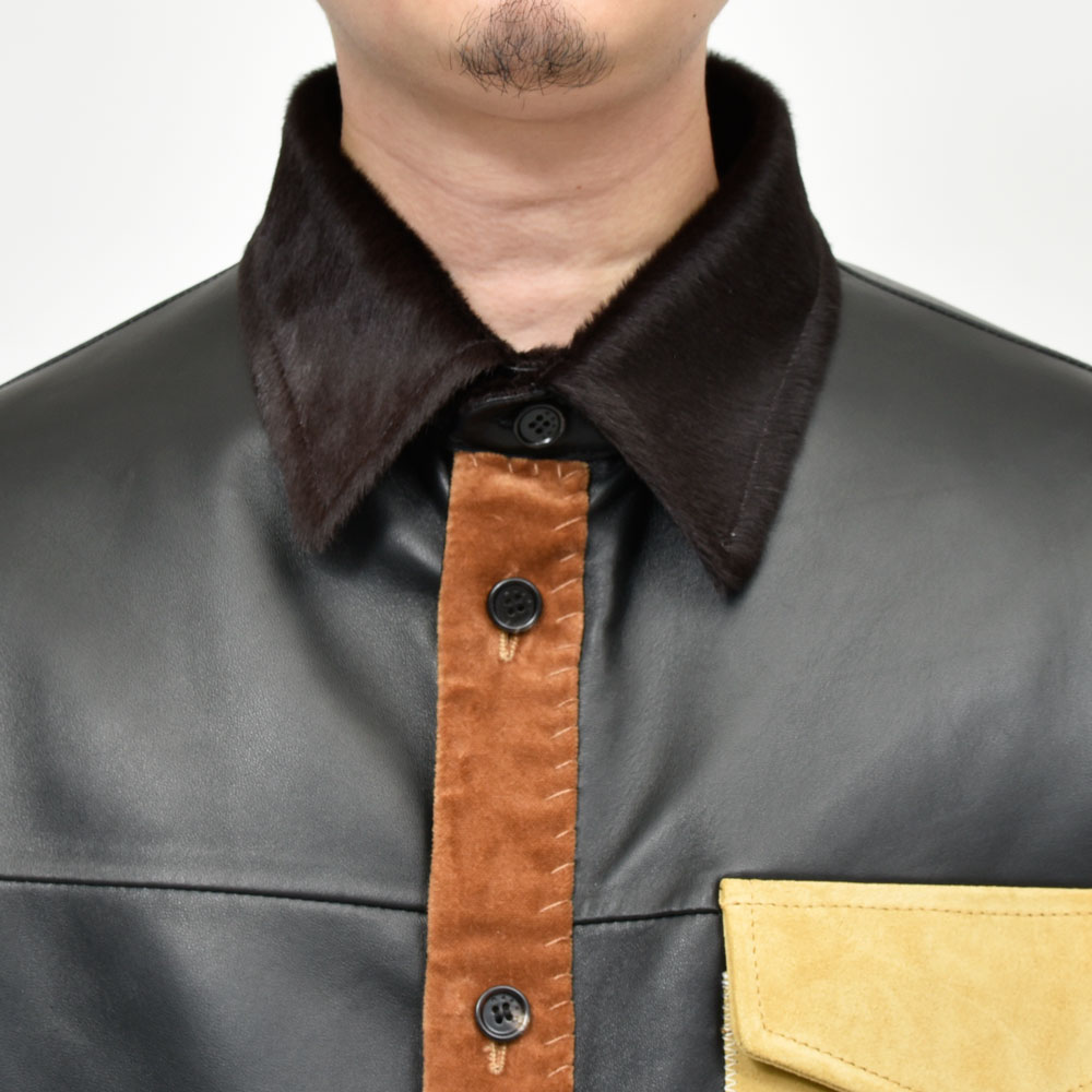 MARNI(マルニ)らしいエネルギッシュな一着でして、ブラックのレザーシャツをベースにデザインを効かせたものになっています。前立て部分の切り替え、フラップポケットは柔らかなクリームカラーに、また襟部分はハラコにすることで存在感のあるパワフルなアイテムにしています。