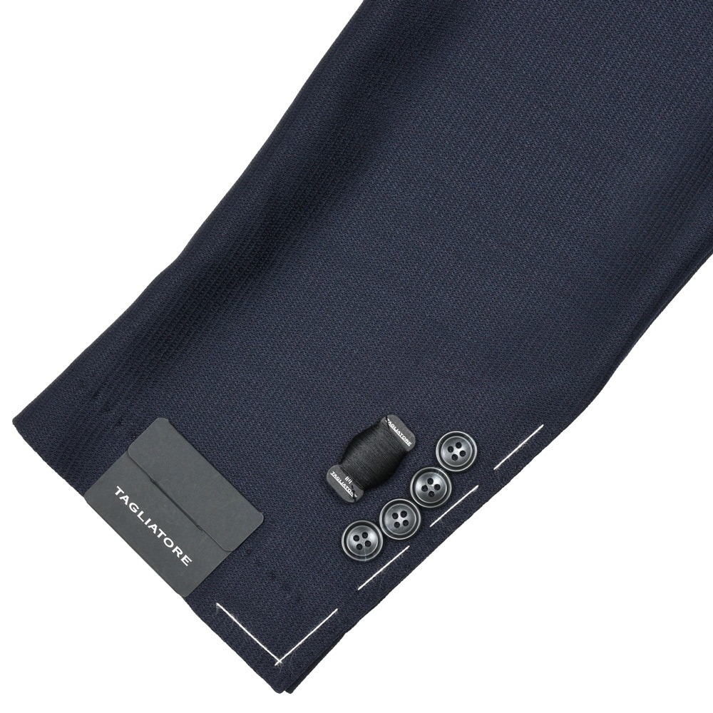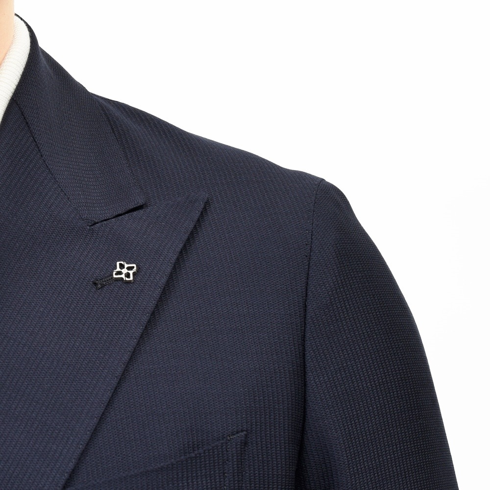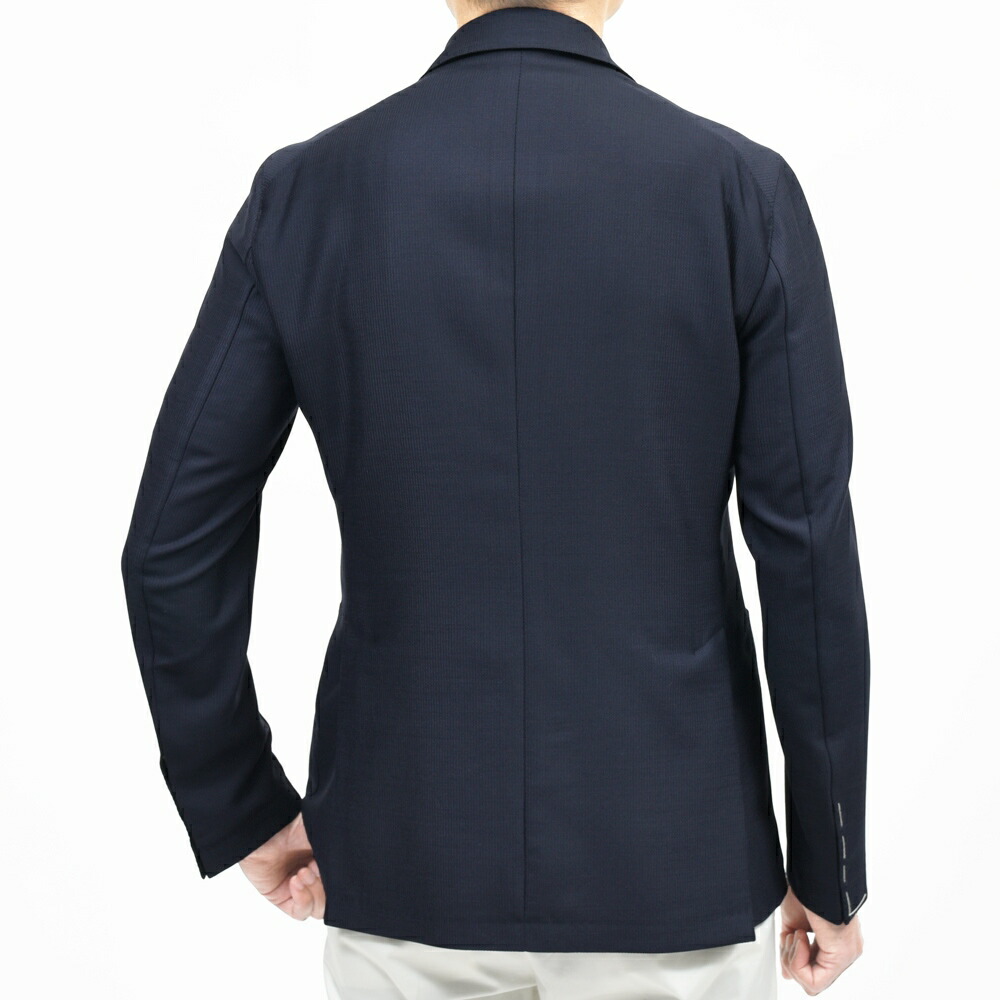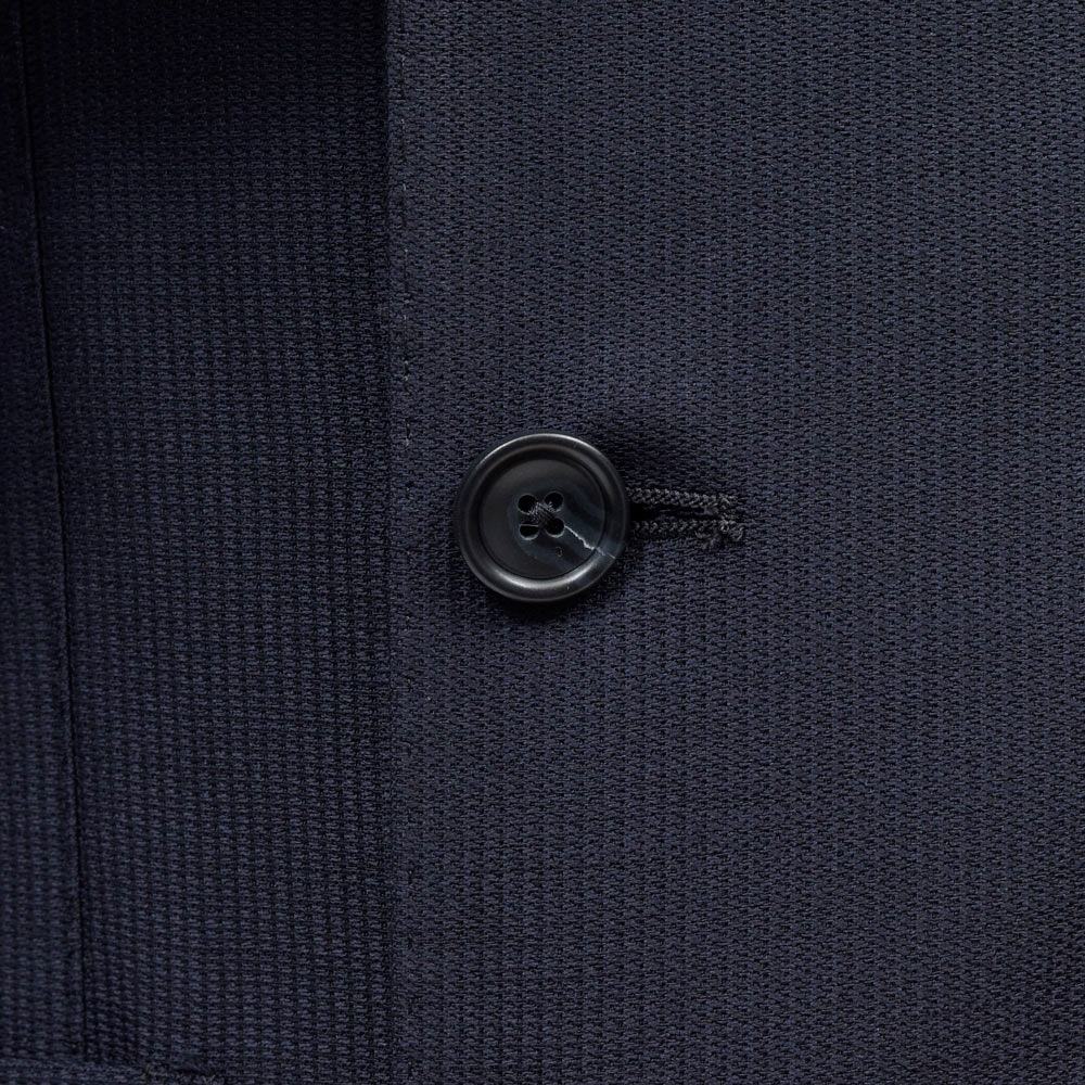 ネイビーが持つ奥行きや上品さ、端正さを直接的に表現しているような織り組織のソリッドファブリック、ジャガードの凹凸でストライプを表現したエレガントなタイプです。