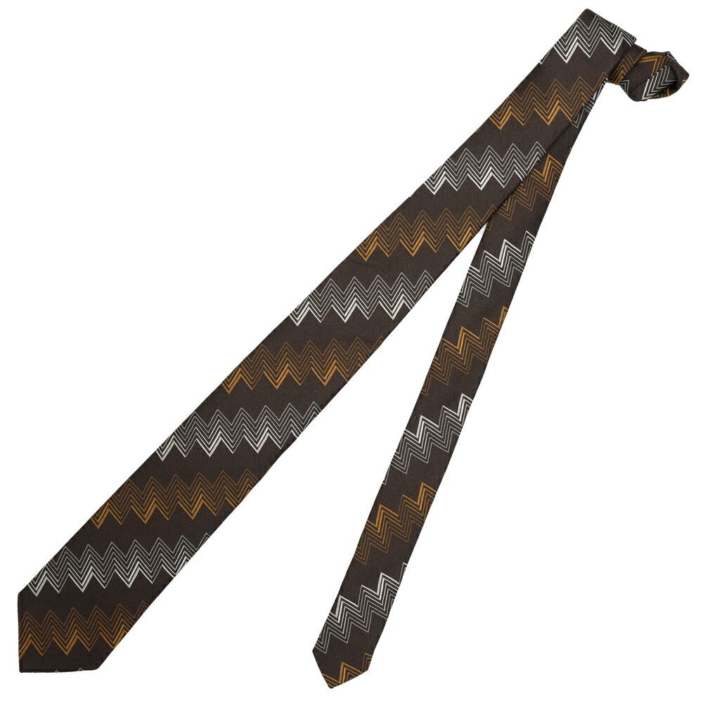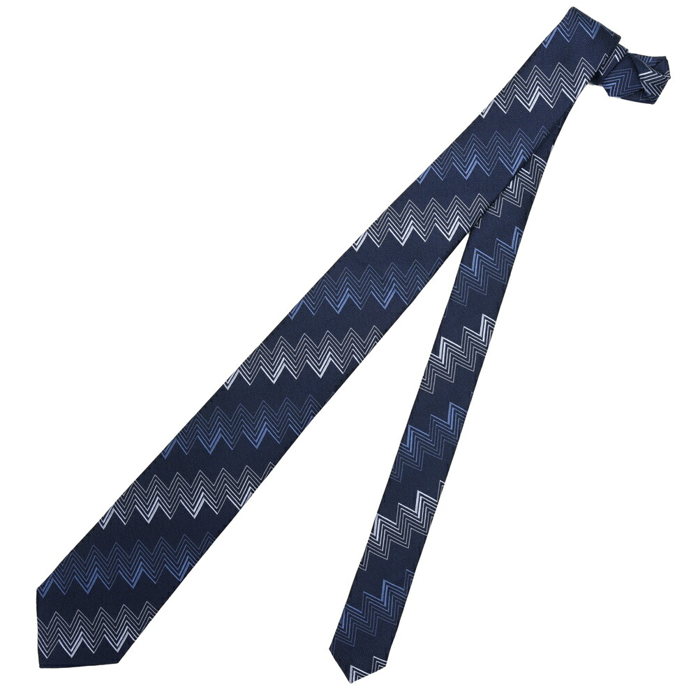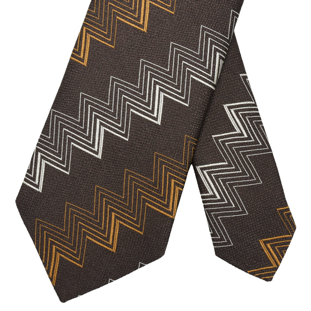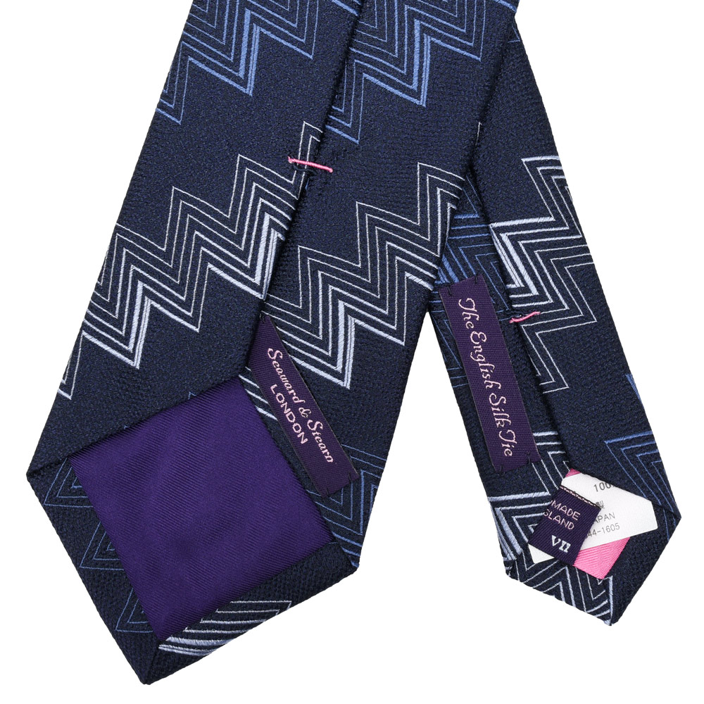 光沢を抑えすぎない上質なシルクに、ジオメトリックのジグザグ柄が織りで表現されており、近くで見るほど奥行きのある表情が感じられます。