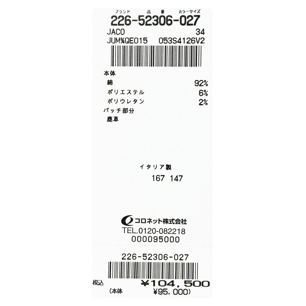 : 本体:コットン92% ポルエステル6% ポリウレタン2%パッチ部分:鹿革