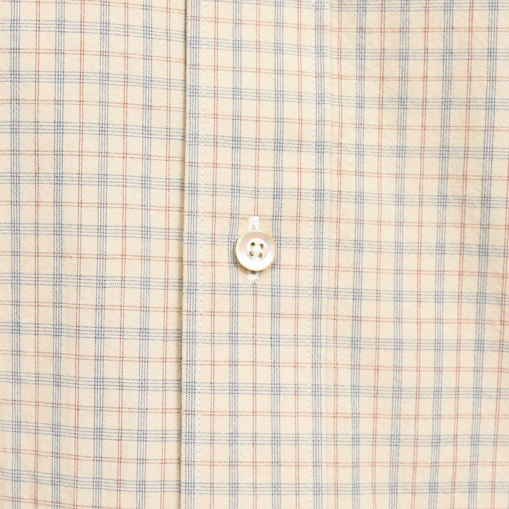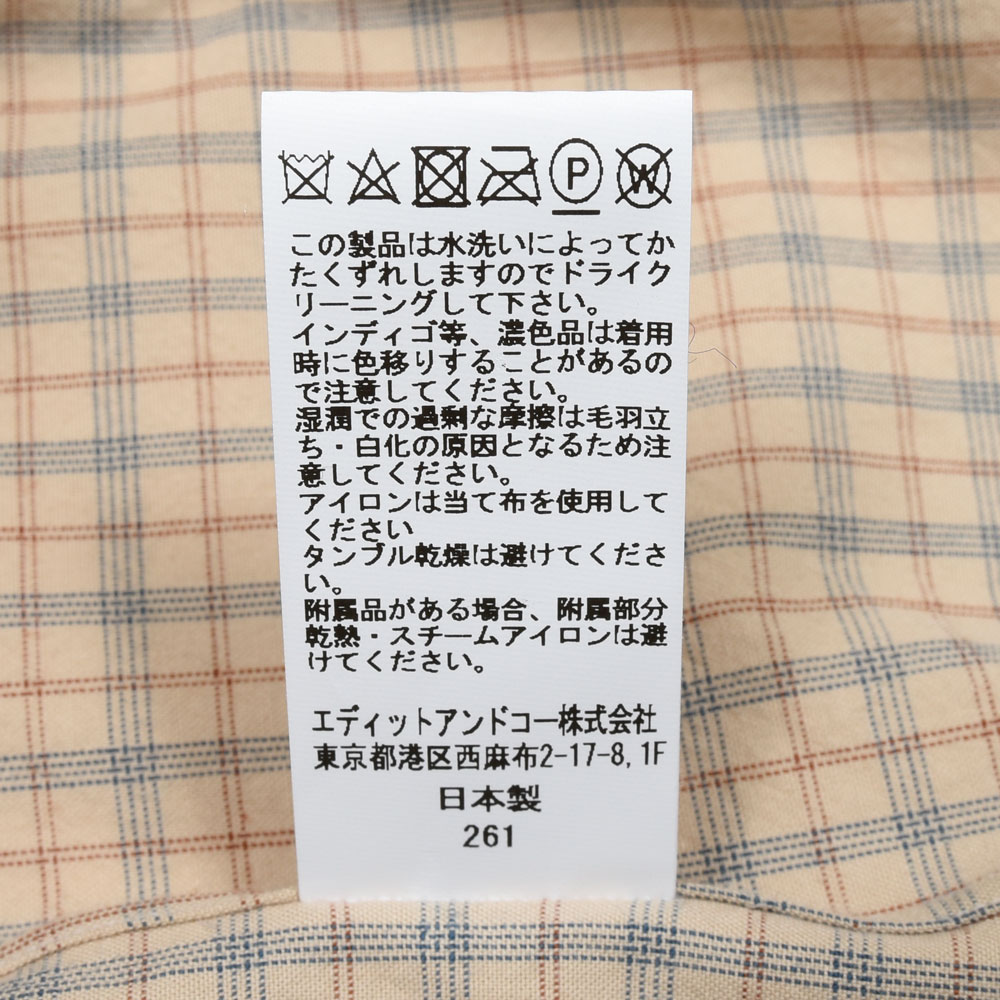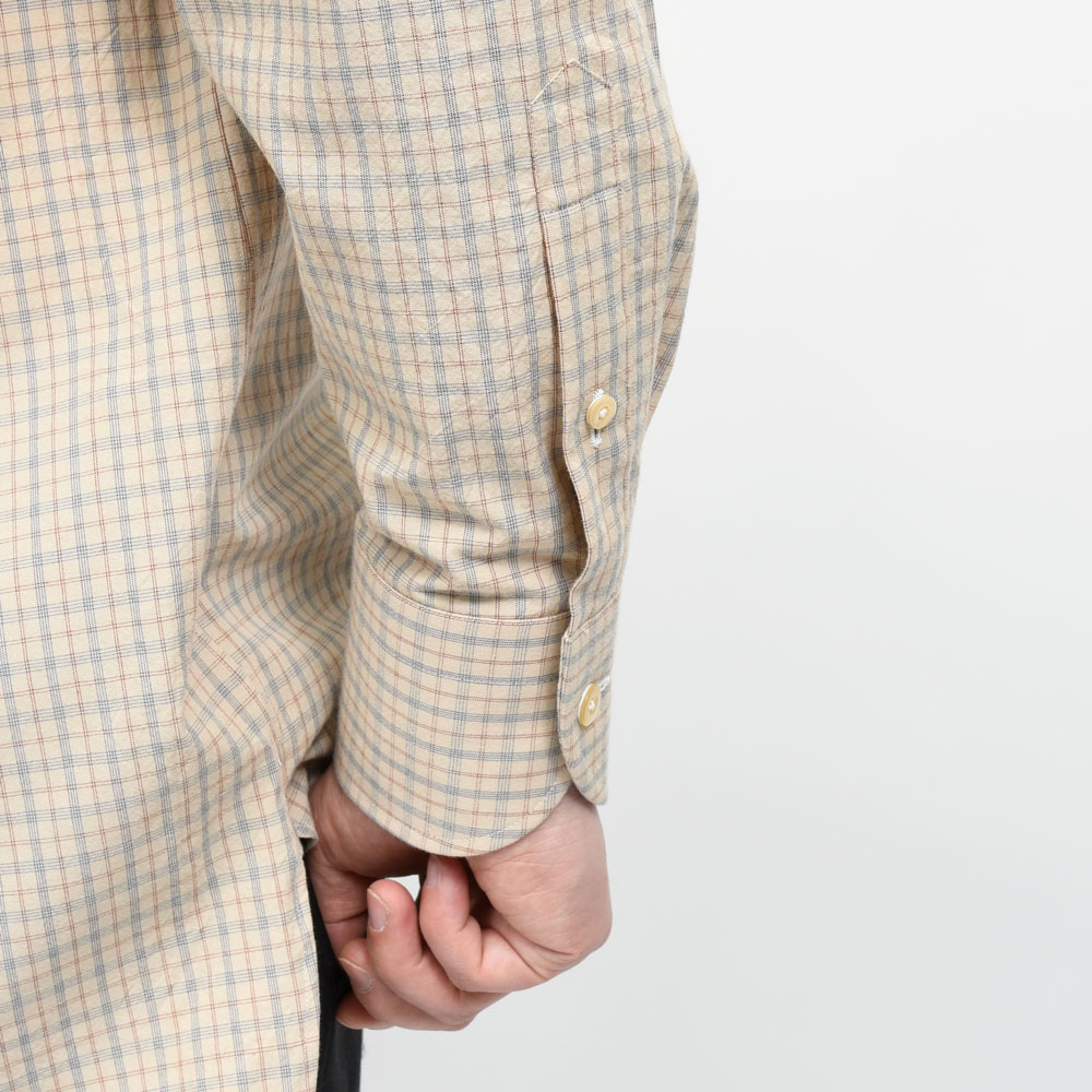 良い意味でパキッとした見え方ではなく、柔らかでマイルドな雰囲気を漂わせるシャツですね。クラシカルなデザインと、ほんのりヴィンテージ感のあるチェックパターン、でもニュアンスを感じさせる発色で、la favolaらしいセンスを感じます。