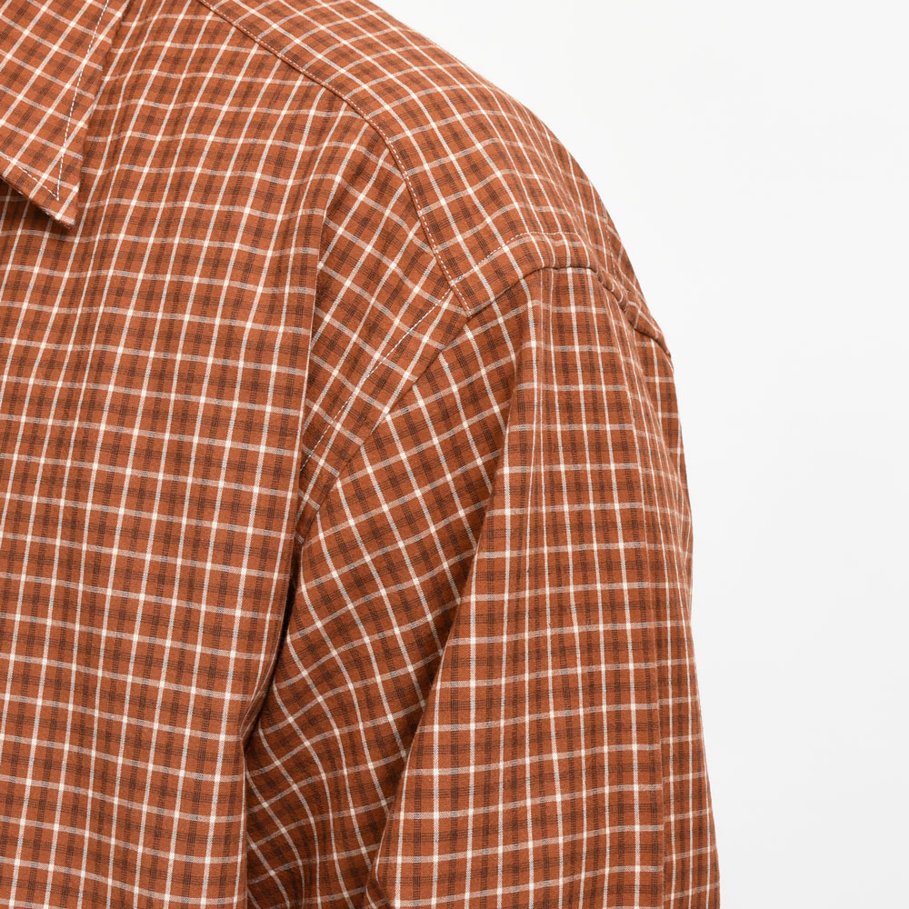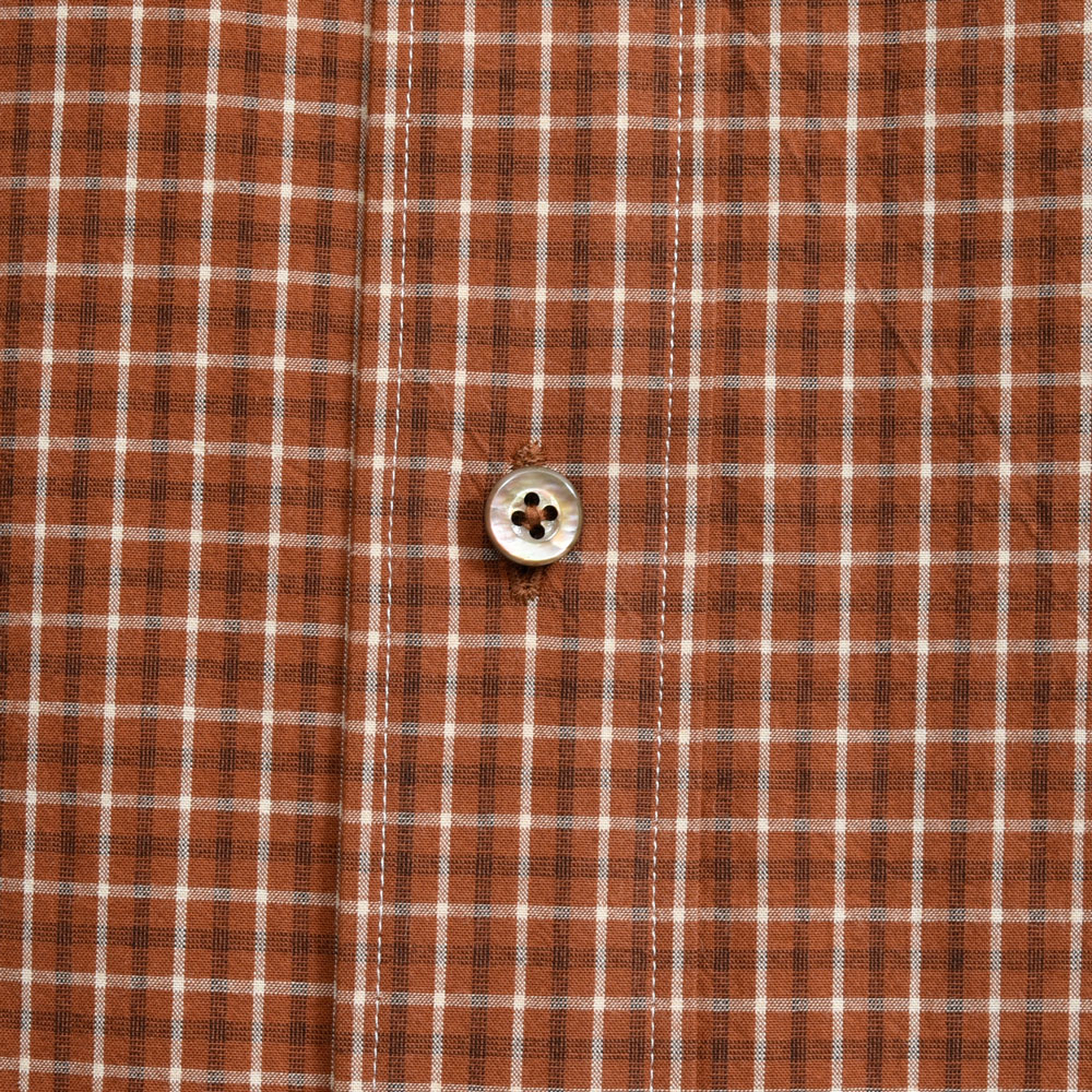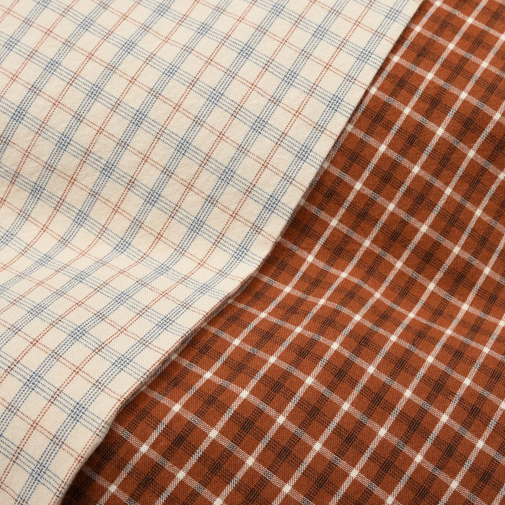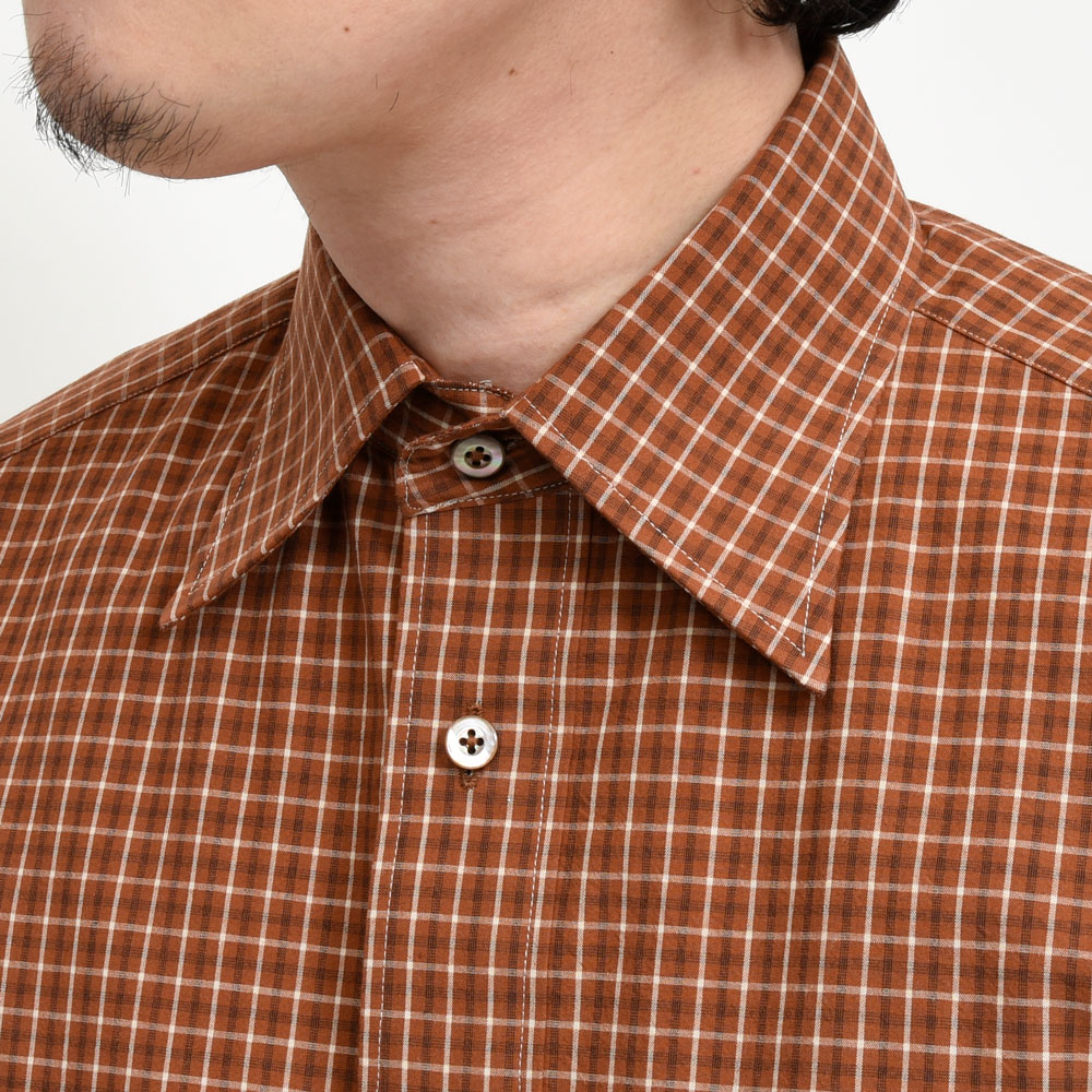 良い意味でパキッとした見え方ではなく、柔らかでマイルドな雰囲気を漂わせるシャツですね。クラシカルなデザインと、ほんのりヴィンテージ感のあるチェックパターン、でもニュアンスを感じさせる発色で、la favolaらしいセンスを感じます。