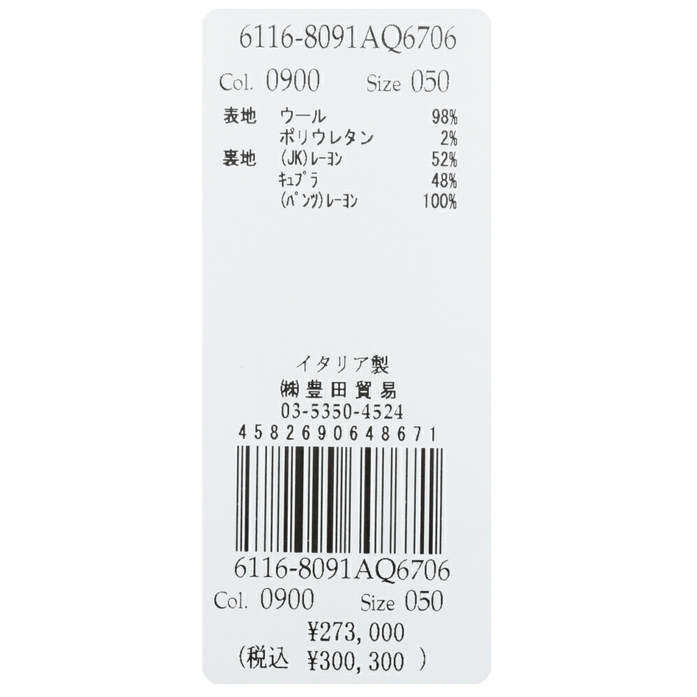 : 表地:ウール98% ポリウレタン2%ジャケット裏地:レーヨン52% キュプラ48%パンツ裏地:レーヨン100%