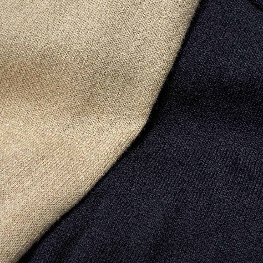 シルエットは比較的スマートなタイプになっていまして、一枚着としてもジャケットやブルゾンのインナーとしても活躍してくれる汎用性の高さも持っています。ネックにデザイン性がありつつも馴染みやすい、そんな絶妙なバランス感覚を持った一着になっています。