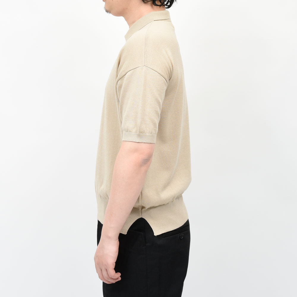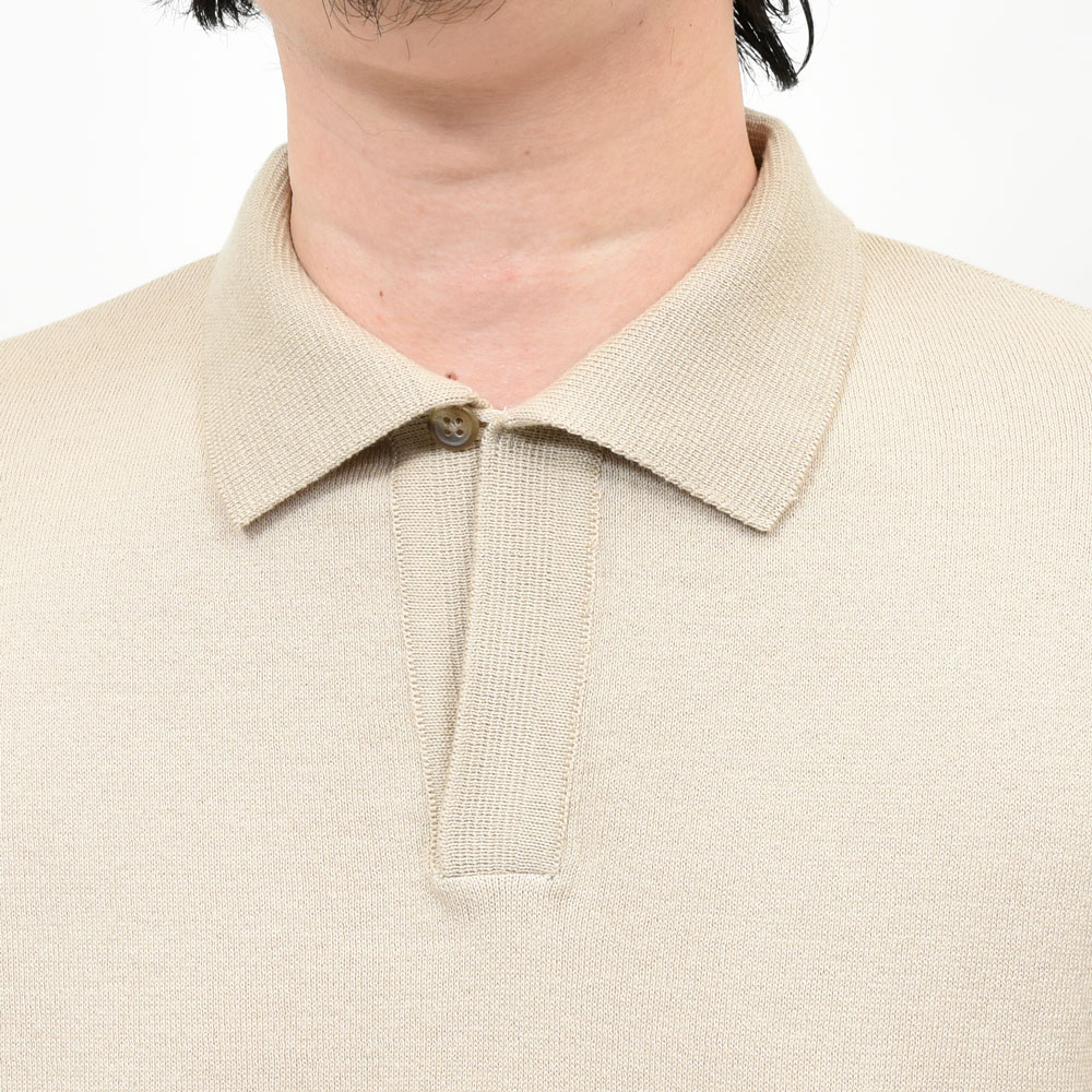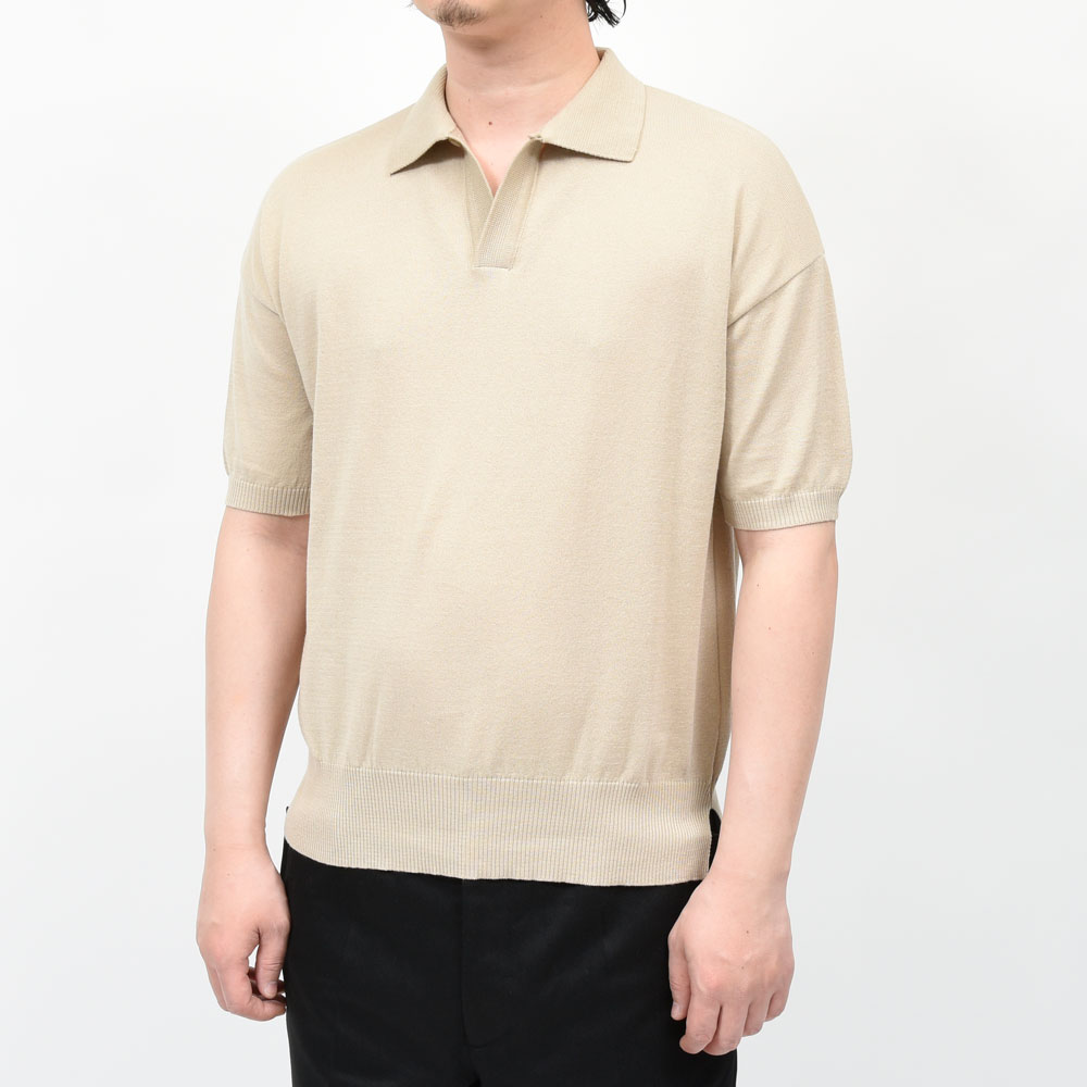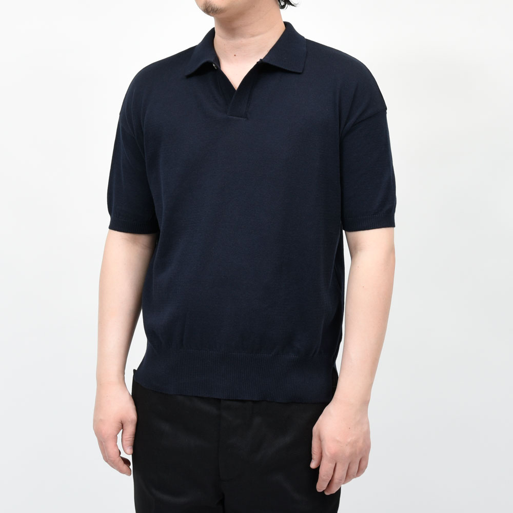 ma'ry'ya(マリア)のニットポロ、ボタンが付いていますがデザイン的などちらかというとスキッパー的なノリのタイプかと。いわゆるクラシックなタイプではなく、あくまでも同ブランドのフィルターを通して作られた一着となっています。