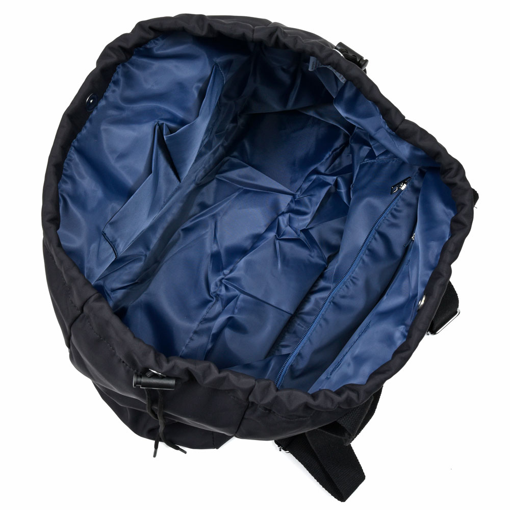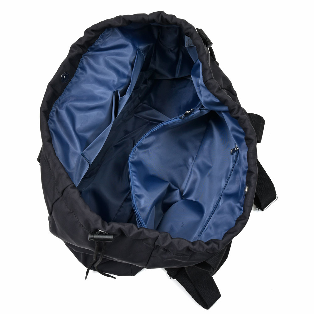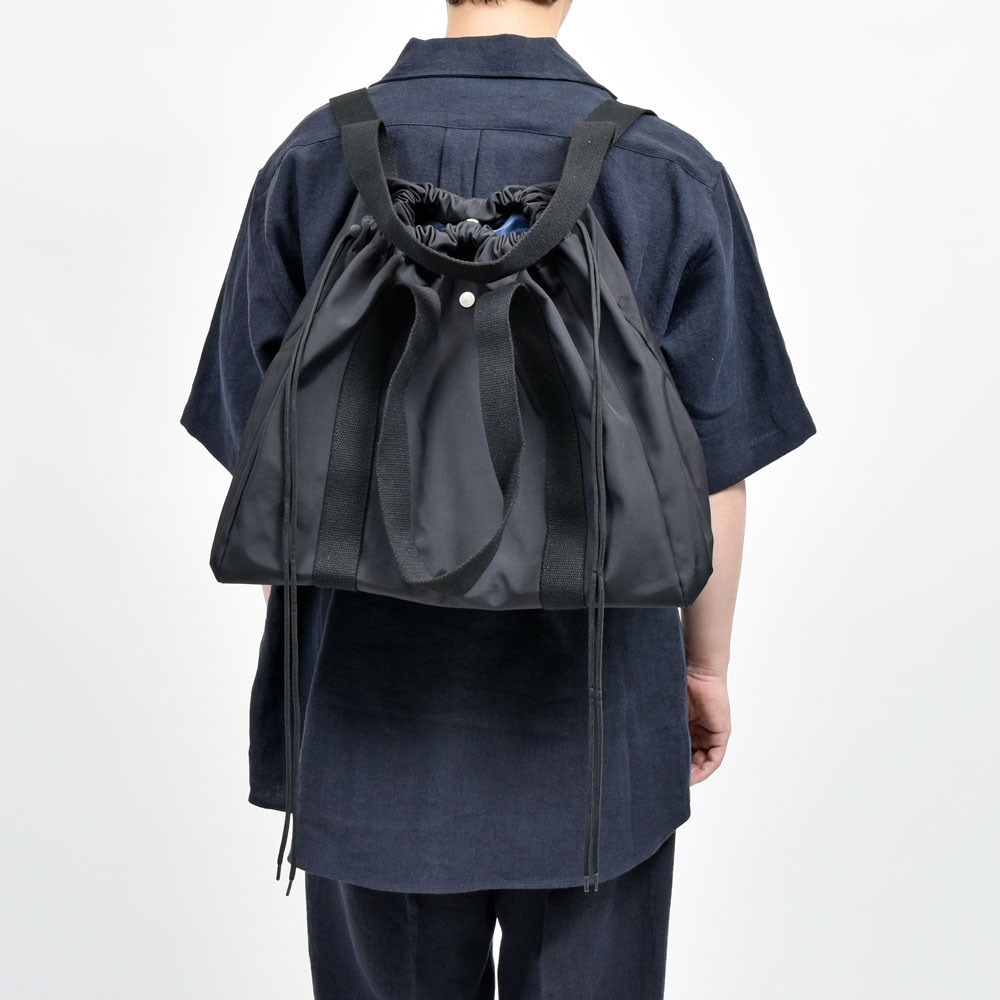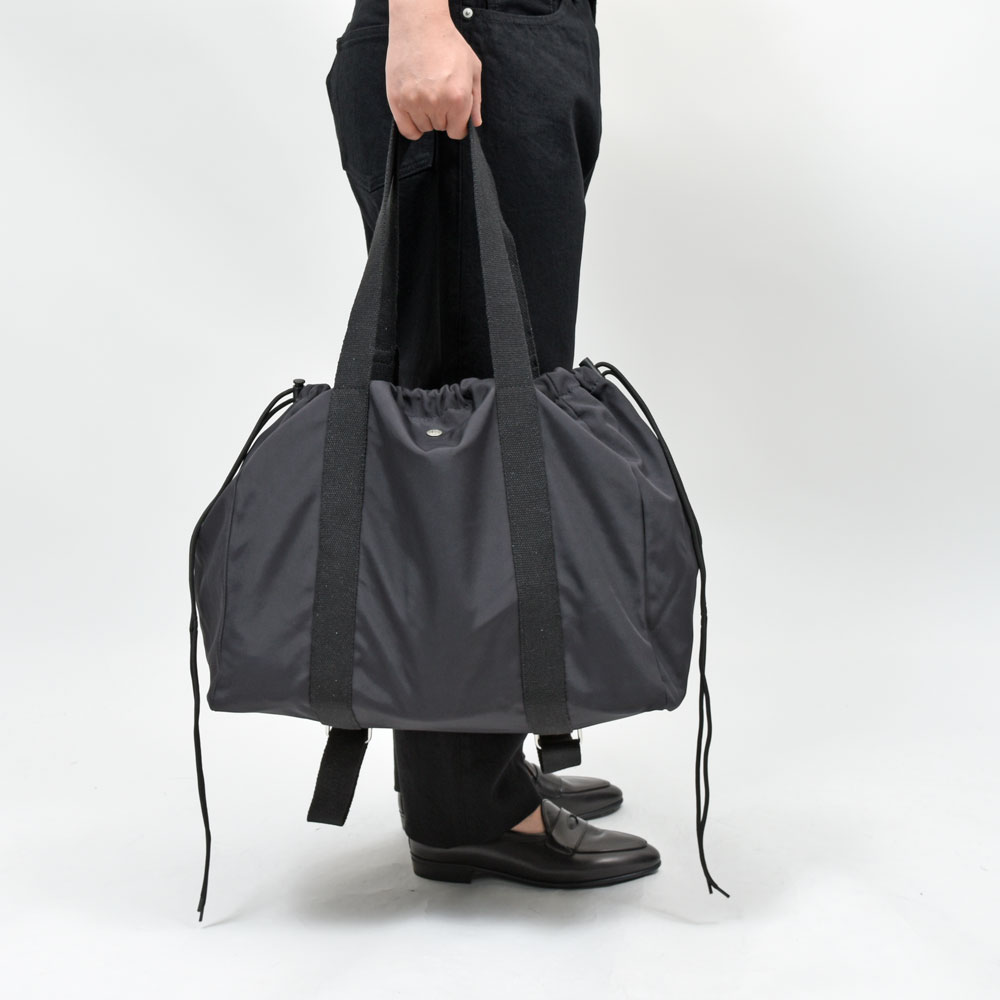 シルエットはスクエア型になっていまして、開口部にはドローコードを装備、またトートだけでなくバックパック用のショルダーも付属しているので2WAYでお使いいただけます。