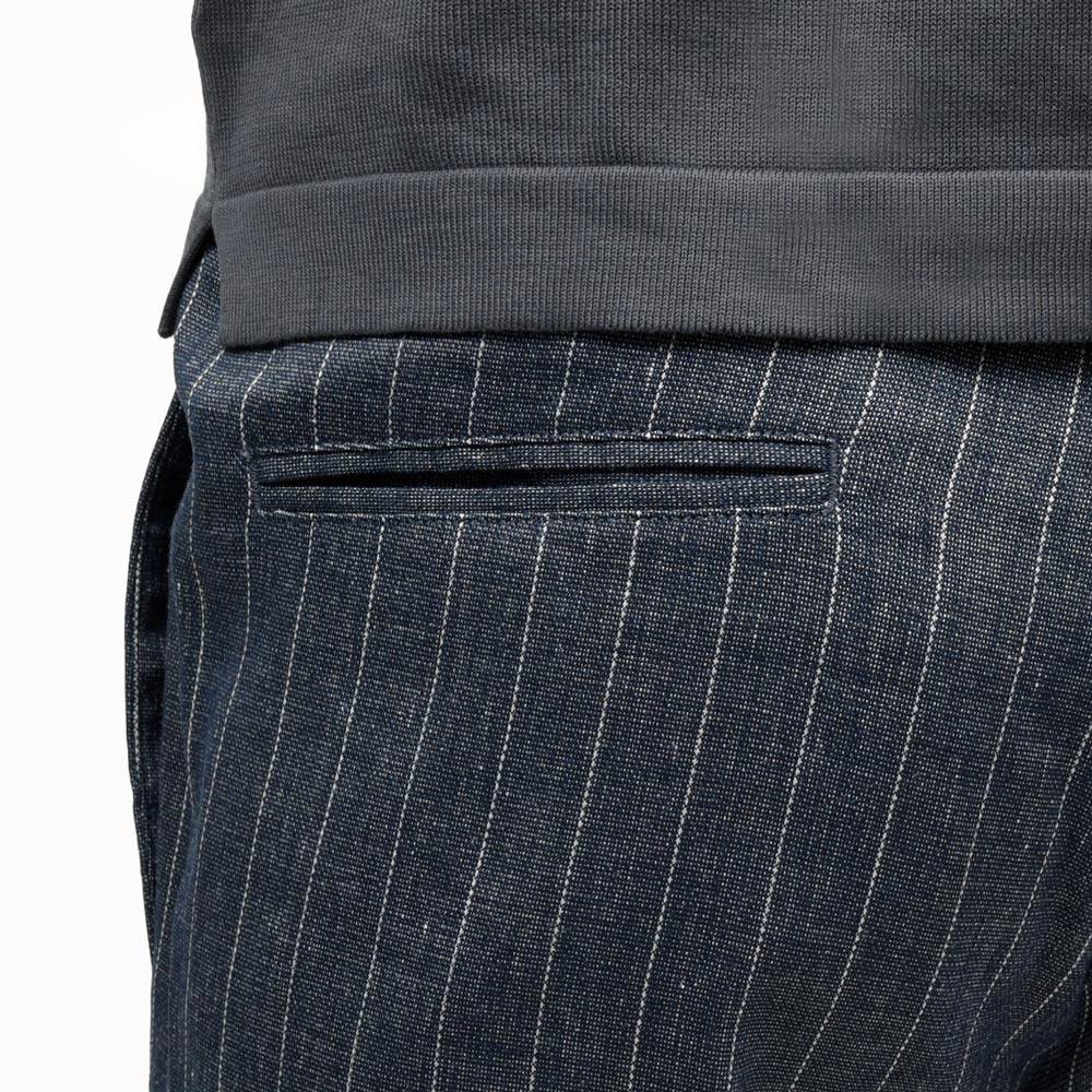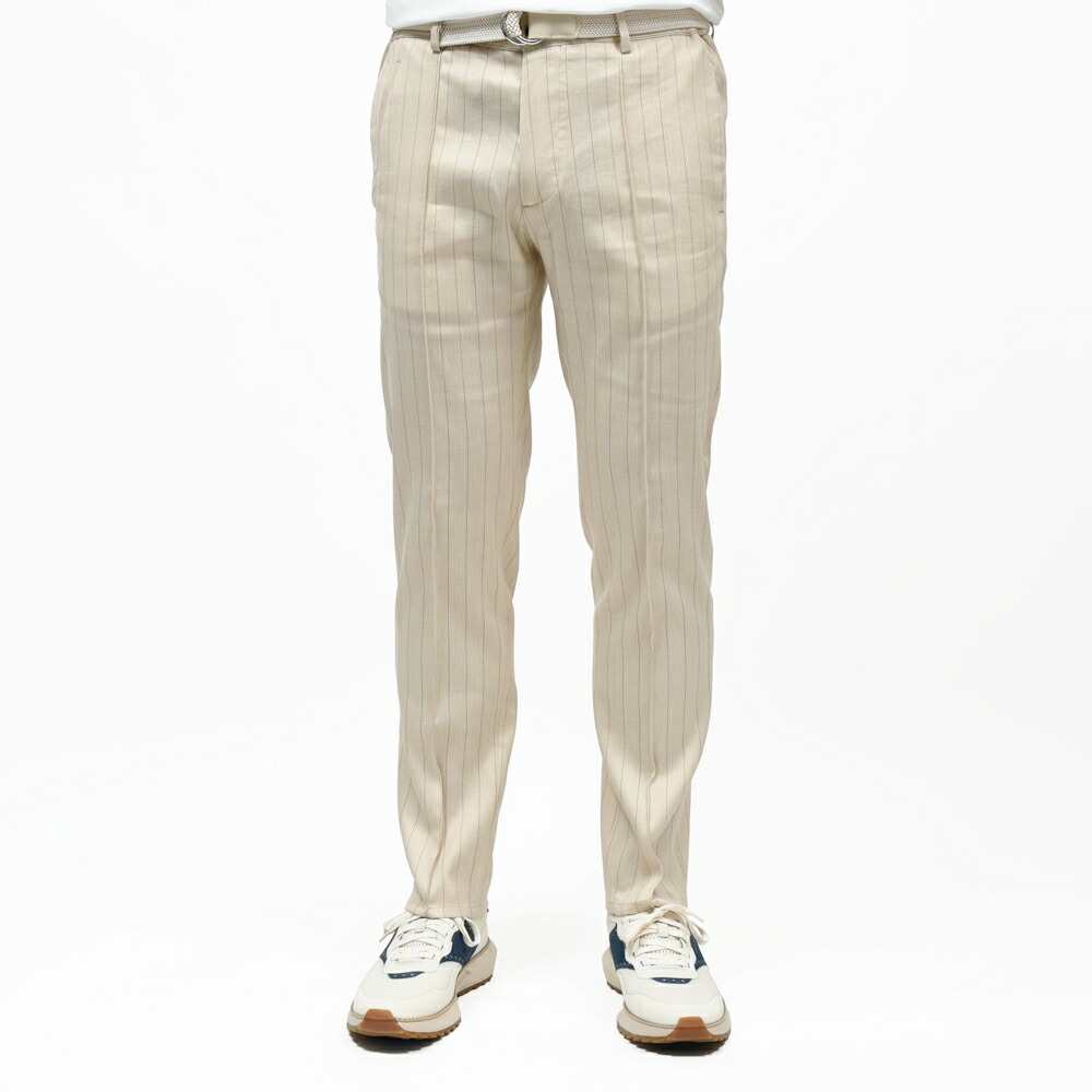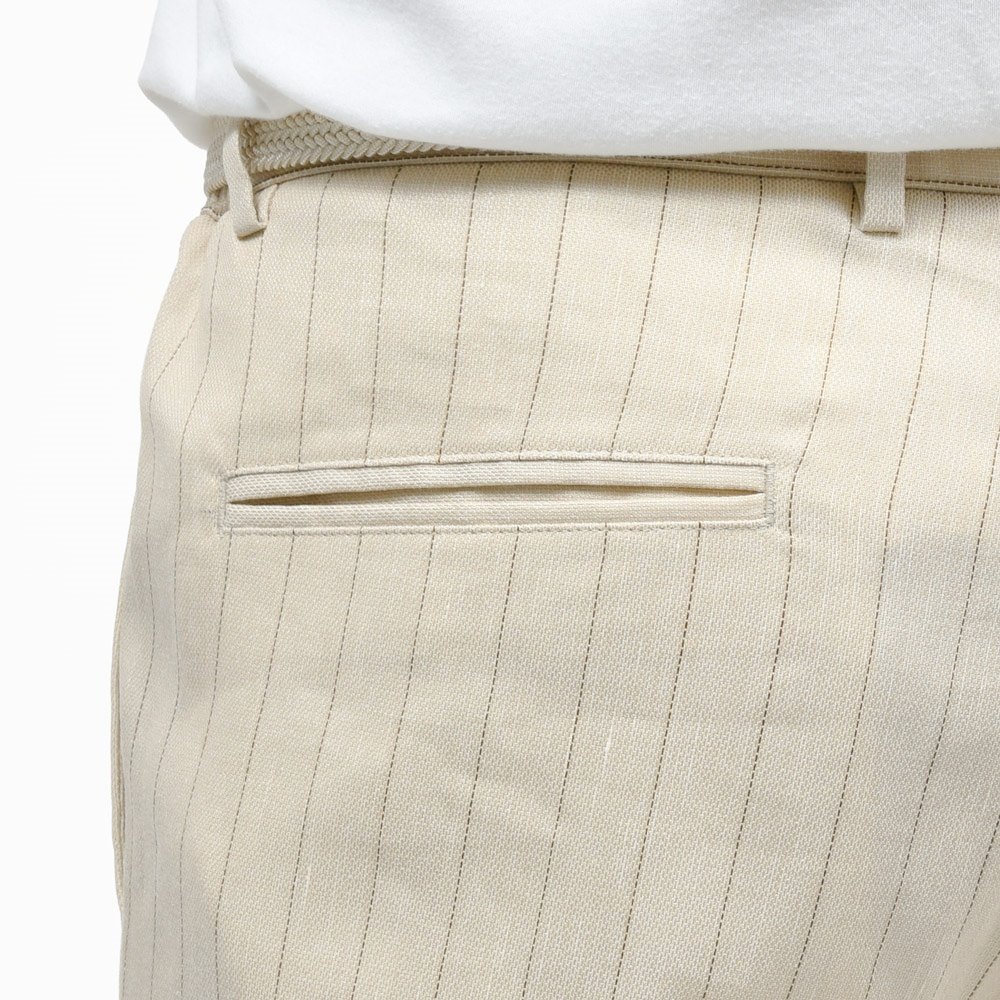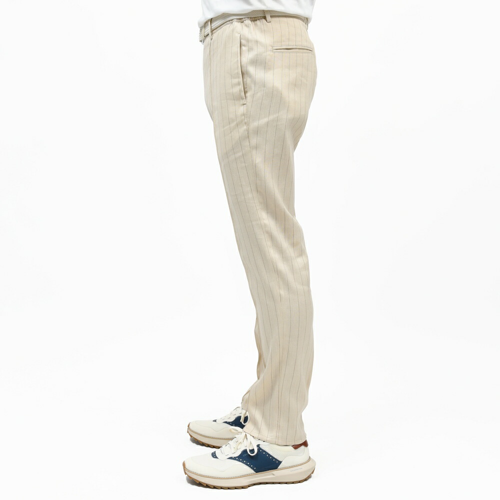 リネン調の清涼感あるタッチやスラブ感と、ストレッチの効いた穿き心地の良さ、イタリアらしい色気のある発色とストライプのバランスが秀逸で、ゴルフ場のみならずタウンユースでも使って頂きやすいモデルですね。