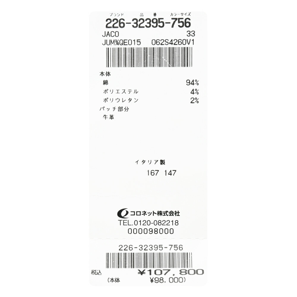 : 本体:コットン94% ポリエステル4% ポリウレタン2%パッチ部分:牛革