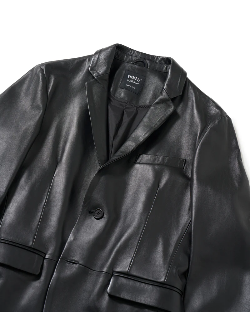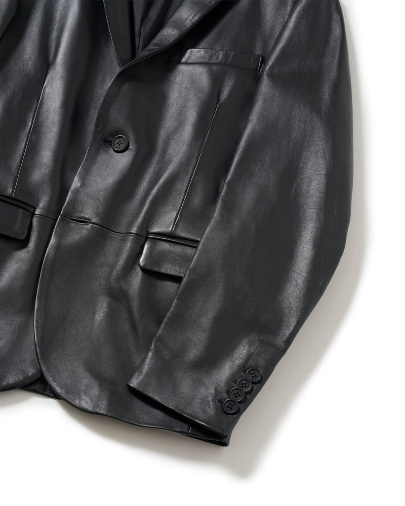 ラペル(襟)幅をあえて細身のナローラペルに設定し、全体をスリムなフィッティングバランスで構築することで、従来のレザージャケットに見られる無骨さを抑え、都会的なシルエットを形成しています。