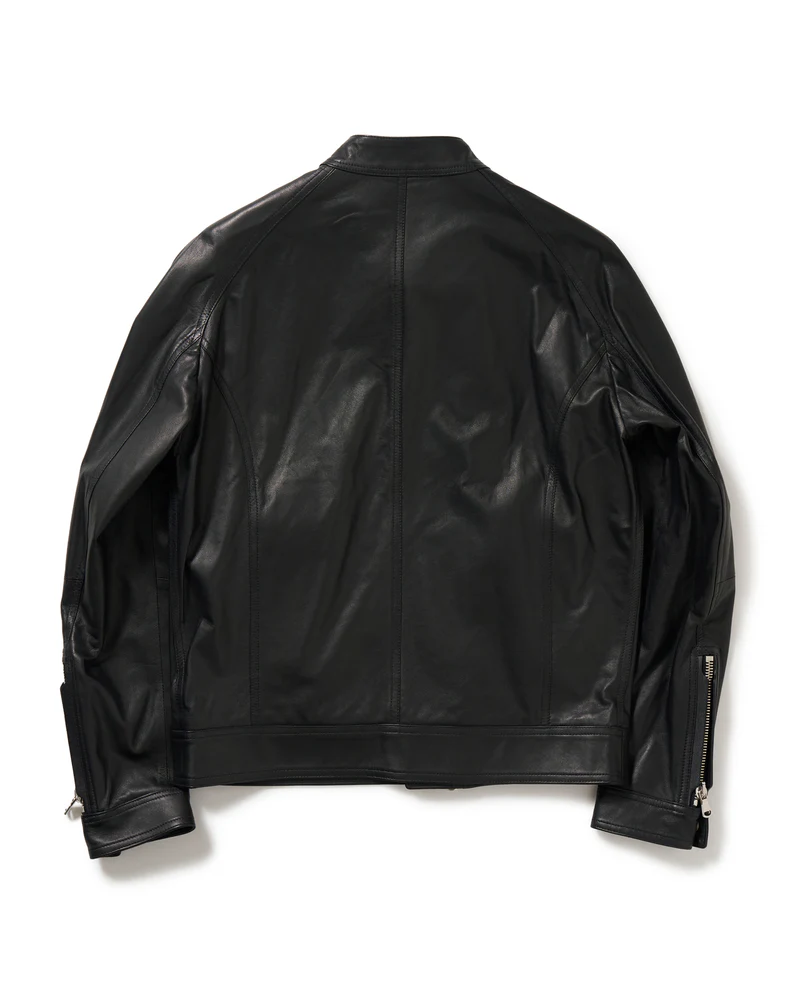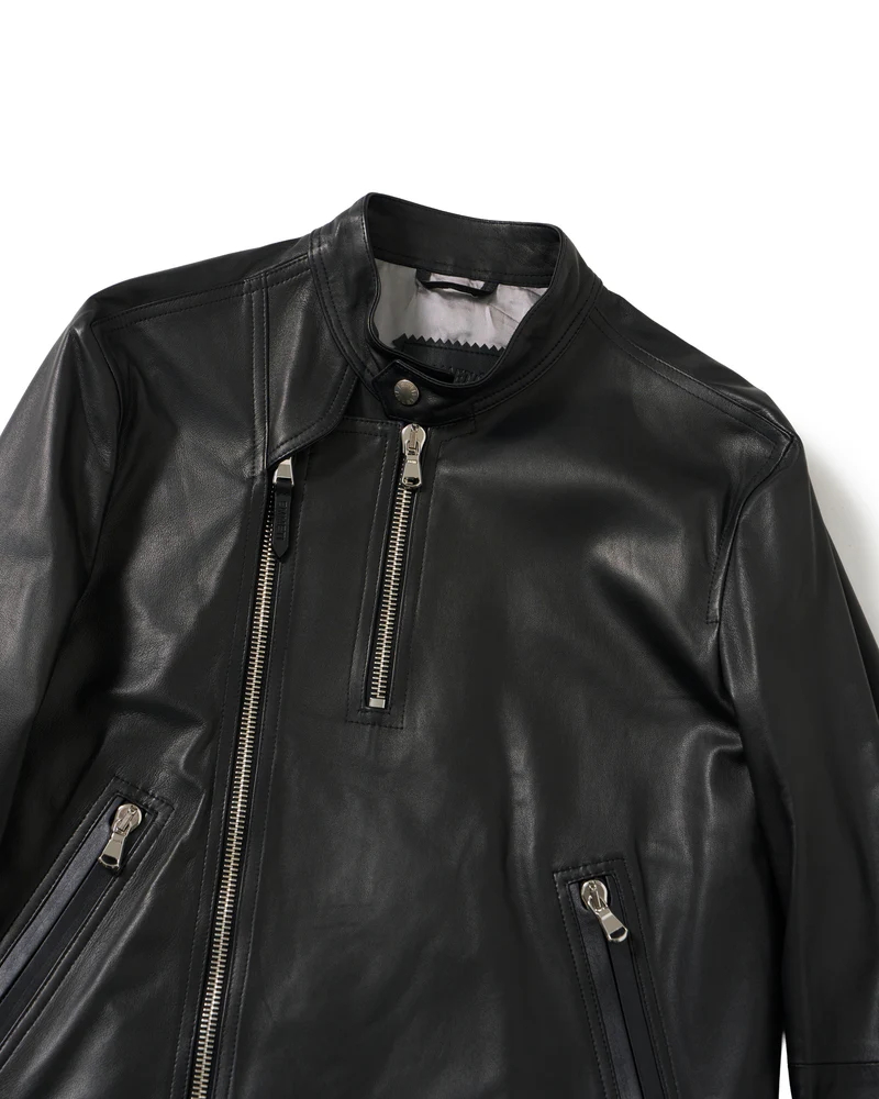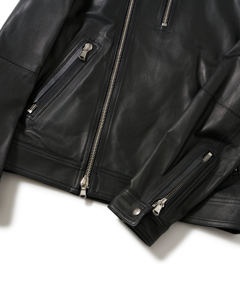 モーターサイクルジャケットをベースに、フロントはダブル、襟はスタンドカラーと、ジップの開閉によって表情が変わる、ミニマルにも、力強くも着こなせる設計です。