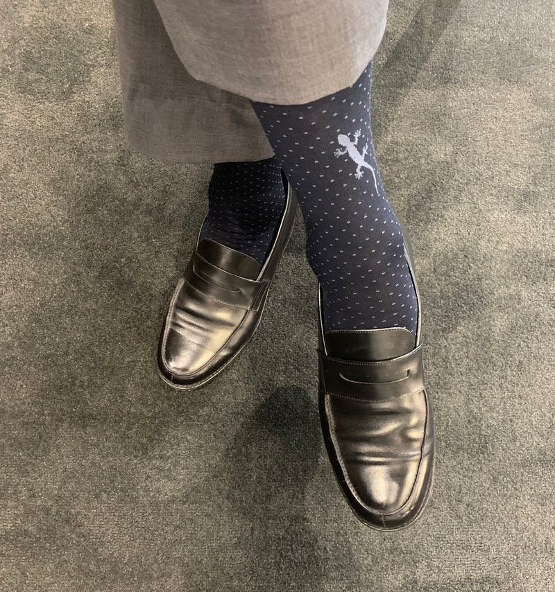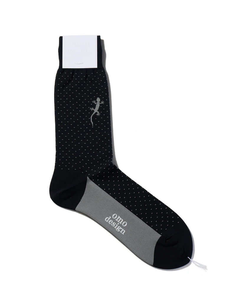 プレーンなピンドットソックスの片足にトカゲ(幸運のモチーフ)が歩いているユニークなデザイン。