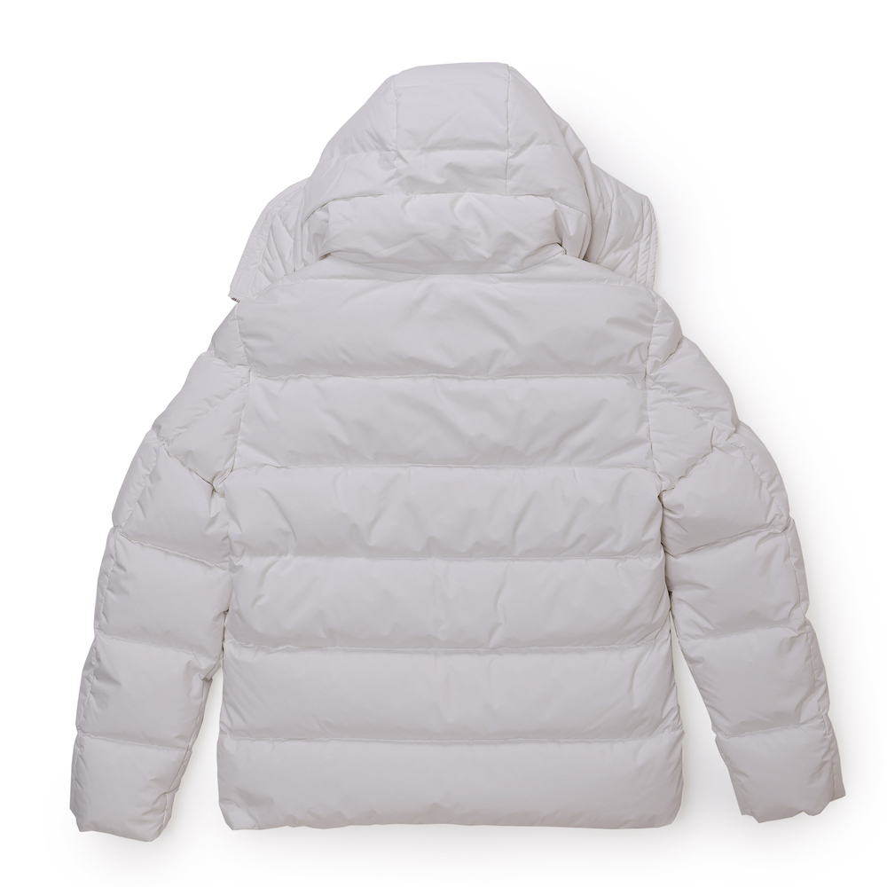 ワイドなブーダンキルティングにグースダウンを詰めたマットファブリックと、ディテールが軽いコントラストを生み出しています。ダブルフード仕様で、外側は固定、光沢のある同系色の素材で仕上げたライナーのフードは、ファスナーで取り外しできます。フロントのファスナーとコンシールボタンで開閉します。ウエストの高さに便利なサイドポケット。内側には、貴重品を入れるための内ポケット2つとロゴ入りリボンのディテールをあしらっています。