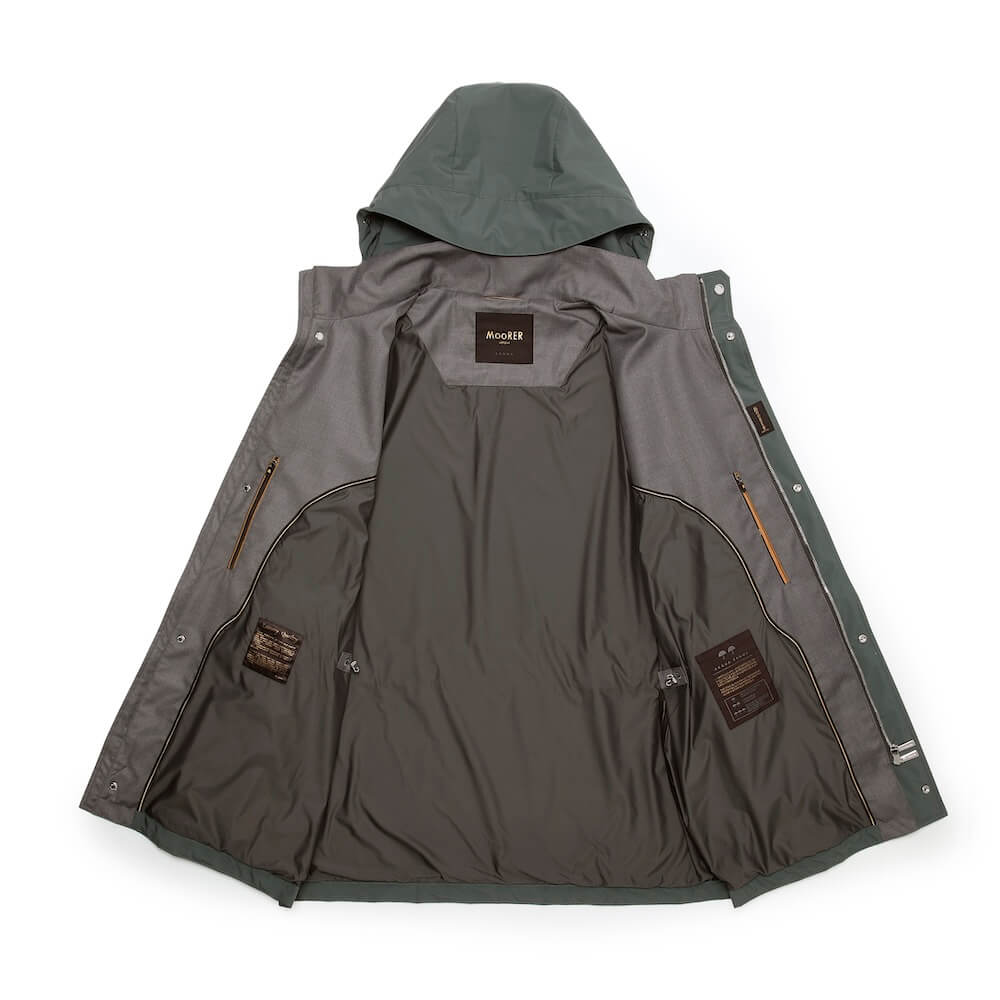 軽量なテクニカルファブリックに防水メンブレンを組み合わせることで、高いプロテクション性能と軽やかな着心地を両立しています。都会的な佇まいの中に、MooRERならではの精緻な機能美が息づきます。