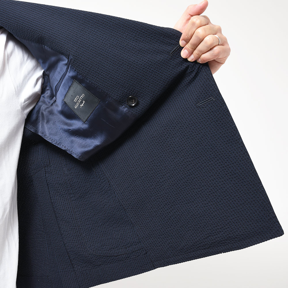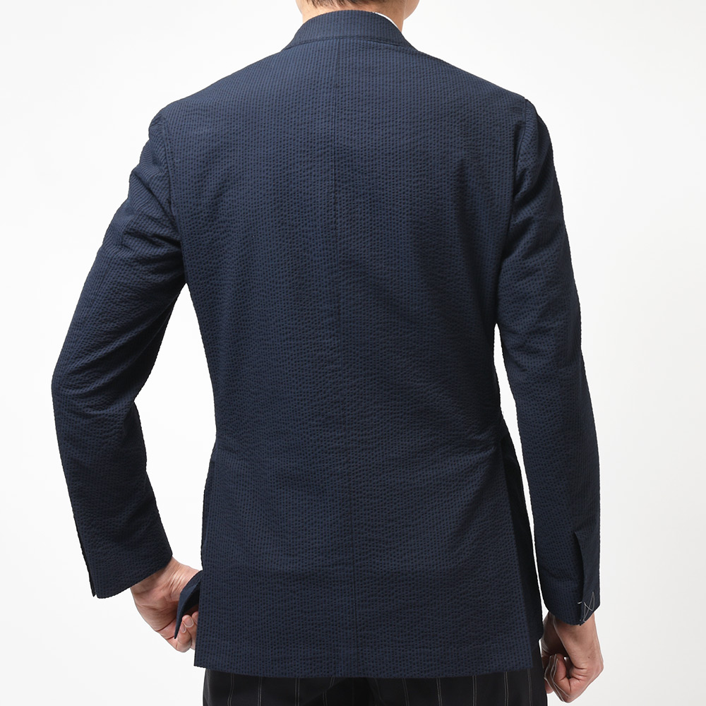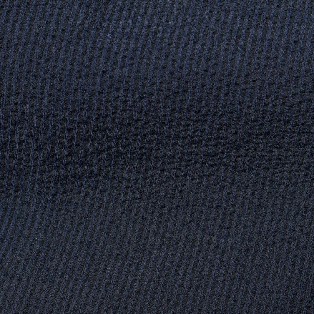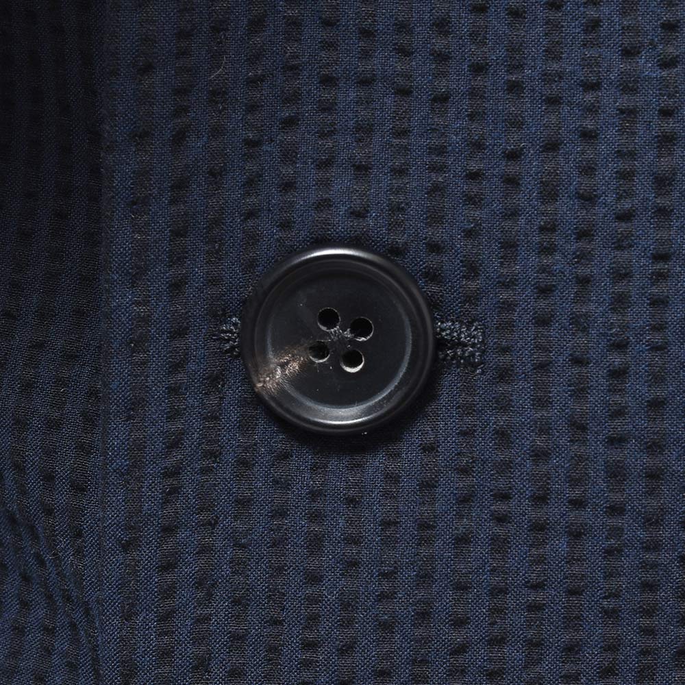 目付け250gのコットン素材のシアサッカー生地は、シアサッカー特有の凹凸感が清涼感を生んでいます。こちらは夏らしい柄のストライプではありますが、ネイビーとダークネイビーの色使いによって、遠目では無地っぽく感じられるシックな佇まいとなっています。