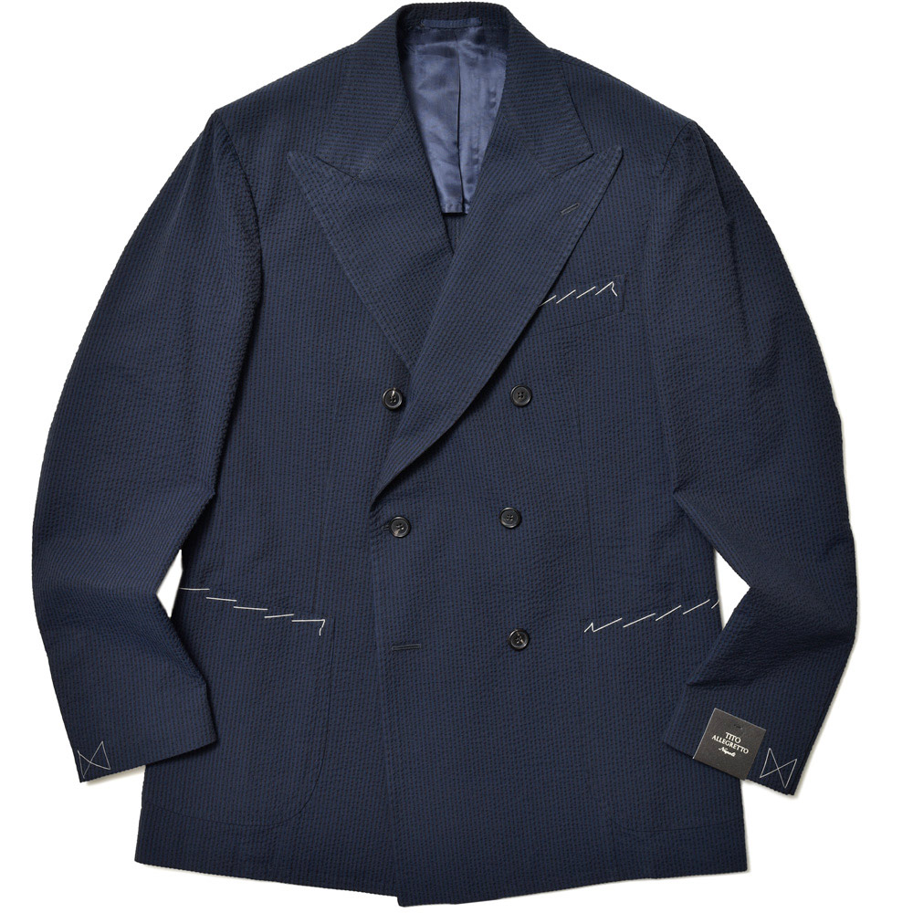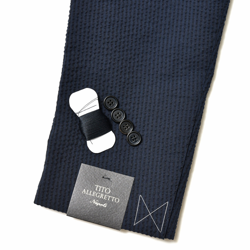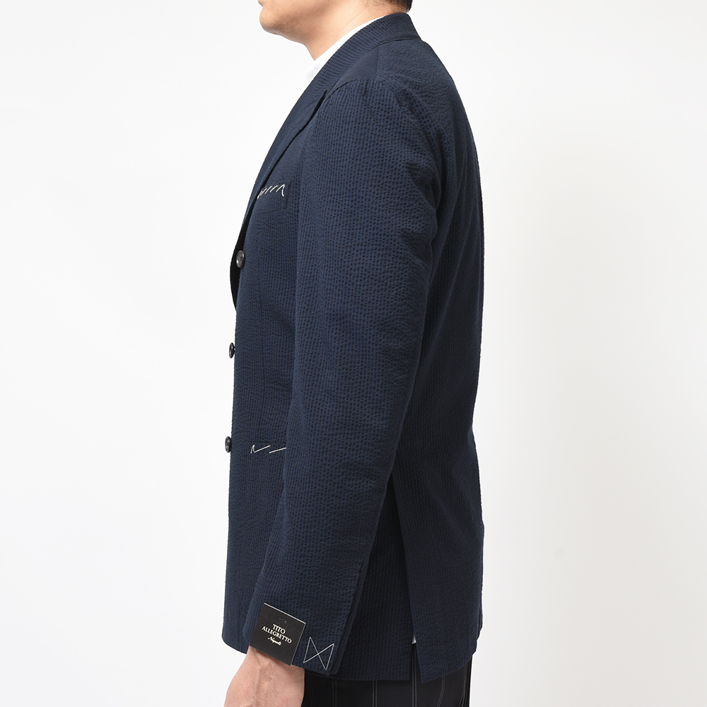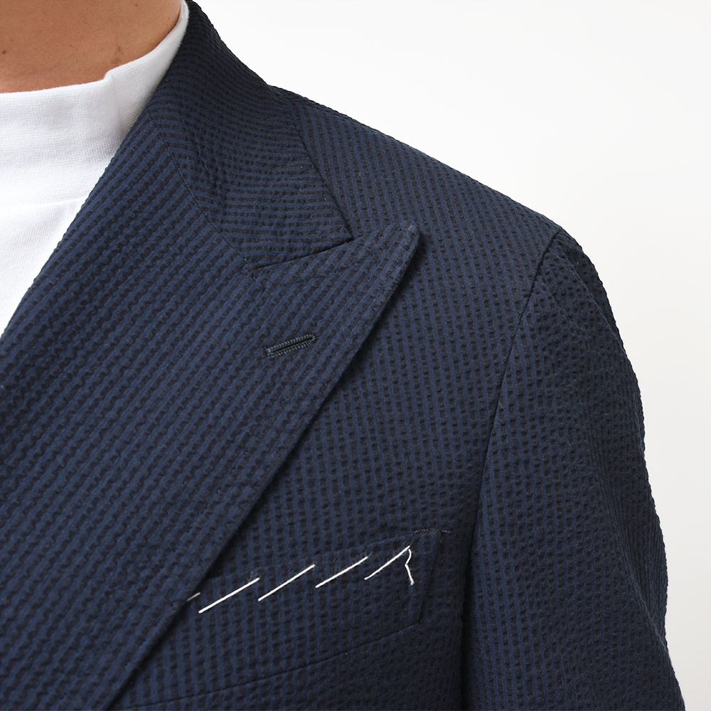 目付け250gのコットン素材のシアサッカー生地は、シアサッカー特有の凹凸感が清涼感を生んでいます。こちらは夏らしい柄のストライプではありますが、ネイビーとダークネイビーの色使いによって、遠目では無地っぽく感じられるシックな佇まいとなっています。