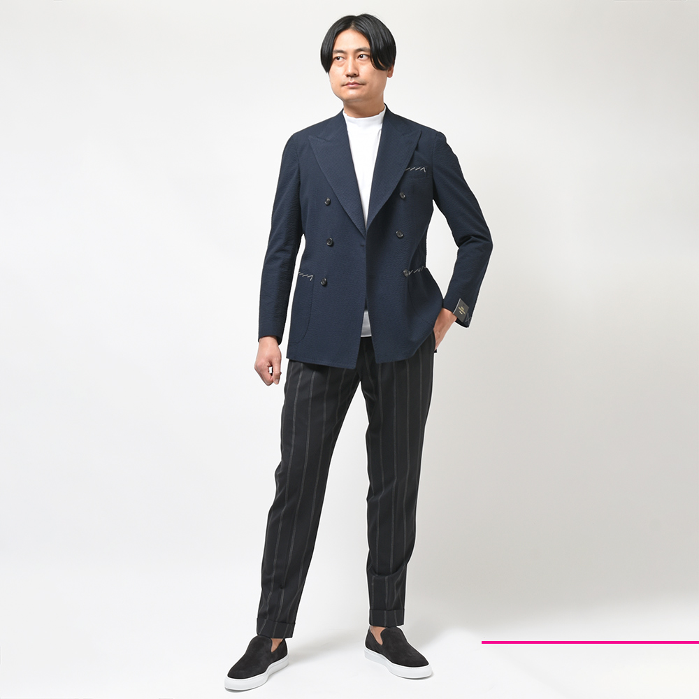 「着づらい服は服じゃねぇ」「だせぇラペルは笑っちまう」という彼の言葉があらわす通り、その美意識が色濃く反映されたジャケットやスーツは、ナポリの伝統的なスタイルを継承しつつモダンな要素が取り入れられています。
