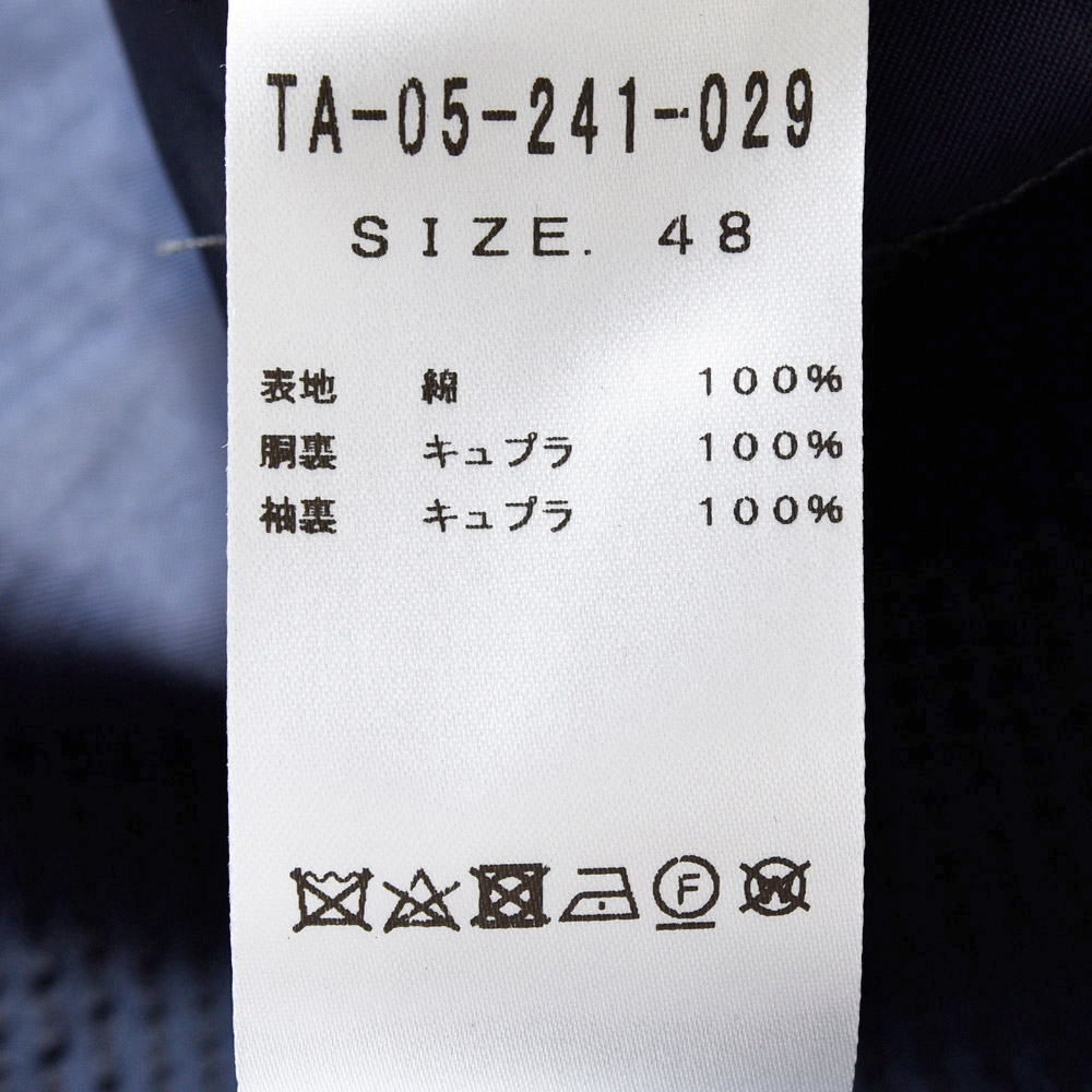 サイズ48がジャストサイズです。タイトすぎず、緩すぎずちょうどいいサイジングです。見た感じの雰囲気はスッキリとしています。ネイビーのシアサッカーがダークトーンなのに涼しげな一着!