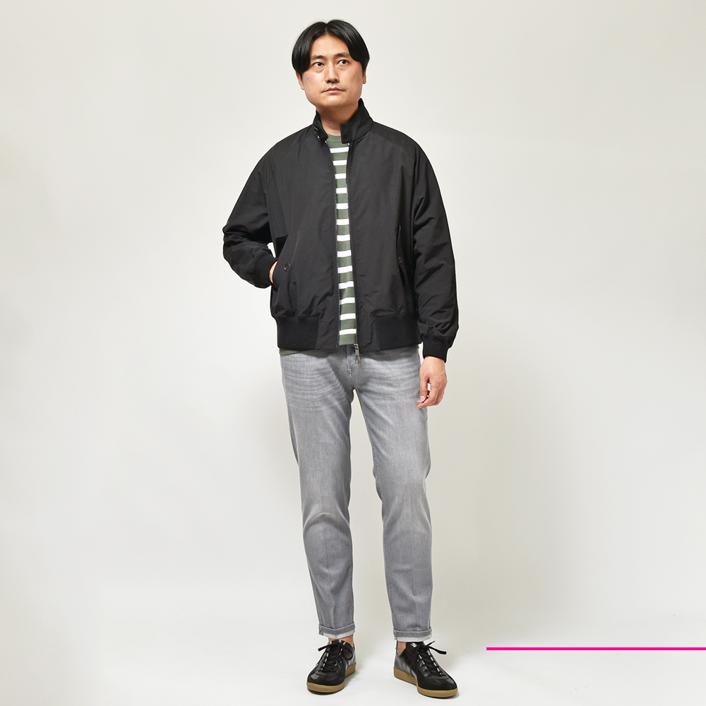 サイズ31でウエストはややゆとりがありますが、足回りはピッタリとした細身のシルエットです。春夏にはピッタリのブラックデニムですが、秋冬に穿いて抜け感を出すのもオススメです。