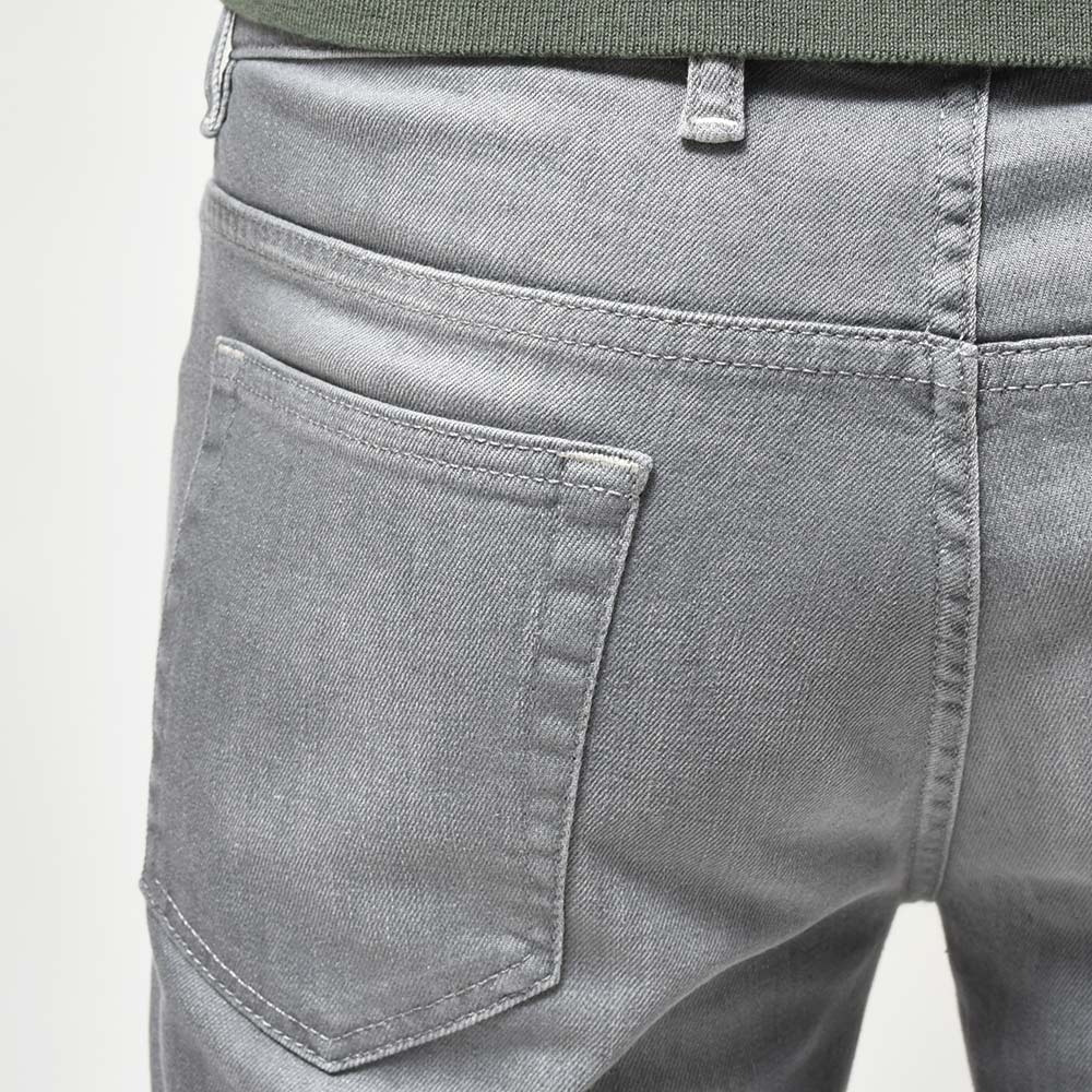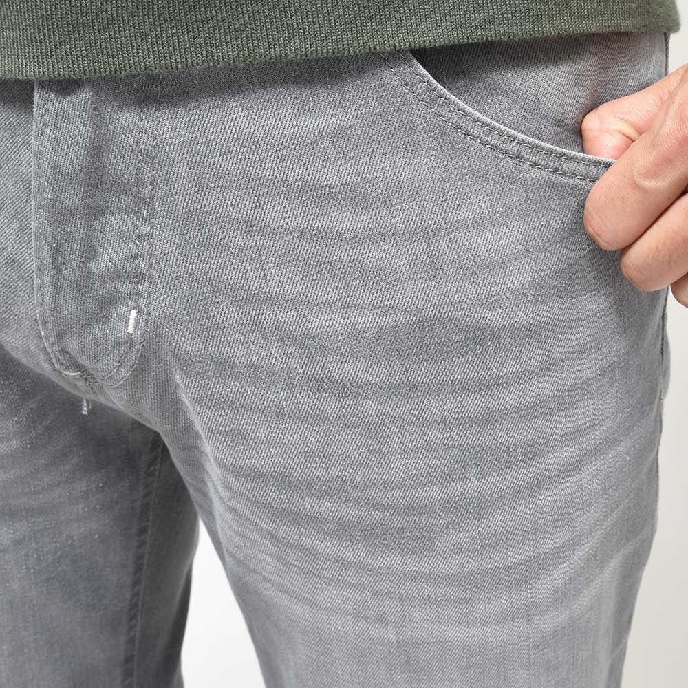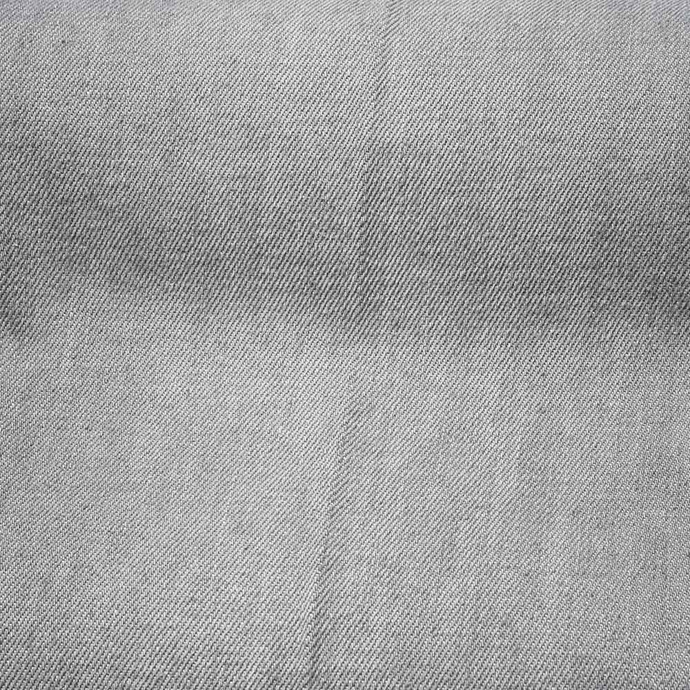 こちらは、しっかりとストレッチの効いたコットン主体のファブリック。ライトトーンにウォッシュド加工したブラックデニムは、程よくアタリのついた加工感が立体的な表情を作り上げています。また、ガンメタリックのボタン&リベットに、サスティナブルな紙素材の白いパッチが、上品でシックな大人の佇まいになります。