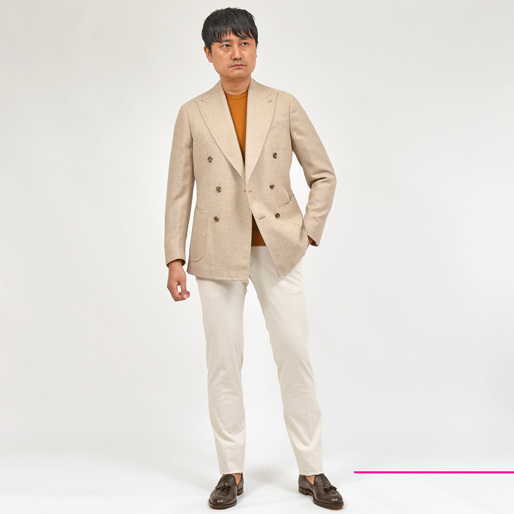 カシミヤニットや、上質な素材使いのジャケットと合わせたくなる一本です。