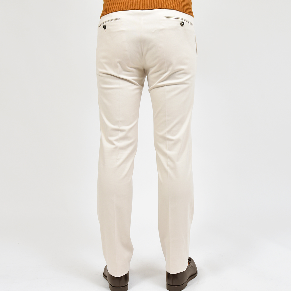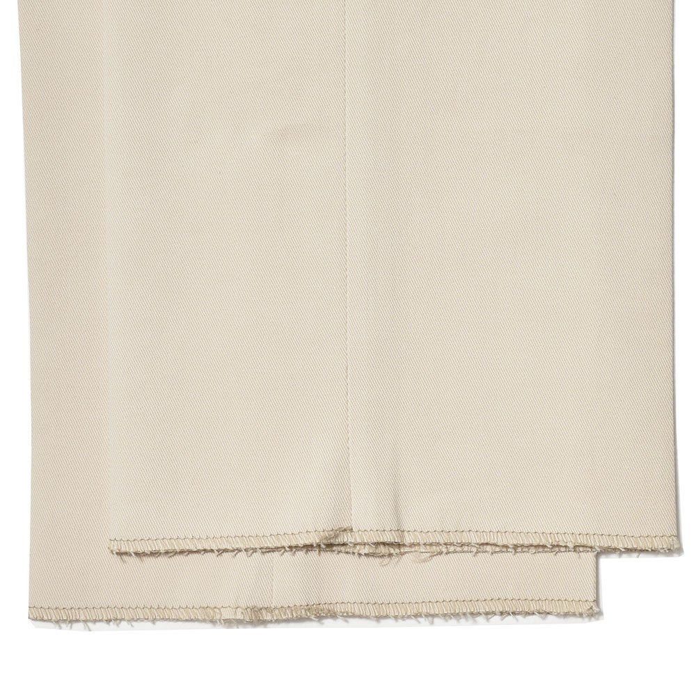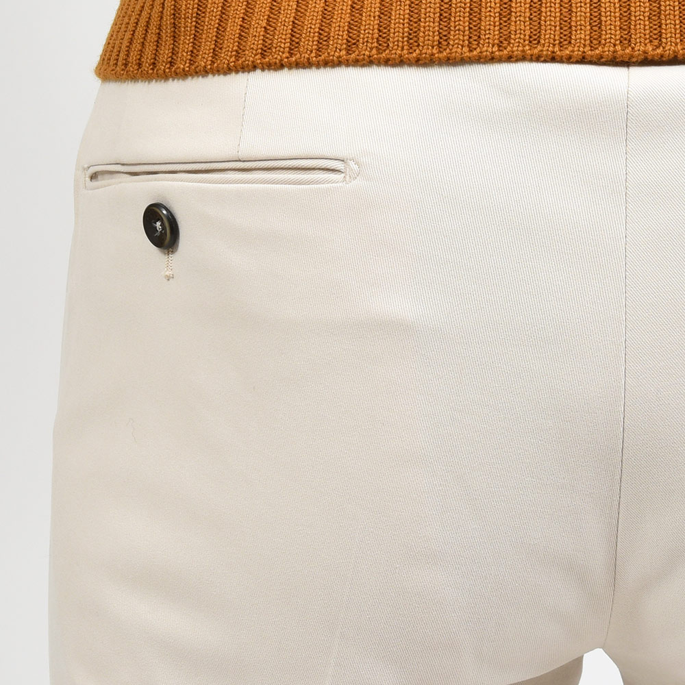 目付け380gのコットンにカシミヤを混紡した生地は、コットンらしい程よいコシは維持につつも、カシミヤ特有のクラス感ある艶と何とも言えない柔らかなタッチを再現しています。また、ココンチらしいストレッチ性も持たせていますので、穿き心地は言わずもがな。ピーチスキンのような起毛感があることで、真冬のコットンパンツとしても重宝し、また起毛しすぎていない事で秋や春先にも着用できる佇まいとなっています
