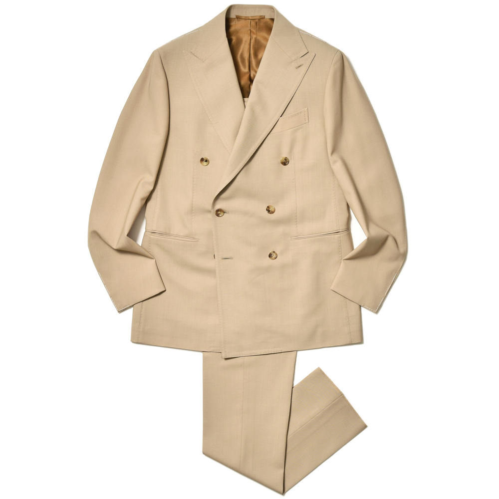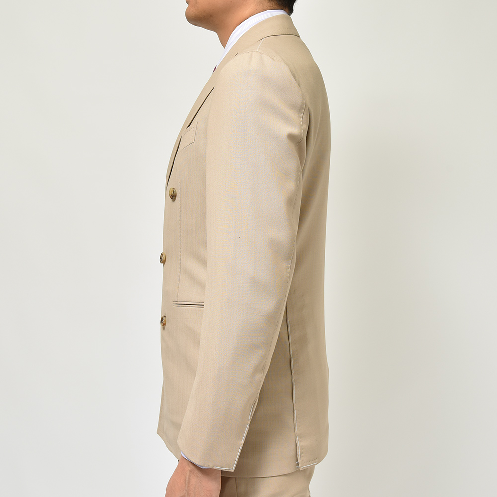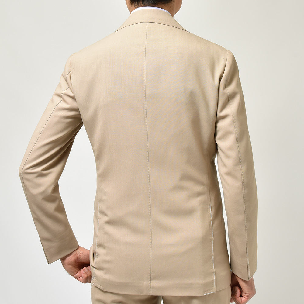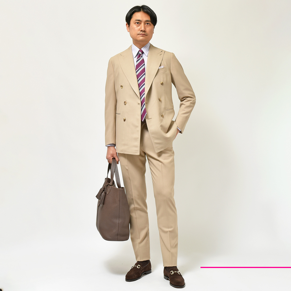 サイズ48がジャストサイズです。ジャケットはタイトすぎず、緩すぎずちょうどいいサイジングです。それでいてスッキリとしています。パンツは股上が気持ち深く、裾にかけて緩やかにテーパードしたクラシックな印象です。清涼感漂うベージュのウールフレスコスーツです!