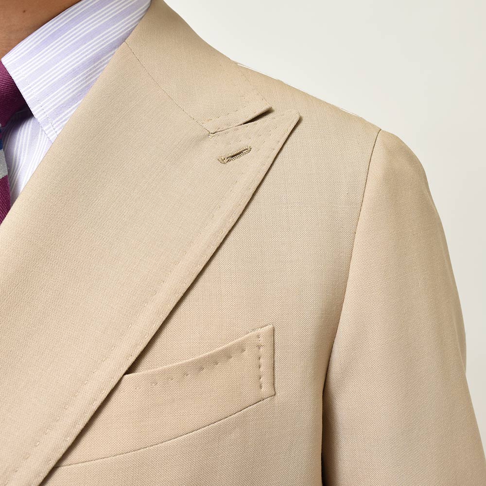 目付270gのウールフレスコは、フレスコライトと名付けられた、通常のフレスコよりも軽るいウエイトになります。 さらにドライなタッチでありながらも、しなやかで艶のある高級感が漂う質感に、なんとも言えないニュアンスのベージュが唯ならぬ雰囲気を醸し出します。