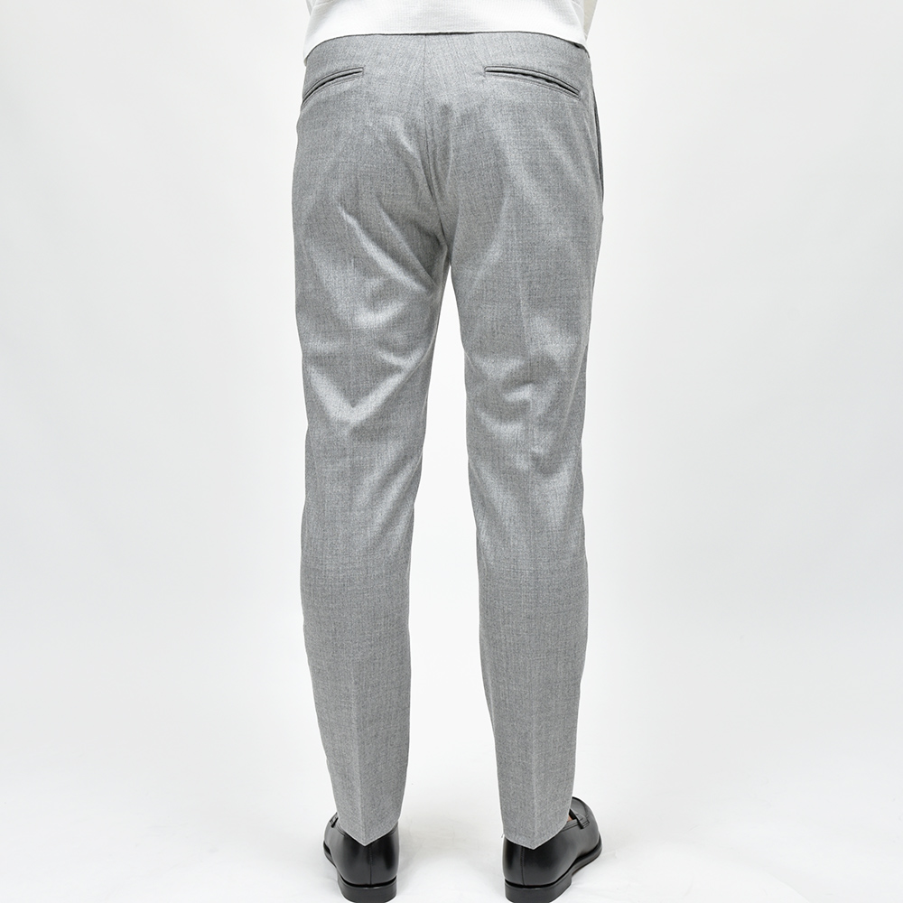 ココンチでは定番とも言える目付け340gのウールストレッチサキソニー生地は、カジュアルにもドレスにも幅広く振れる高い汎用性を持ちます。ワードローブとして着回しやすい程よいウエイトと、程よい起毛感がついつい手が伸びてしまうスタイリングの救世主たる一本です。