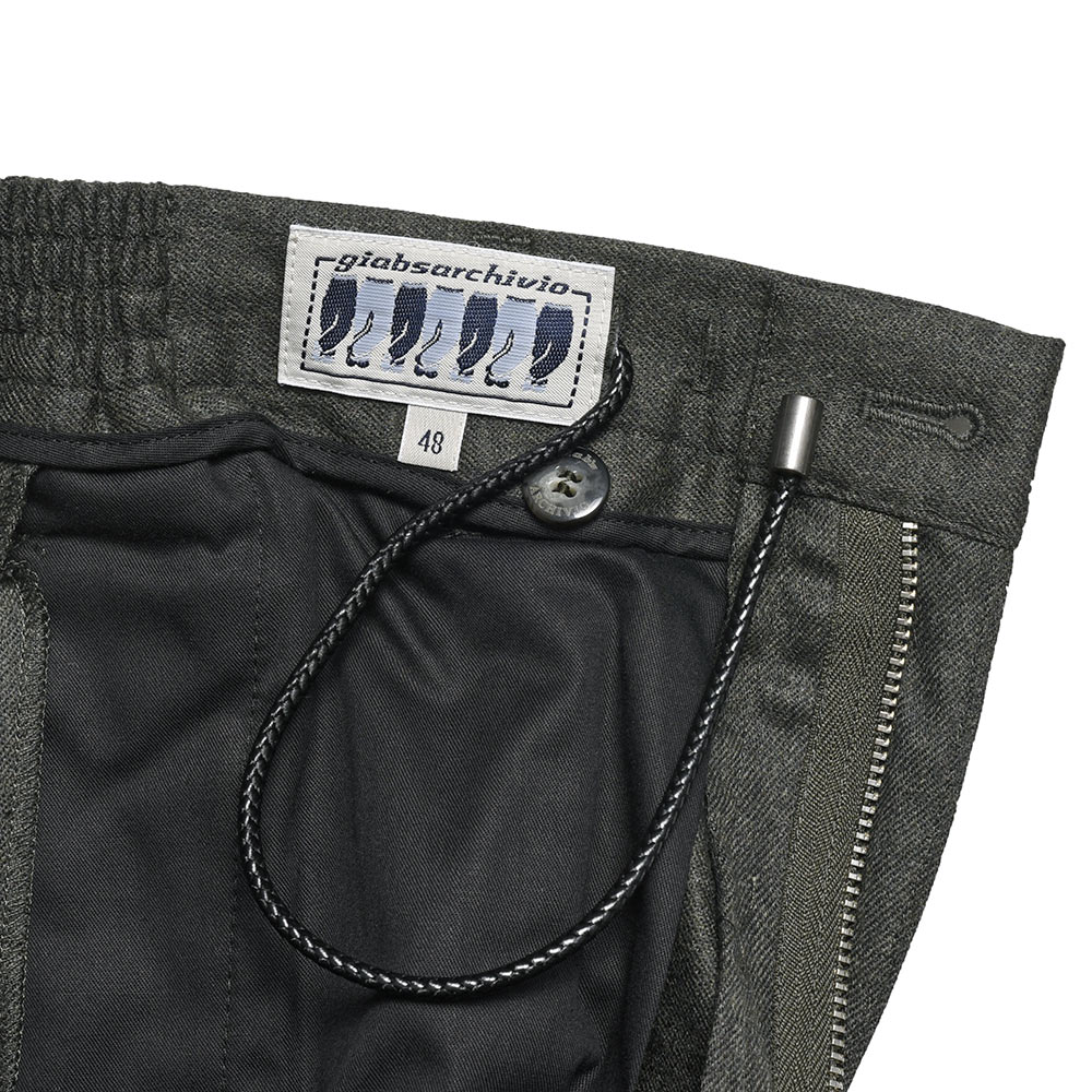 giab's ARCHIVIOを語る上で外せないアイコンモデルの“MASACCIO(マサッチョ)”。リラックスパンツであっても、スリムテーパードの美しいシルエット。さらには、フロントクリースをステッチで抑えることで、美しいラインがいつまでも続く永遠を約束された特別な一本です。ウエストのサイドにはゴムが入っており、ウエストは4cmほど伸縮してくれるリラックスした穿き心地。ドローコードは内側に隠すことができるため、ベルトを巻くとビジネスにも対応する、リラック顔にもドレス顔にも変化の効く万能なアイテムです。