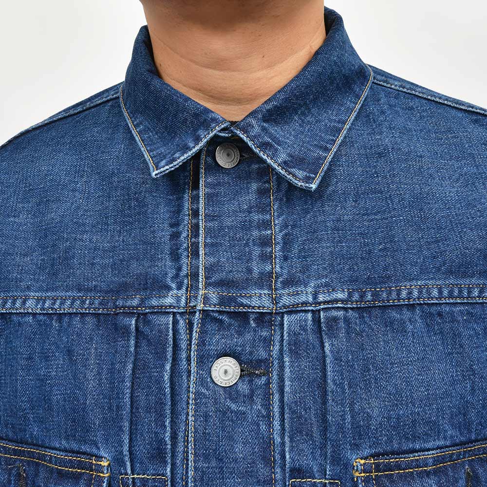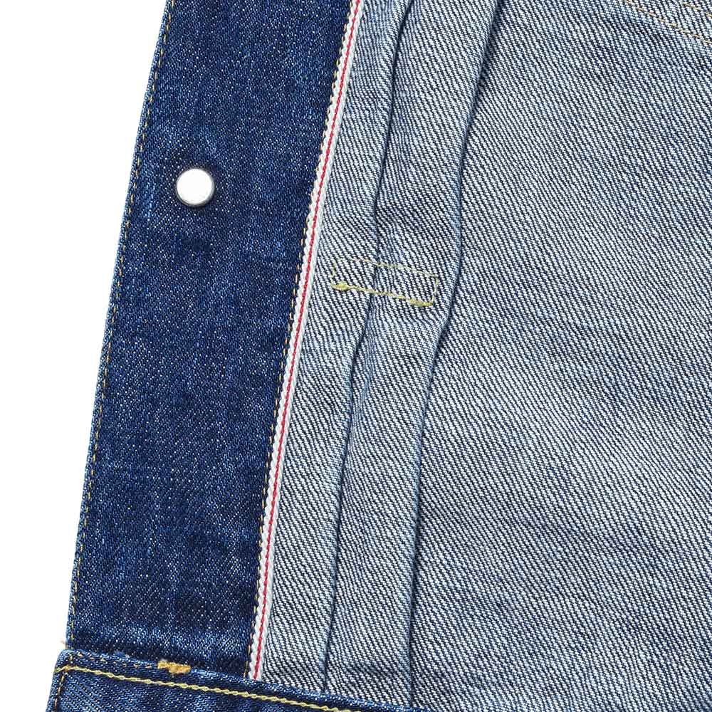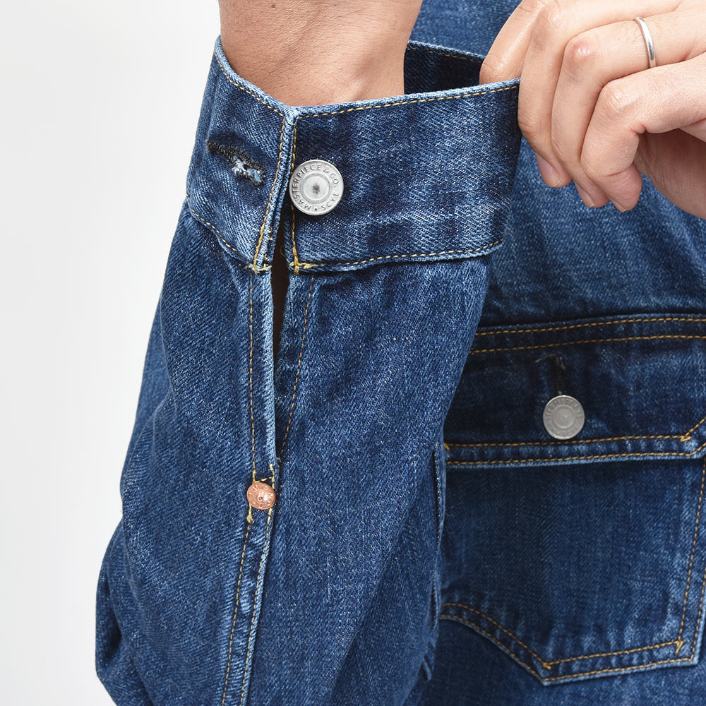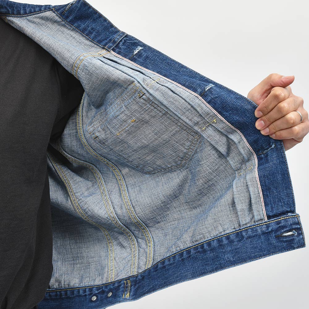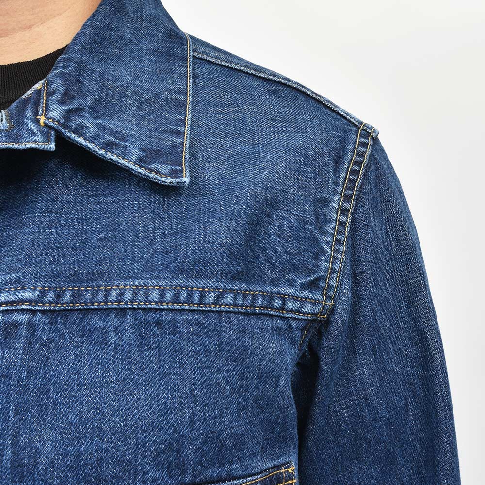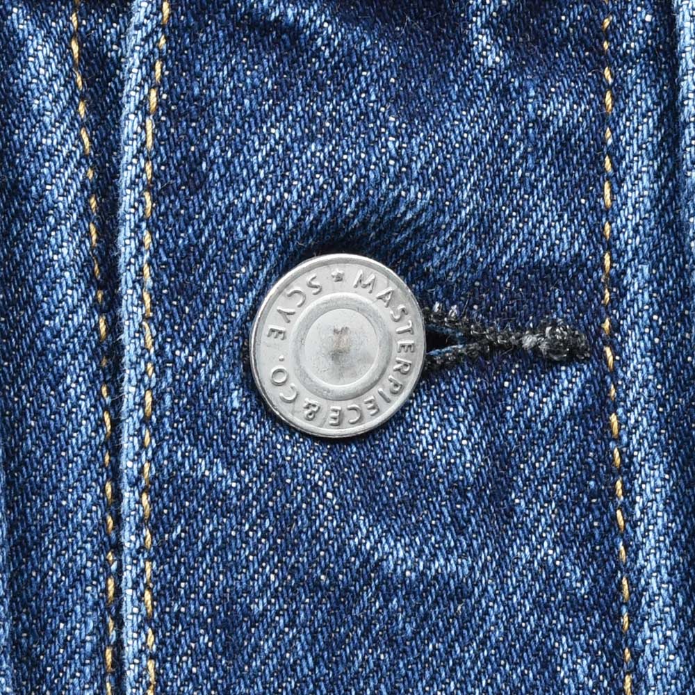 Scyeオリジナルのセルビッジデニムは、縦糸にアメリカのサンホアキン産のコットンとオーストラリア産のコットンをブレンドした7番手のムラ糸を、緯糸には6番手のストレート糸を使用してシャトル織機で織り上げた赤耳付きのデニム。古くは狩猟用のジャケットに採用されていた袖下とサイドパネルとが一体となったピヴォットスリーブは、袖先から裾まで生地を伸ばしていくことで脇の部分に縫製箇所がなく、腕の可動域を広げつつも自然で美しいシルエットを構築するScyeならではのパターンになります。