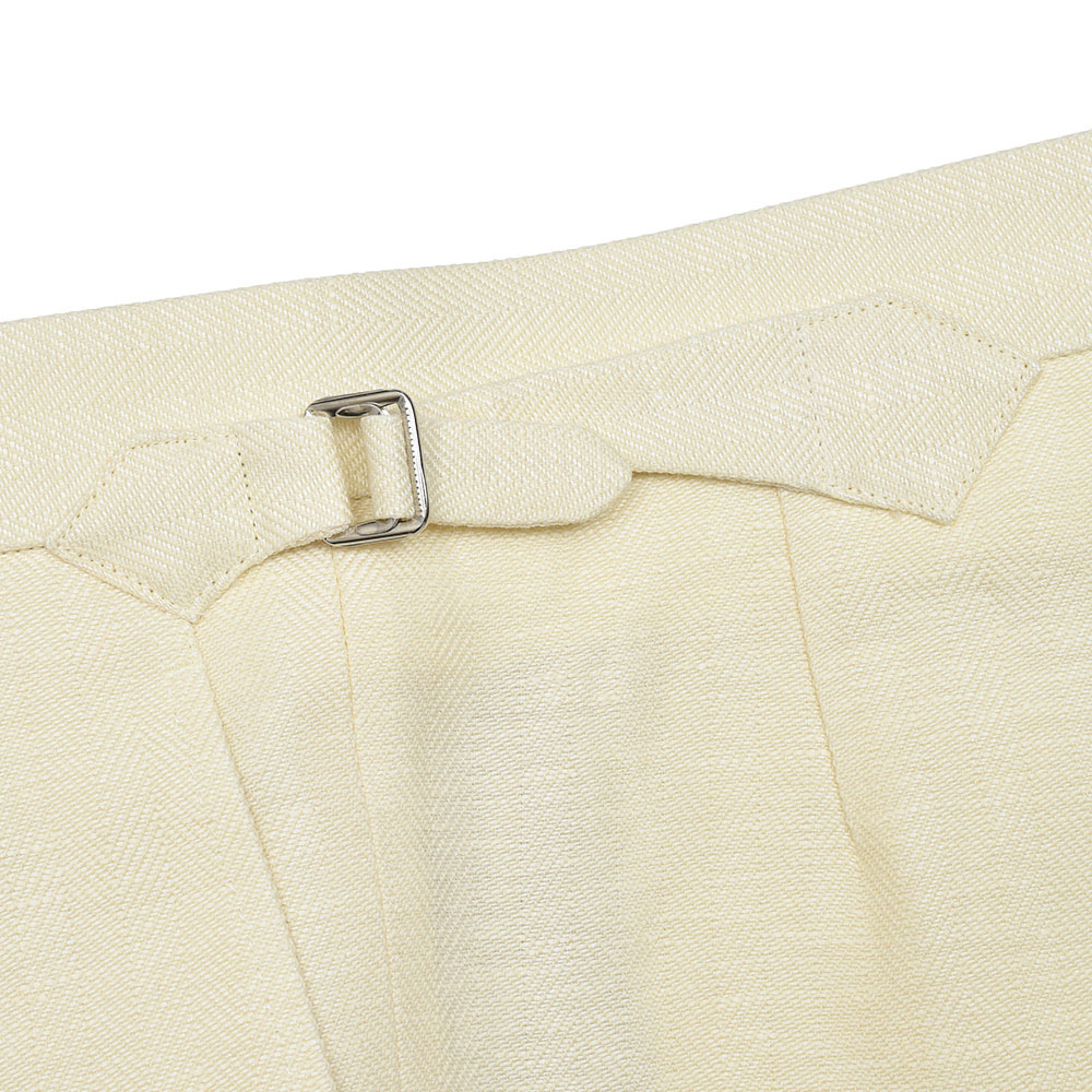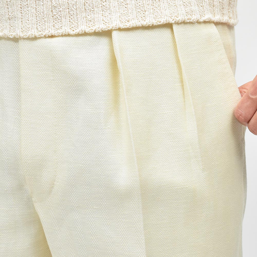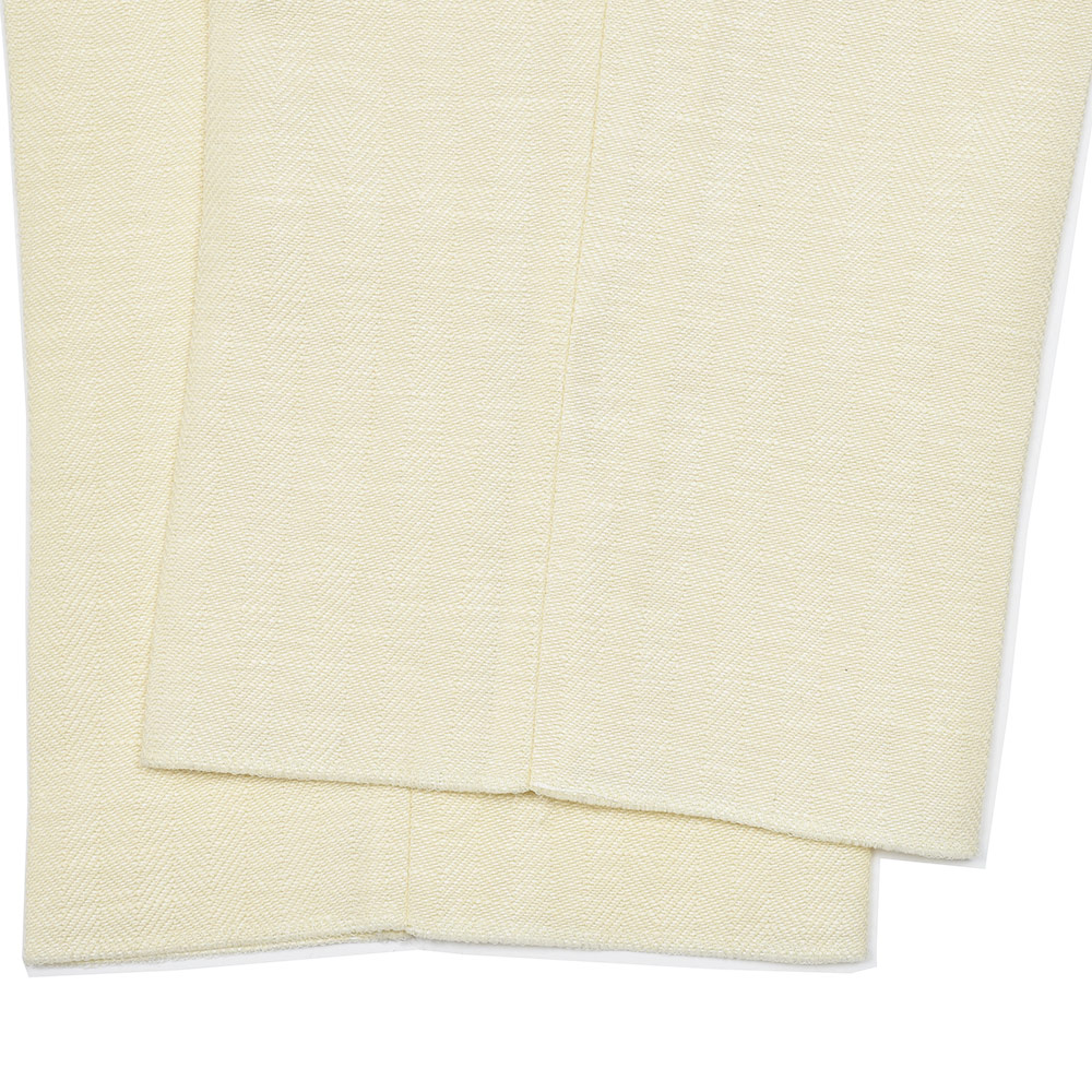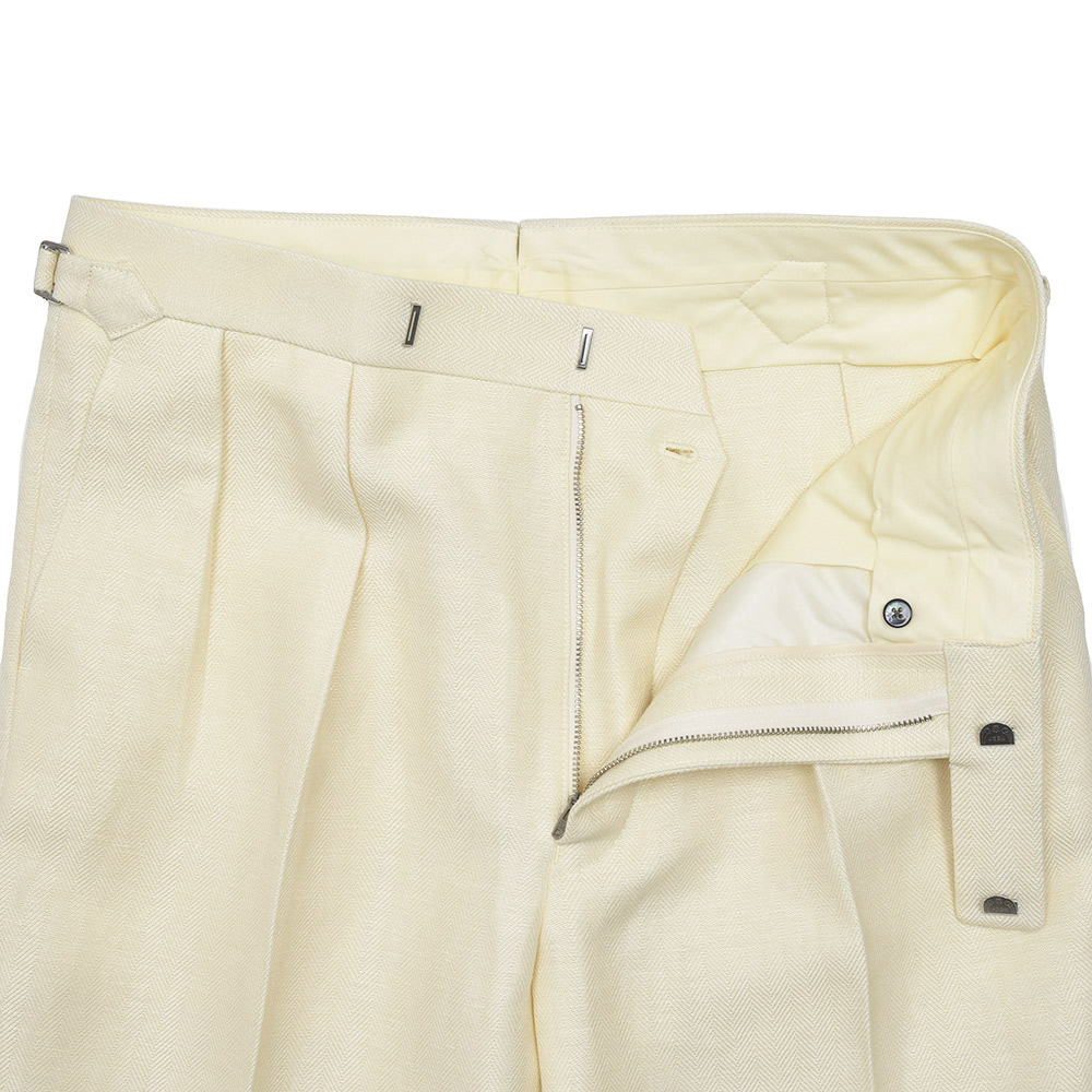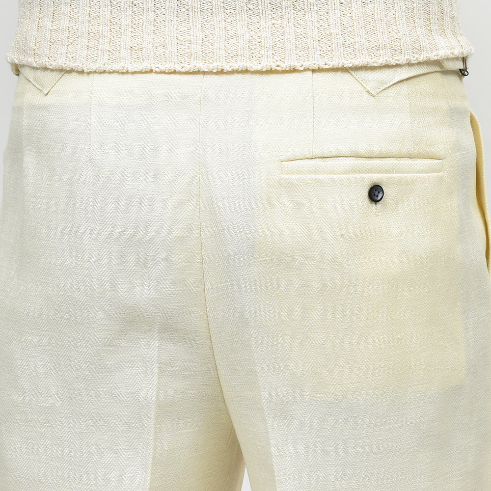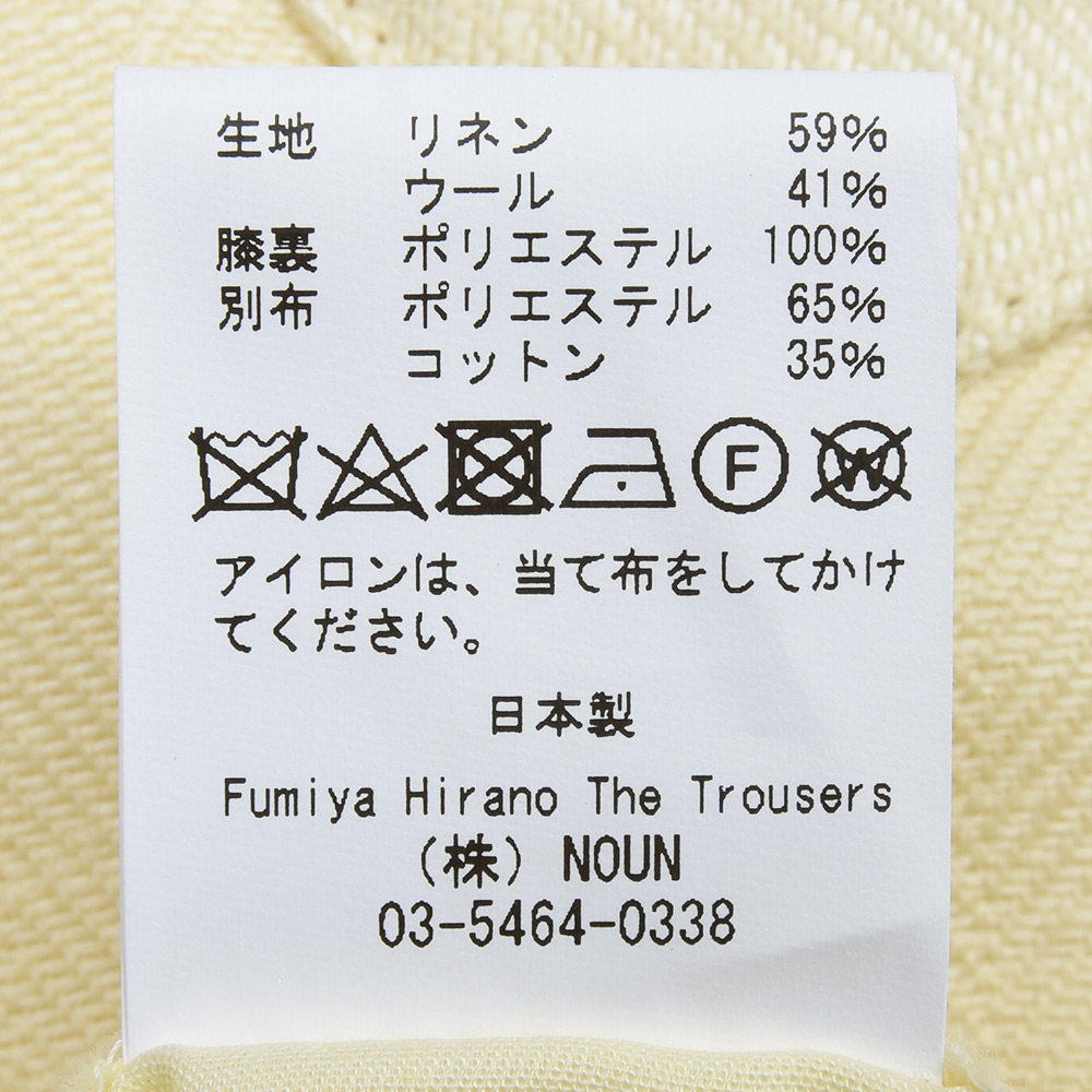 ファブリックは、イタリアのビエラ、イギリスのハダースフィールドと並ぶ、世界三大織物産地の一つである尾州産のリネン×ウールのヘリンボーン。平野氏が自ら開発に携わったオリジナルファブリックは、尾州ならではの高いクオリティに英国らしい香りを纏わせたFumiya Hirano”らしい仕上がりとなっています。