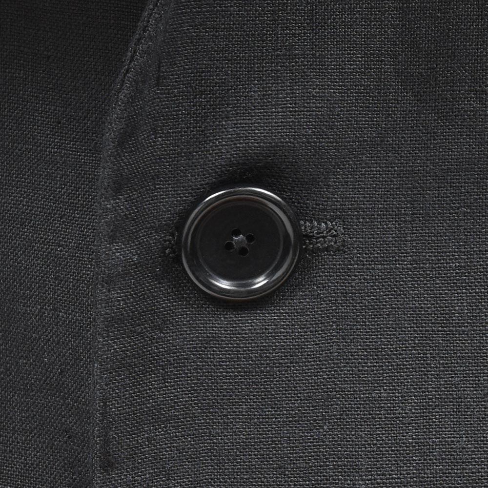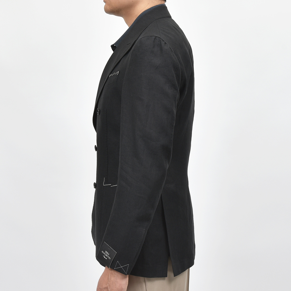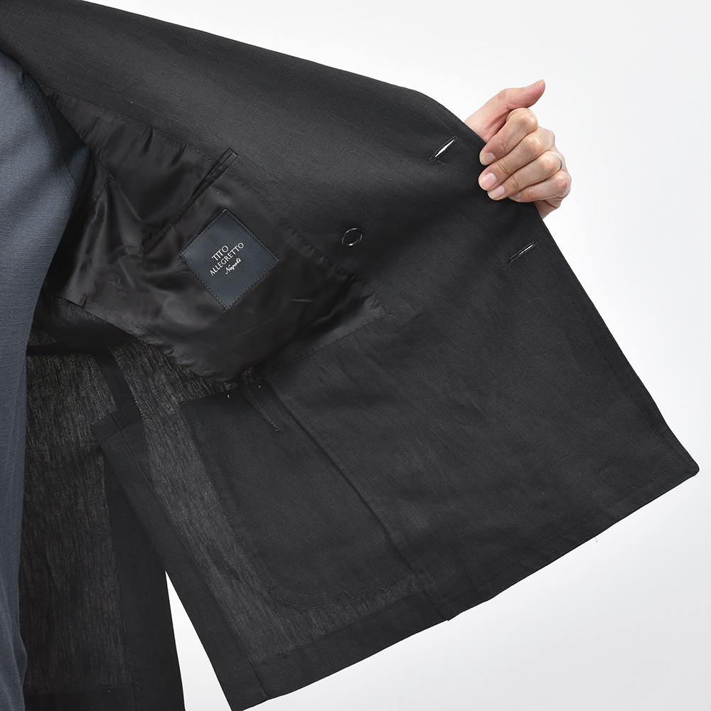 モダンなブラックジャケットは、軽めの目付け250gのリネン素材になります。ナポリ近郊のミル“vittoria”はリネン専業で展示会にも出店していない知る人ぞ知るミルですが、リネン専業だけあってそのバリエーションは豊富。こちらもリネン100%ですが、タッチは柔からく品がありながらもリネンらしい味わいも持ち合わせた、なんとも言えない奥深い表情を見せてくれます。