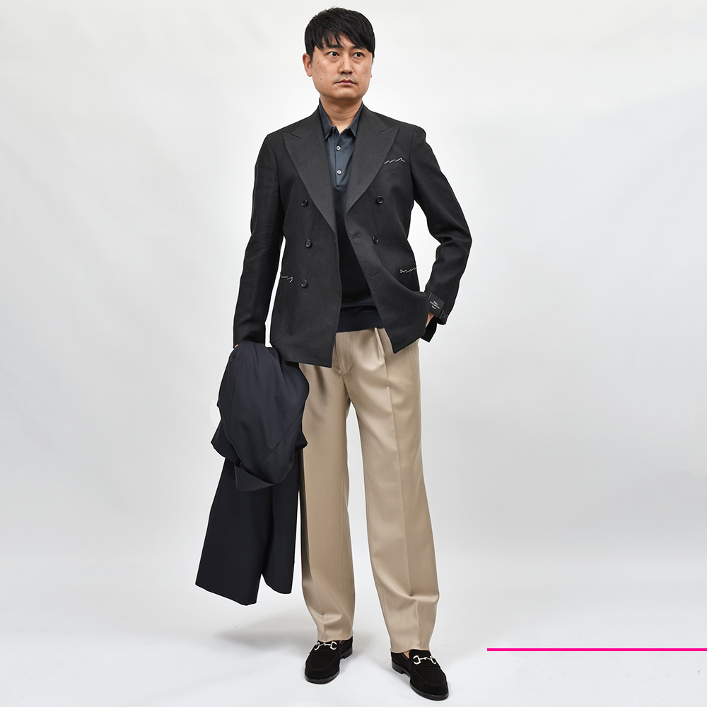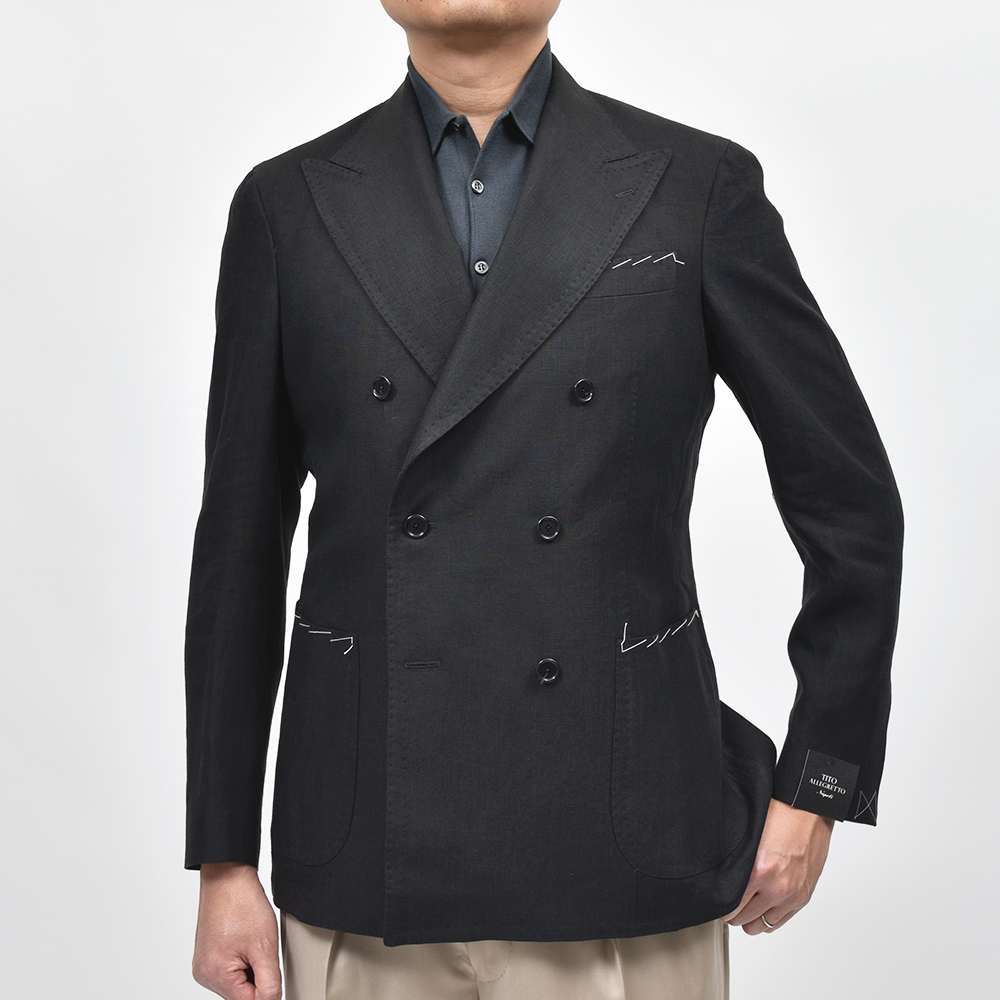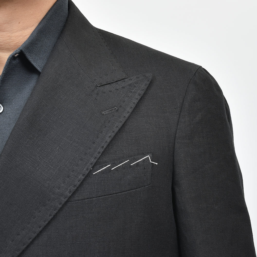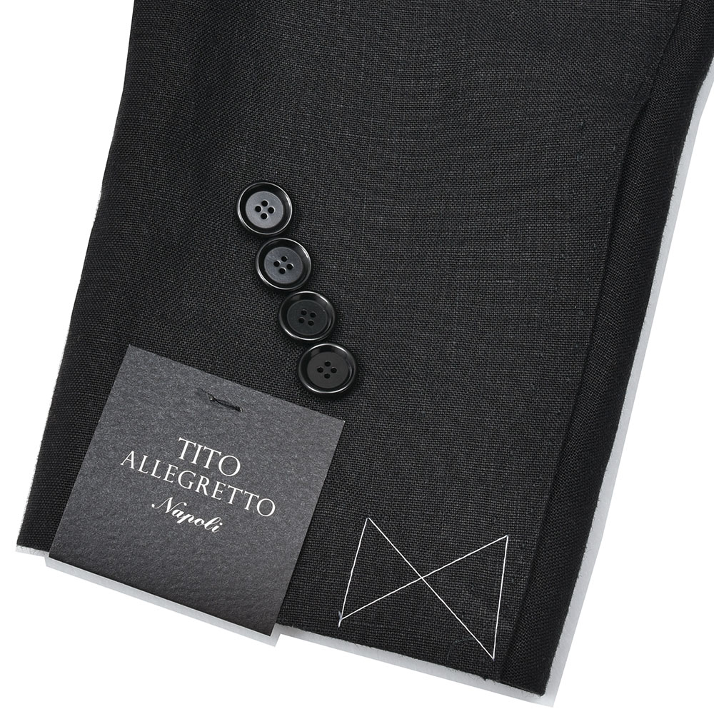 モダンなブラックジャケットは、軽めの目付け250gのリネン素材になります。ナポリ近郊のミル“vittoria”はリネン専業で展示会にも出店していない知る人ぞ知るミルですが、リネン専業だけあってそのバリエーションは豊富。こちらもリネン100%ですが、タッチは柔からく品がありながらもリネンらしい味わいも持ち合わせた、なんとも言えない奥深い表情を見せてくれます。