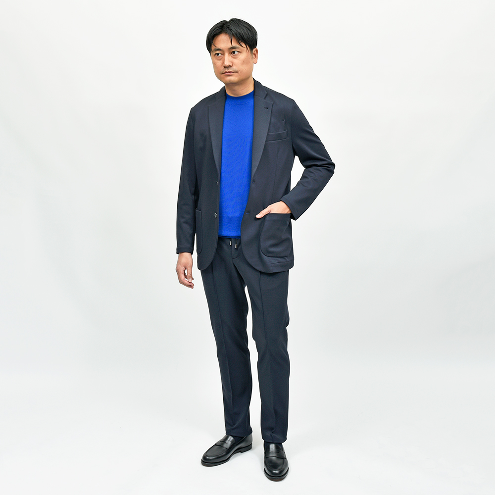 サイズ50でインナーにカットソーを着て、肩幅・身幅共に程よくゆとりのあるややリラックスしたサイズ感です。スッキリとスリムな印象で着るならサイズ48でも問題ありません。個人的にはドローコードパンツとも相性の良いサイズ50が好みです!