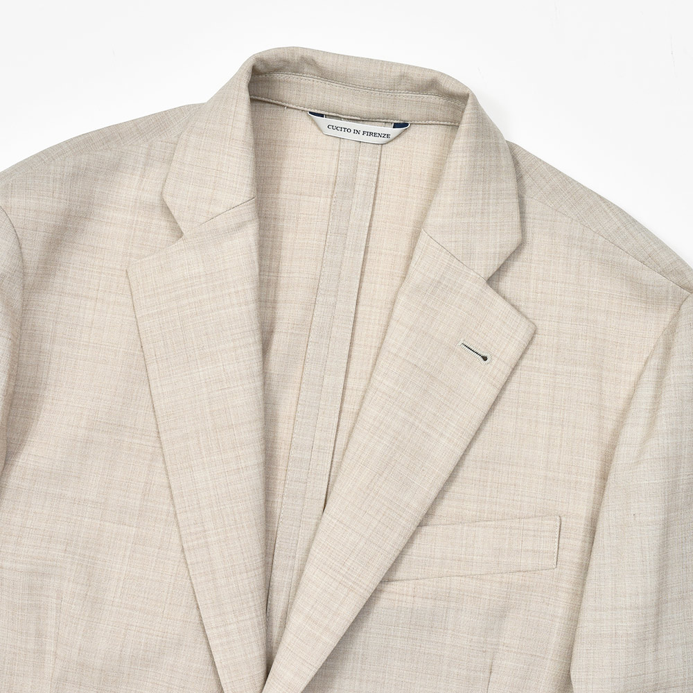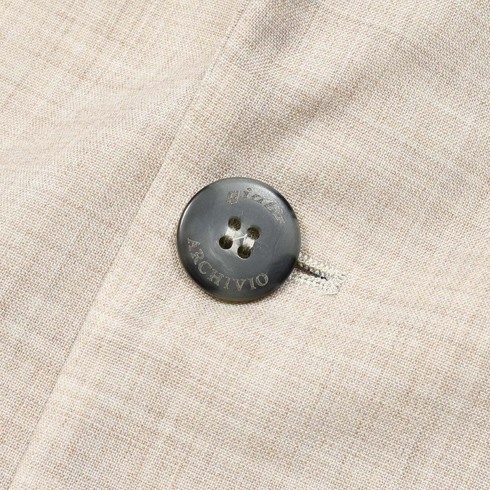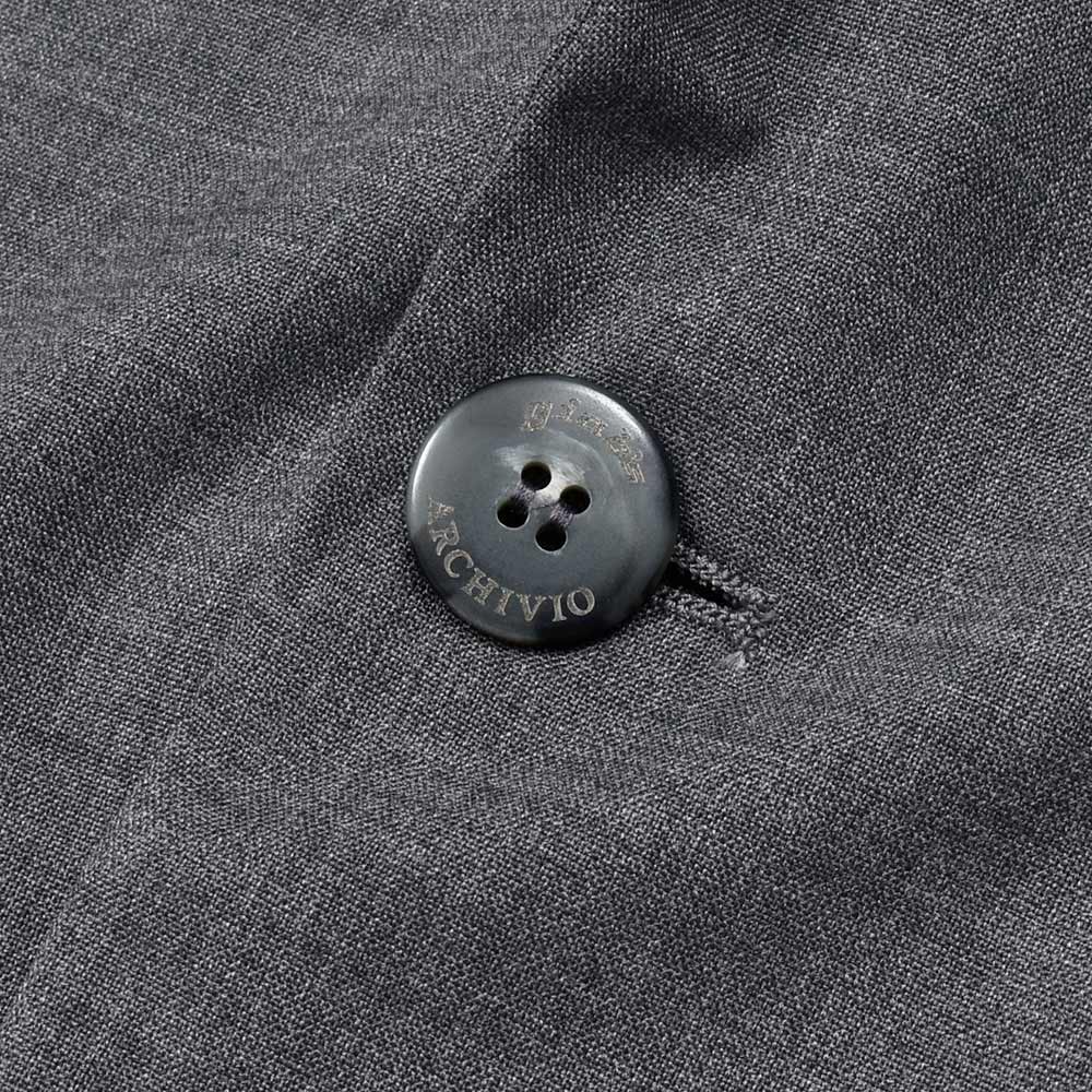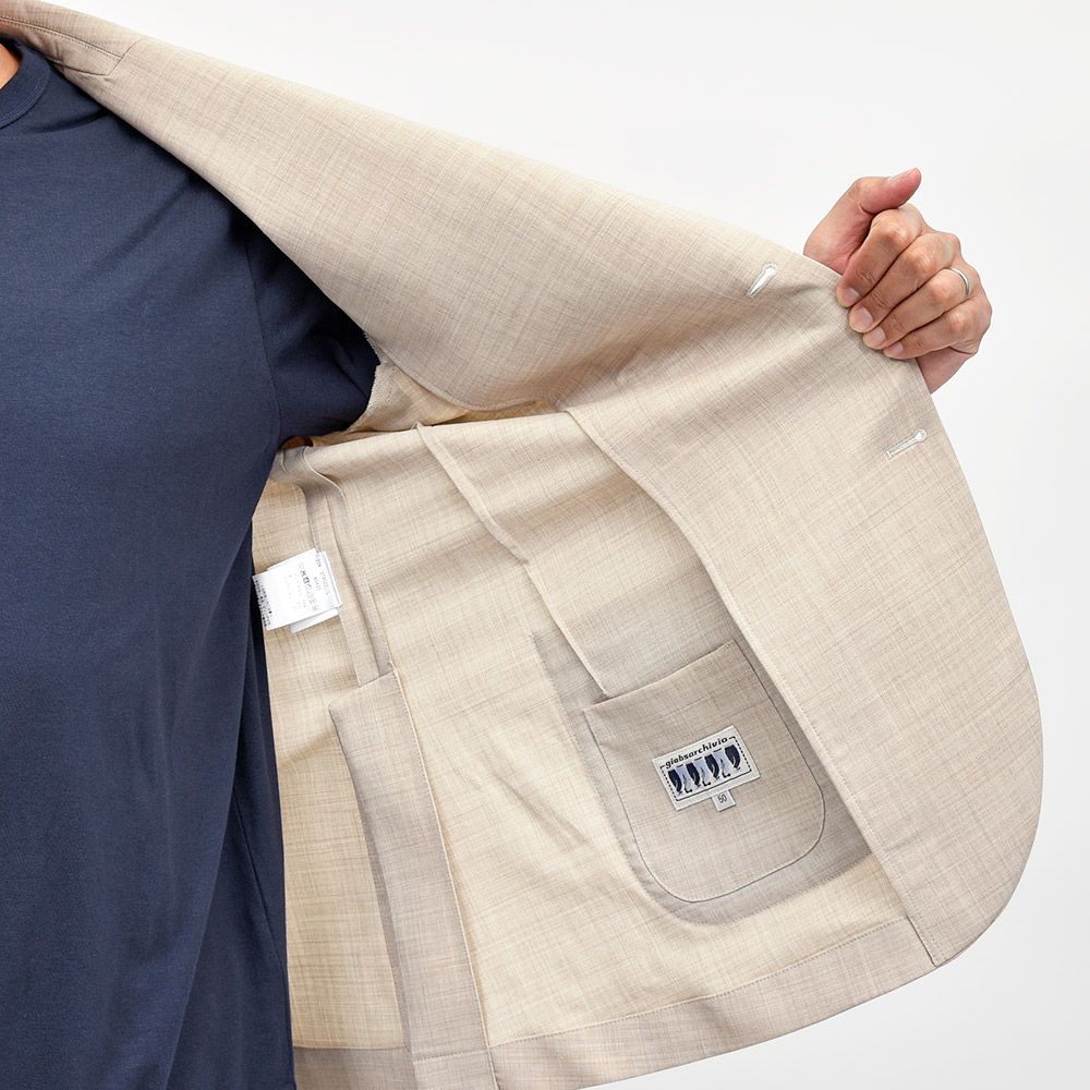giabsarchivioのジャケットラインのモデル“STROZZI(ストロッツィ)”。イージーなパンツを得意とするブランドですので、ドレスライクなジャケットではなく、アンコンで裏地もない筒袖仕上げで、あくまでも気軽に羽織れる仕上がりとなっています。しかしながら、現代の実情を見ているとこのくらいのジャケットで十分というシーンはよくある事ですので、デザイナーの中新井氏らしい痒い所に手が届く一品です。
