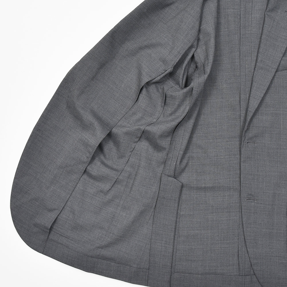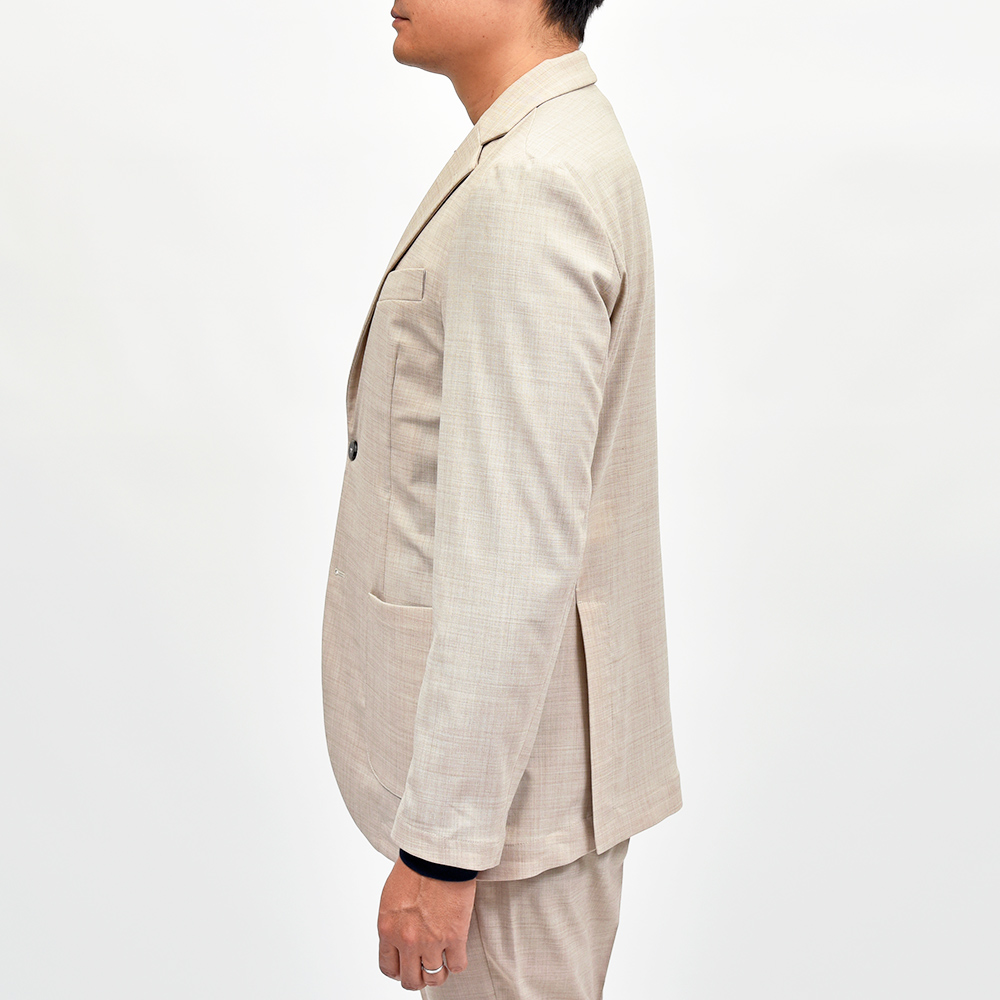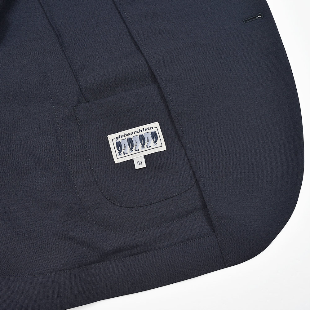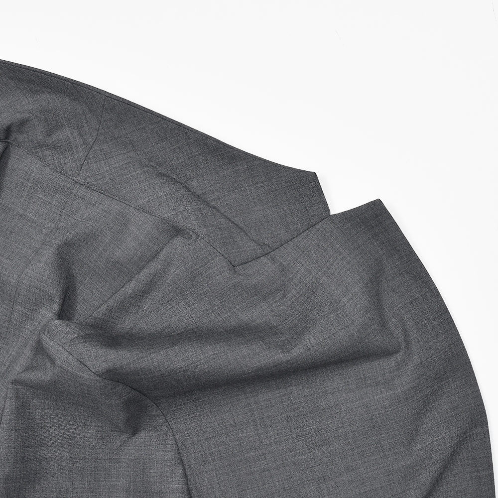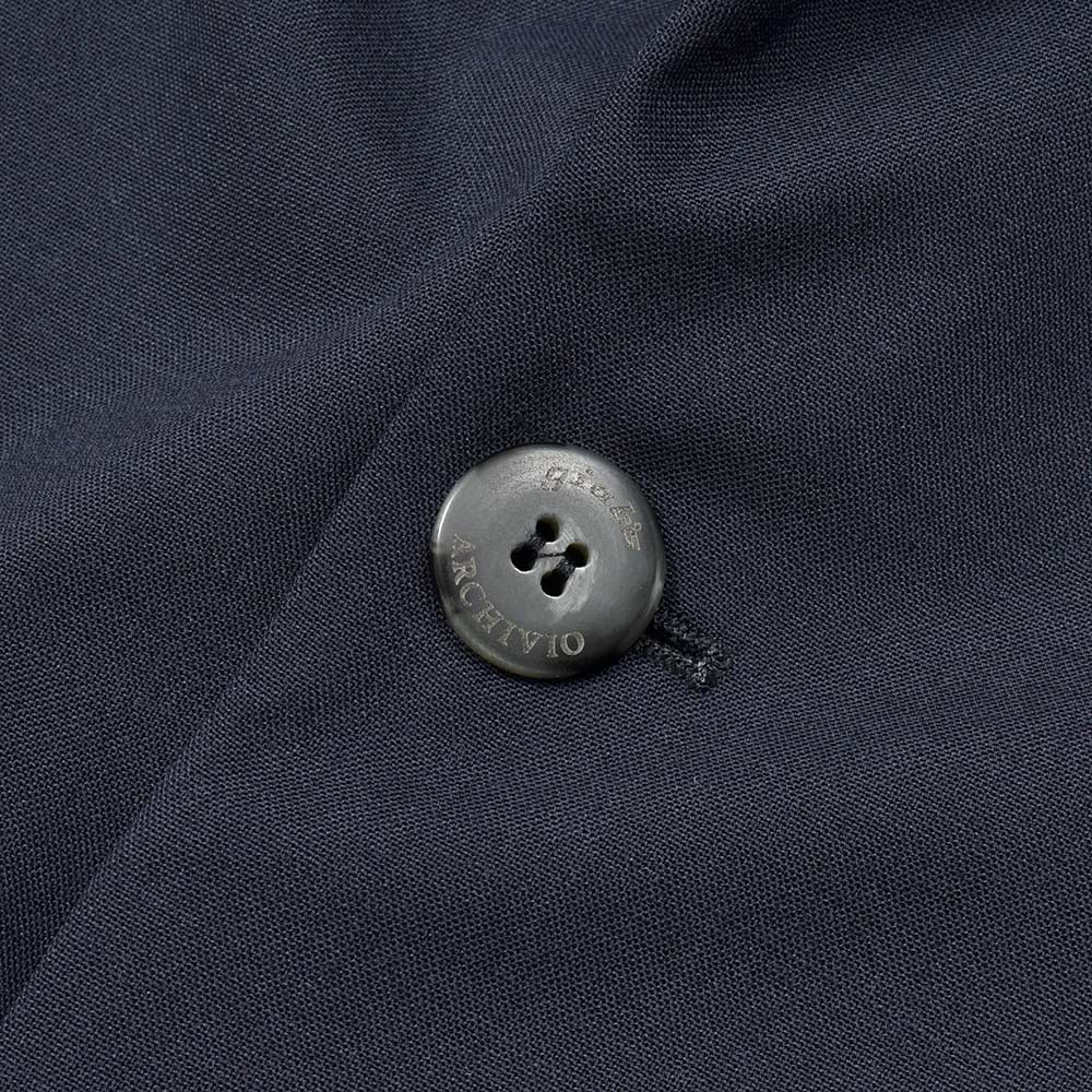 giabsarchivioのジャケットラインのモデル“STROZZI(ストロッツィ)”。イージーなパンツを得意とするブランドですので、ドレスライクなジャケットではなく、アンコンで裏地もない筒袖仕上げで、あくまでも気軽に羽織れる仕上がりとなっています。しかしながら、現代の実情を見ているとこのくらいのジャケットで十分というシーンはよくある事ですので、デザイナーの中新井氏らしい痒い所に手が届く一品です。