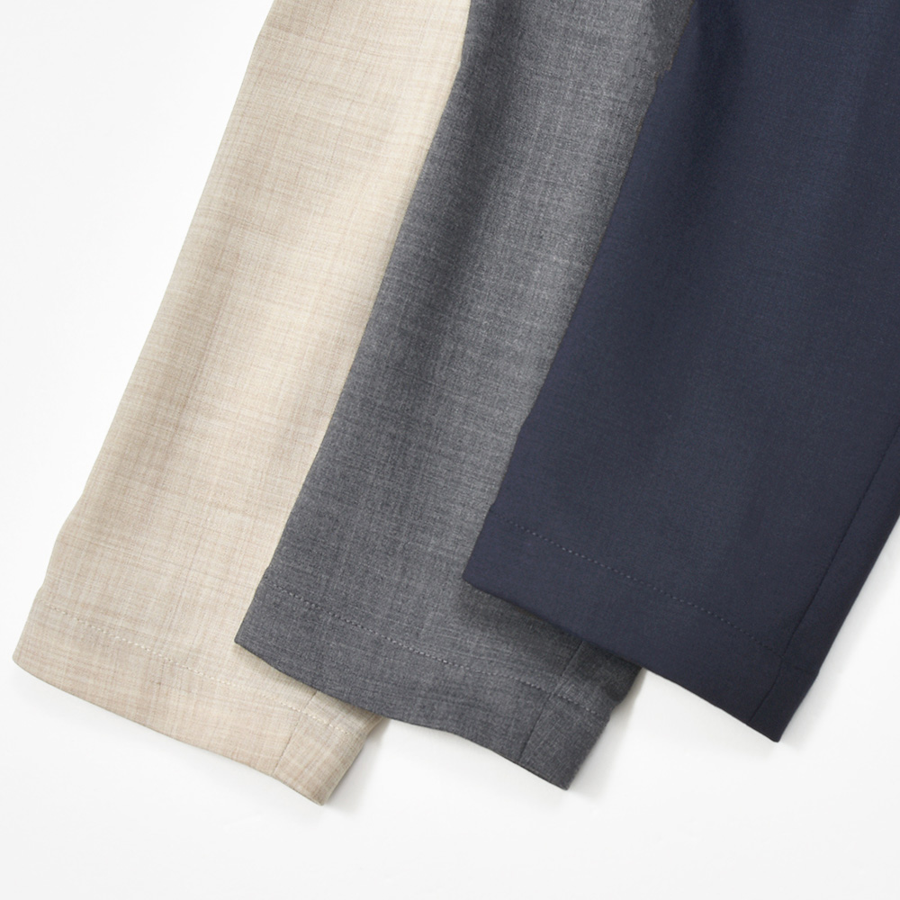 スタンダードジャージーに並ぶ、ココンチの定番ファブリックの一つである“テクノウール”。目付け250gのウールトロピカルで、目付自体も少し軽いものになっています。薄手で軽くドライなタッチはそのままに、上品な表情でありながらも自宅で洗濯が可能なウォッシャブル生地。また、シワにもなりにくく、ストレッチ性に富んだコンフォートなオリジナルファブリックになります。オフはもちろん、オンタイムでも活躍できる抜群の汎用性を発揮してくれます。