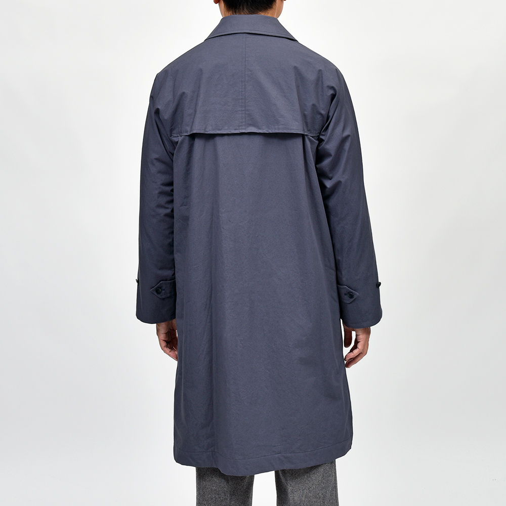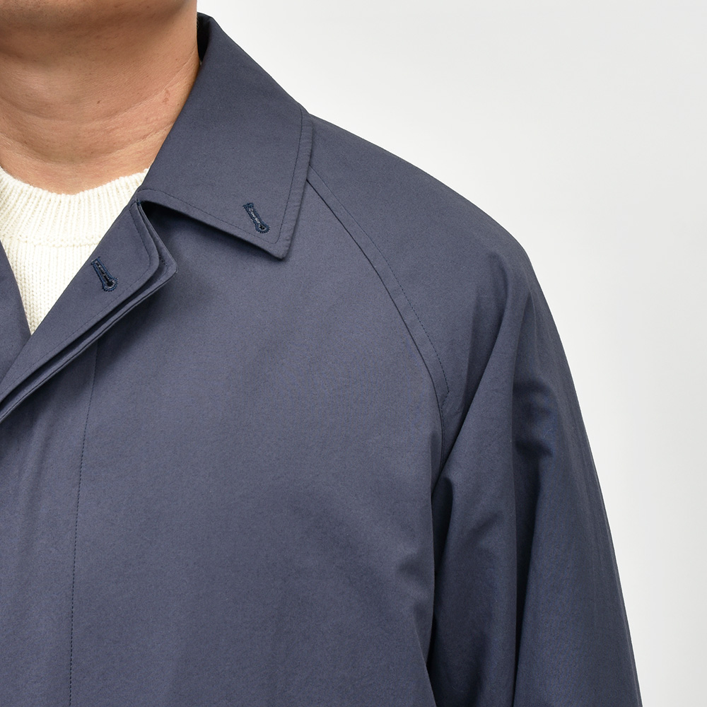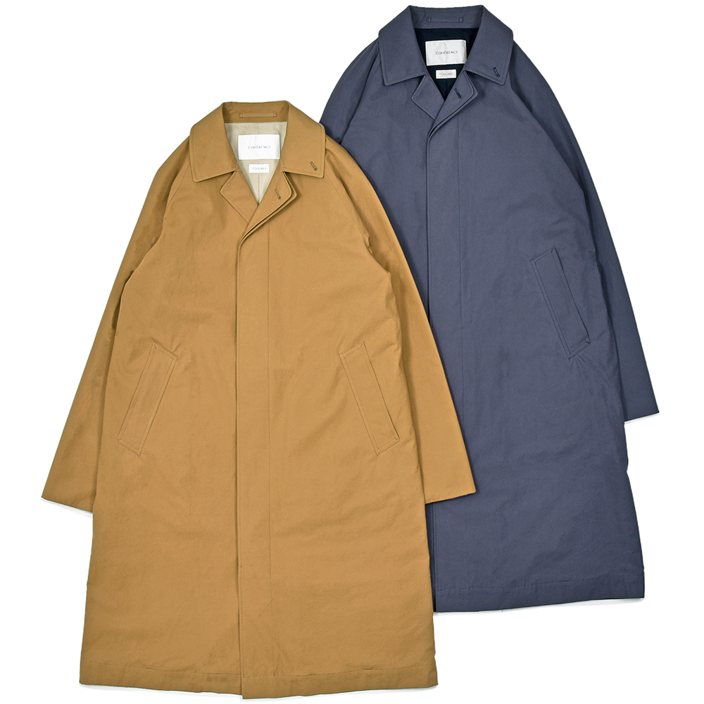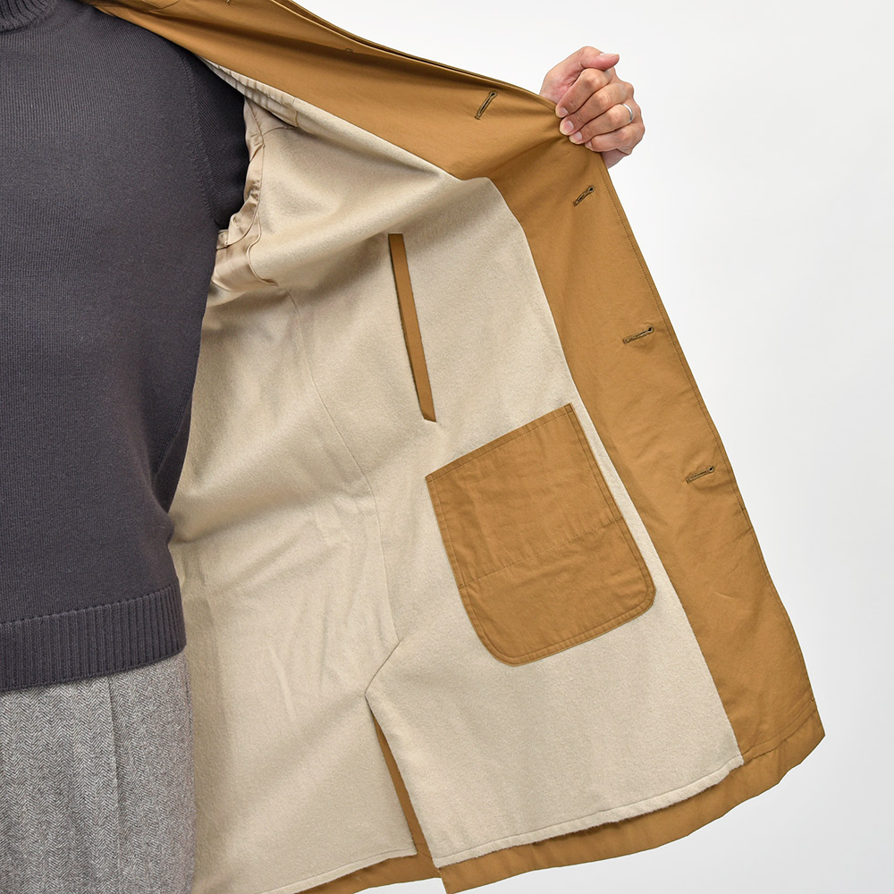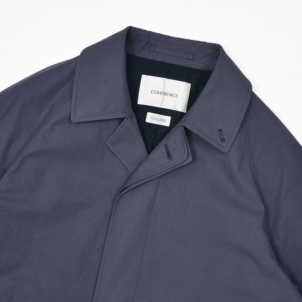 デザイナーである中込憲太郎氏自ら開発に携わる、オリジナルファブリックを使用するCOHERENCE。“COHERENCE Weather Resistant Cotton Light”と名付けられたこちらは、細番手の糸を使用し超高密度に織り上げることで、撥水性能を持つ軽量のコットンポプリン素材となっています。また、表面の凹凸感がサラリとした風合いをもたらしつつも、身頃の裏地にはカシミヤ素材のライニングが取り付けられていることで防寒性を持たせています。軽量で保温性の高いディティールに、ゆったりとしたサイズ感であることで、インナーの調節がし易くインナー次第で秋口から春先までの長い期間で着用できる一着です。
