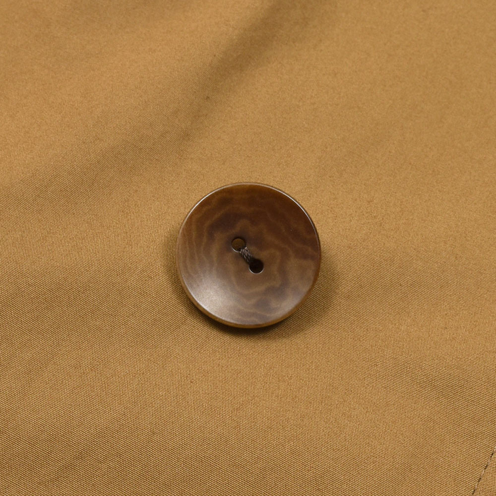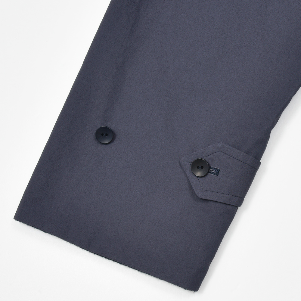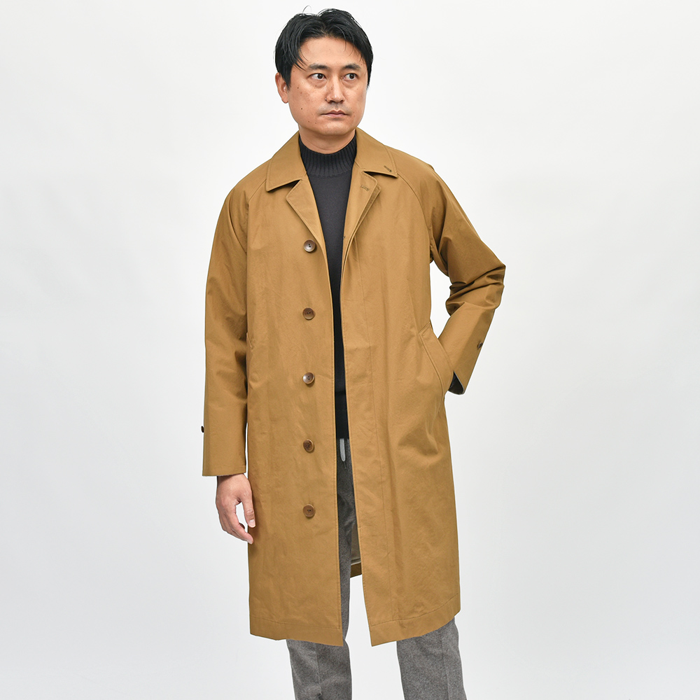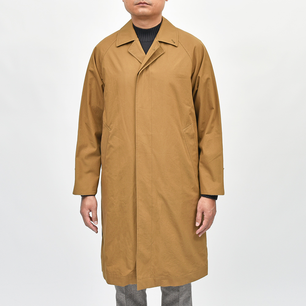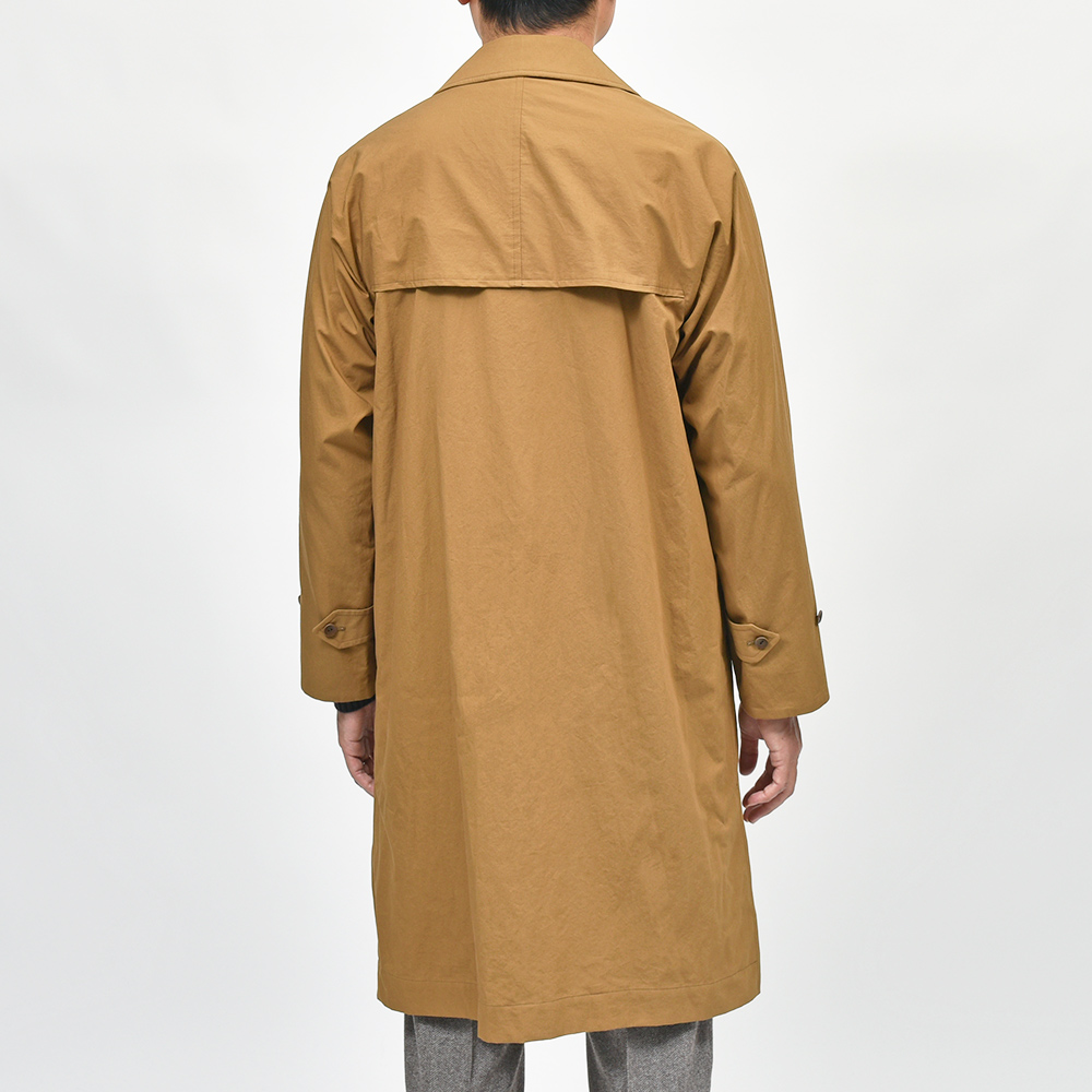 デザイナーである中込憲太郎氏自ら開発に携わる、オリジナルファブリックを使用するCOHERENCE。“COHERENCE Weather Resistant Cotton Light”と名付けられたこちらは、細番手の糸を使用し超高密度に織り上げることで、撥水性能を持つ軽量のコットンポプリン素材となっています。また、表面の凹凸感がサラリとした風合いをもたらしつつも、身頃の裏地にはカシミヤ素材のライニングが取り付けられていることで防寒性を持たせています。軽量で保温性の高いディティールに、ゆったりとしたサイズ感であることで、インナーの調節がし易くインナー次第で秋口から春先までの長い期間で着用できる一着です。