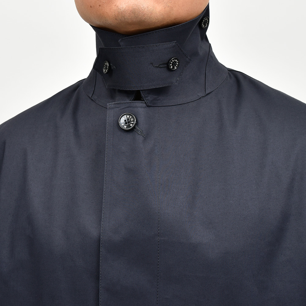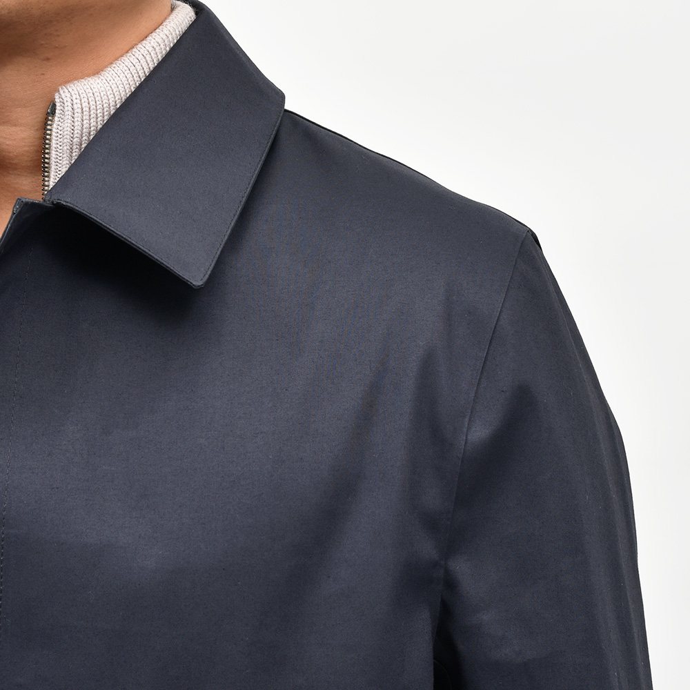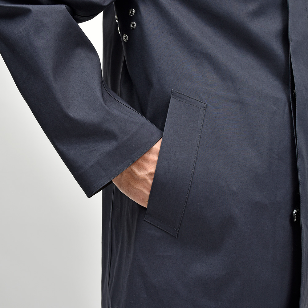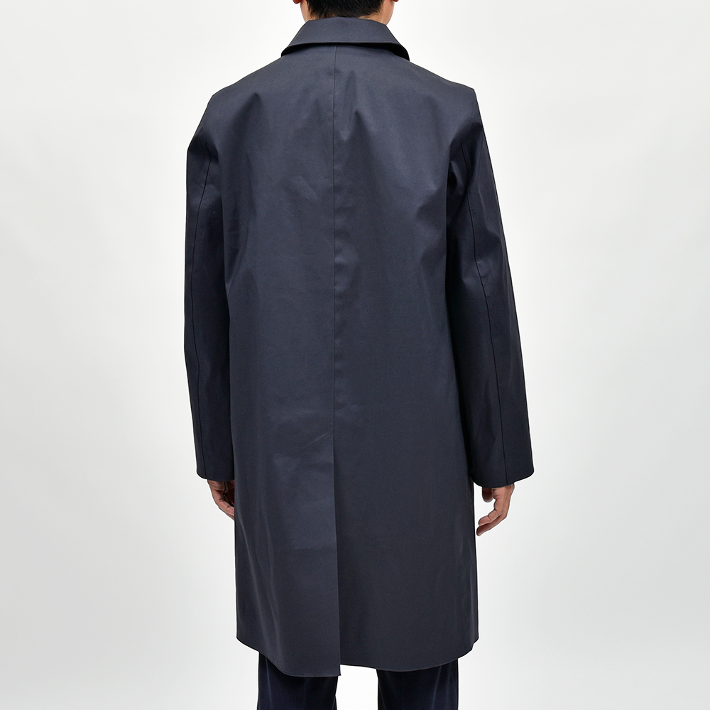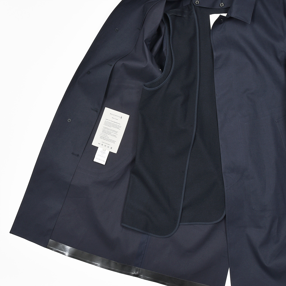 言わずと知れたMACKINTOSHのゴム引き生地は、二枚の生地の間に天然ゴムを塗り圧着することで高い防水性と防風性を持ちます。また、全ての縫い目の裏側には職人の手作業によって止水テープが貼られており、それによって完全な防水のコートを作り上げることができます。