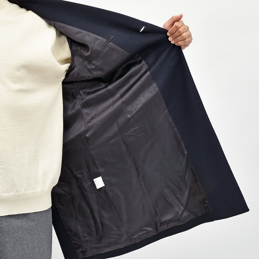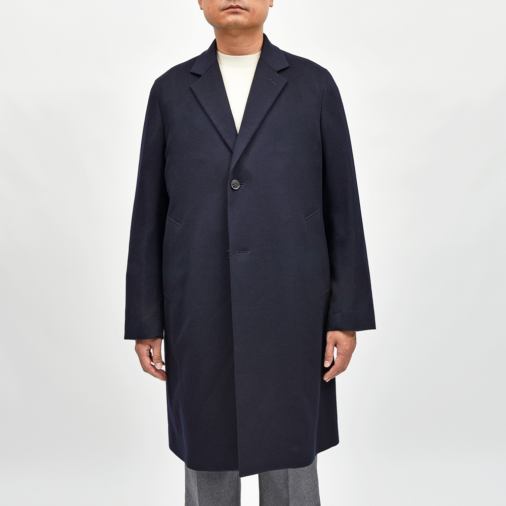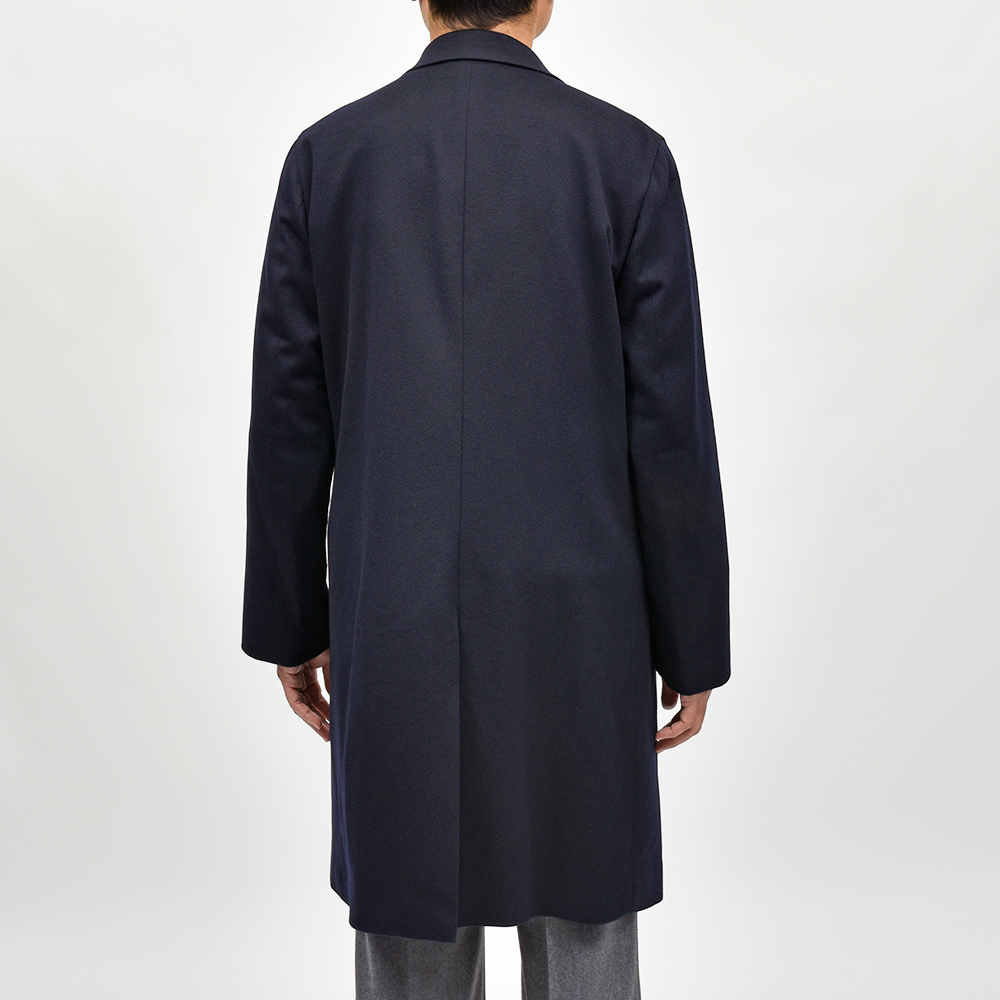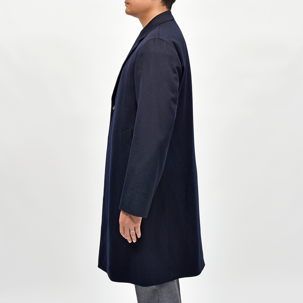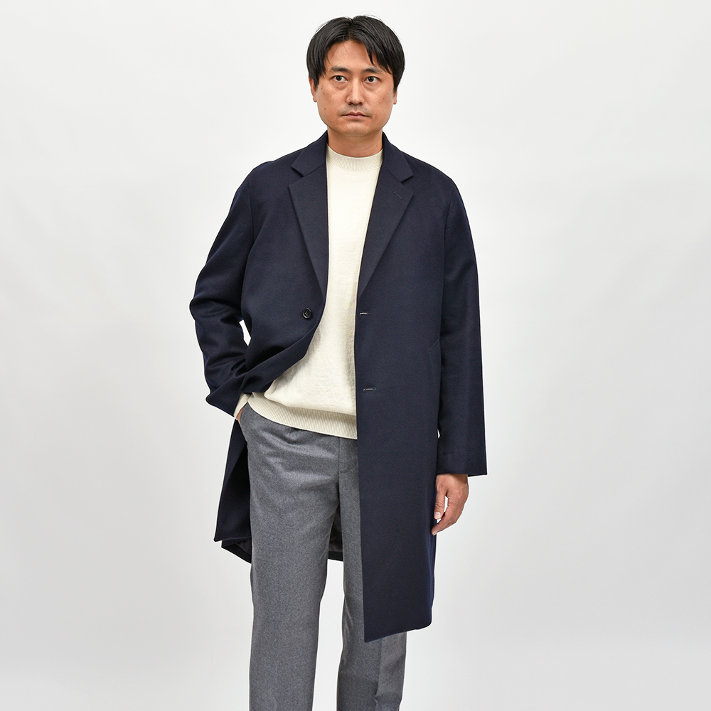 シンプルなチェスターコートのモデル“NEW STANLEY(ニュースタンレー)”。ノッチドラペルにセンターベントといったクラシカルなデザインに、絞り過ぎていないウエストのシェイプ、フロントの2つボタン仕様がどこかモダンな雰囲気を併せ持ちます。