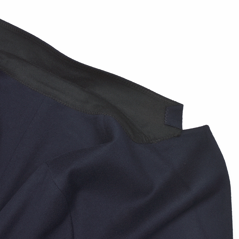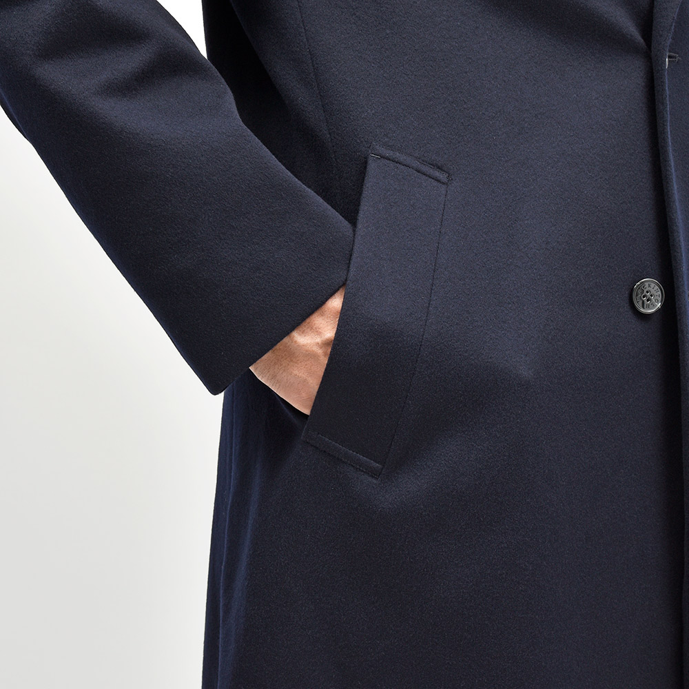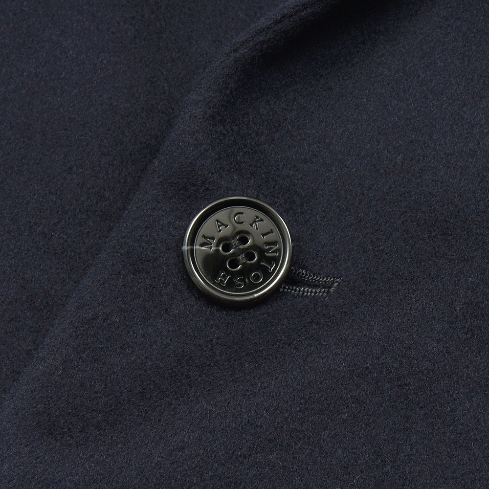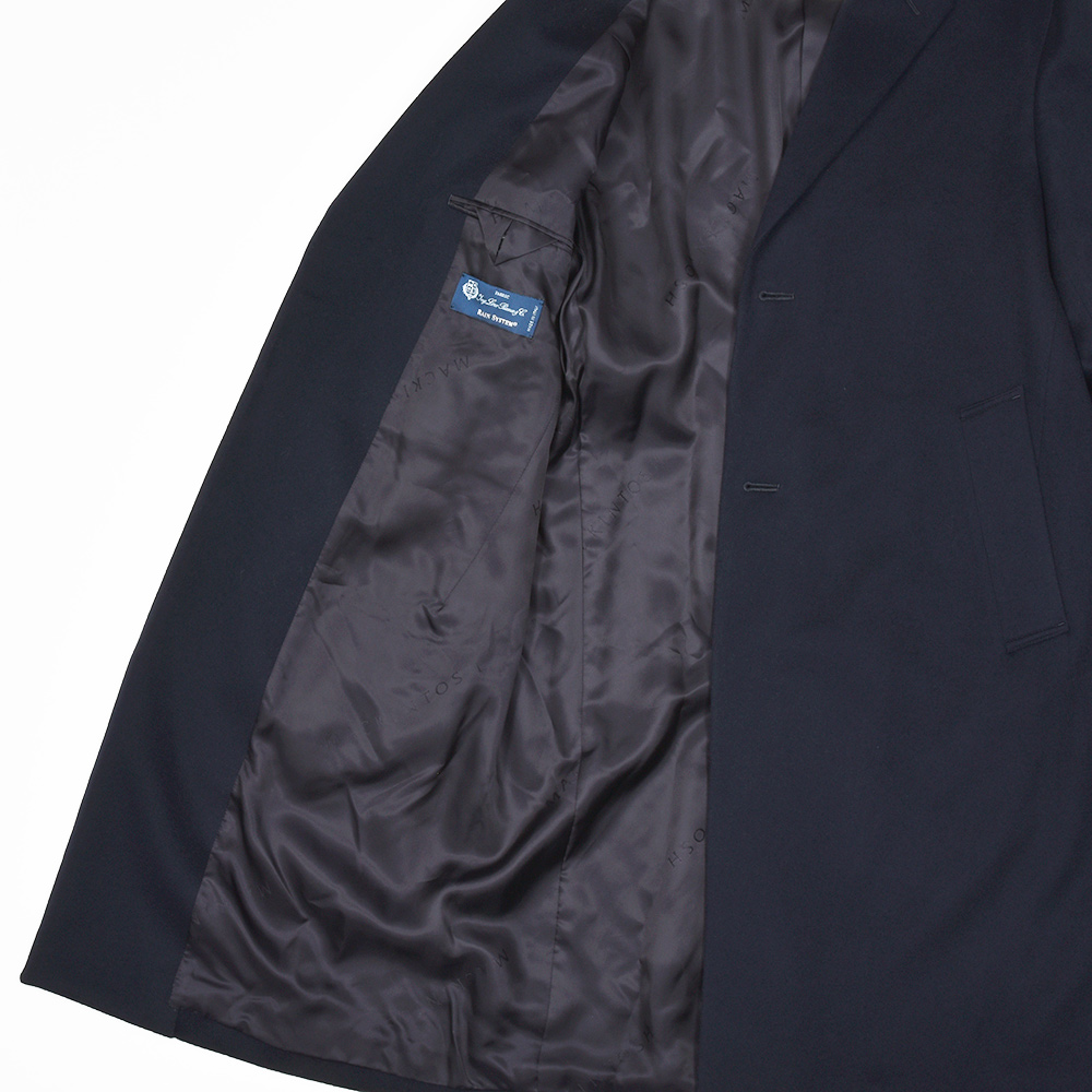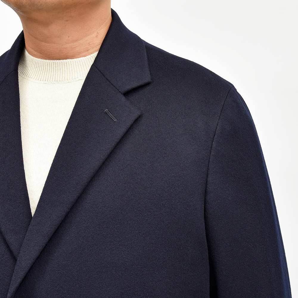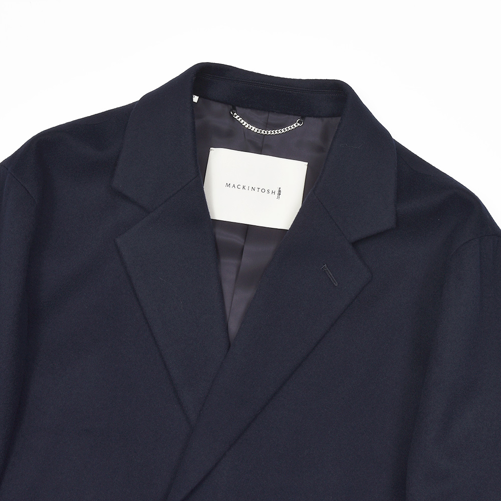 シンプルなチェスターコートのモデル“NEW STANLEY(ニュースタンレー)”。ノッチドラペルにセンターベントといったクラシカルなデザインに、絞り過ぎていないウエストのシェイプ、フロントの2つボタン仕様がどこかモダンな雰囲気を併せ持ちます。