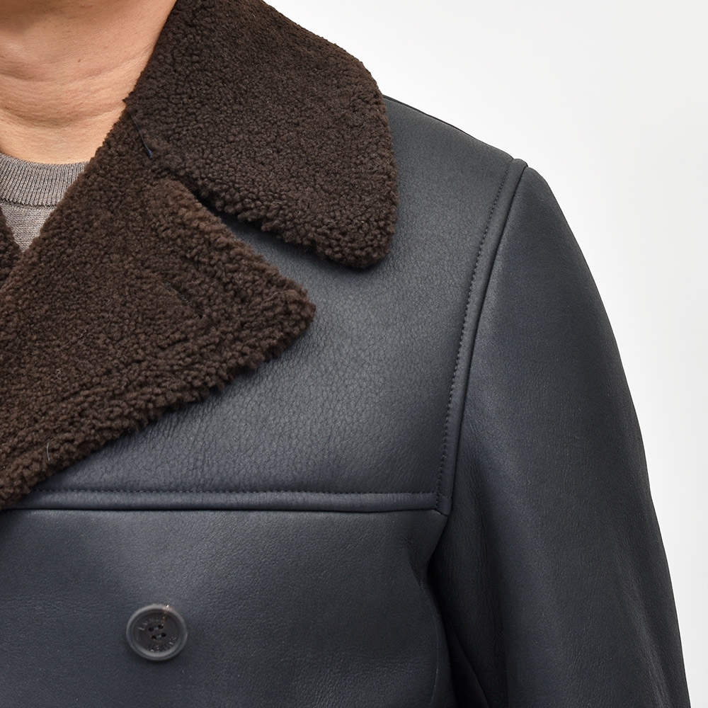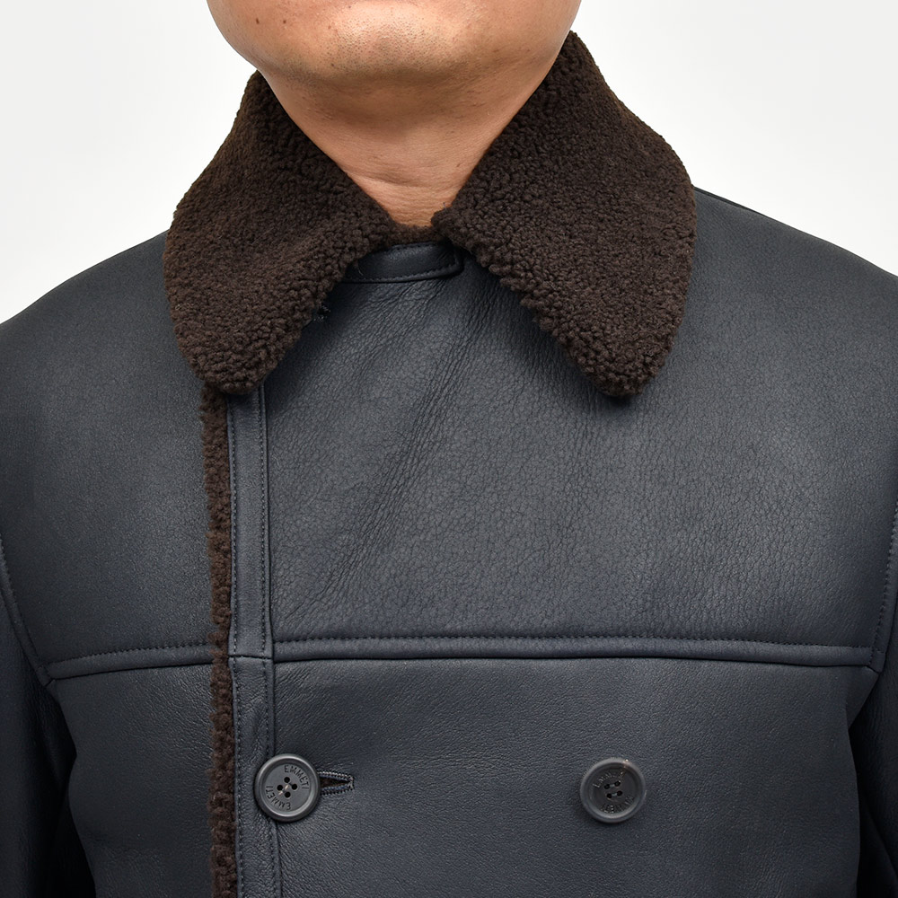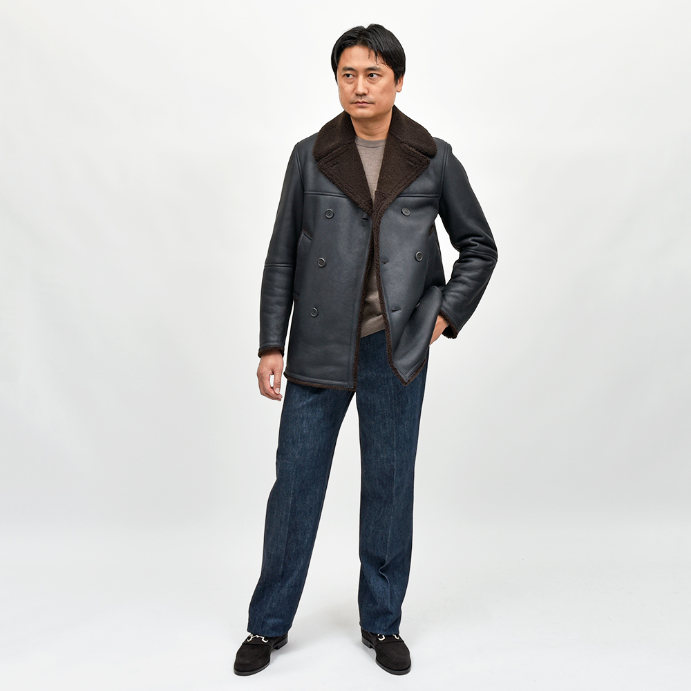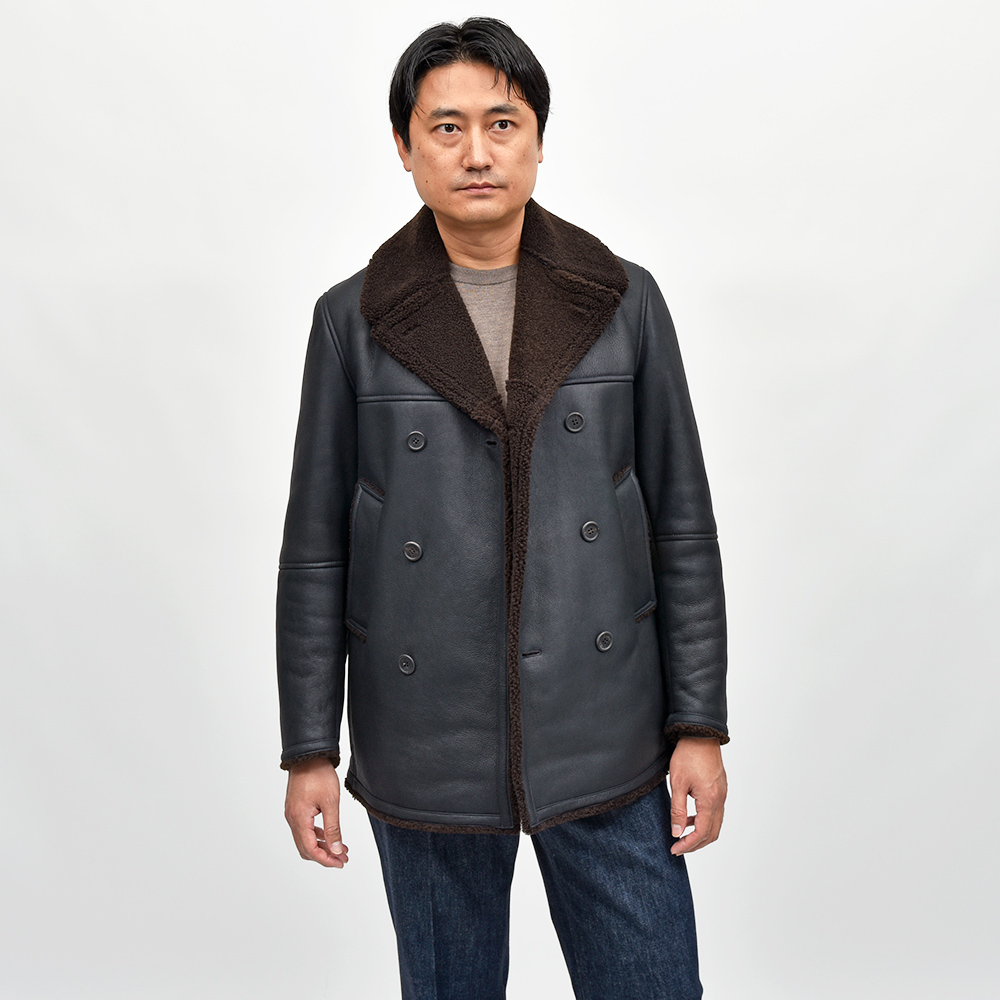 Pコートをベースとしたモデル"AVON(エイボン)"。コチラは、通常袖に付けられているストラップを取り除いたモデルになります。ややスリムなシルエットにシンプルなデザインは、切り返し部が程よいアクセントに。襟や袖口に裾といった端々から覗くムートンヘアーが、シックでエレガントな雰囲気を持ちつつも、タイリングのポイントとなってくれる丁度良い存在感です。