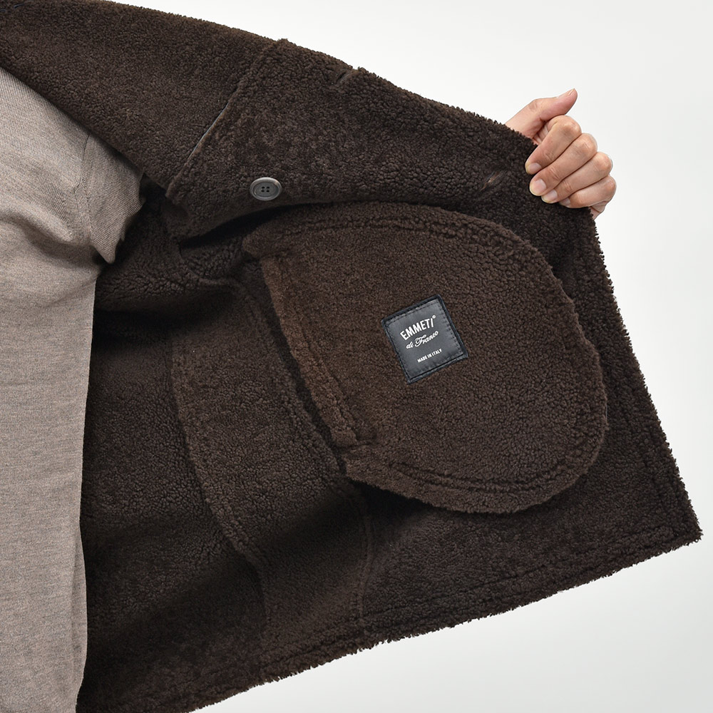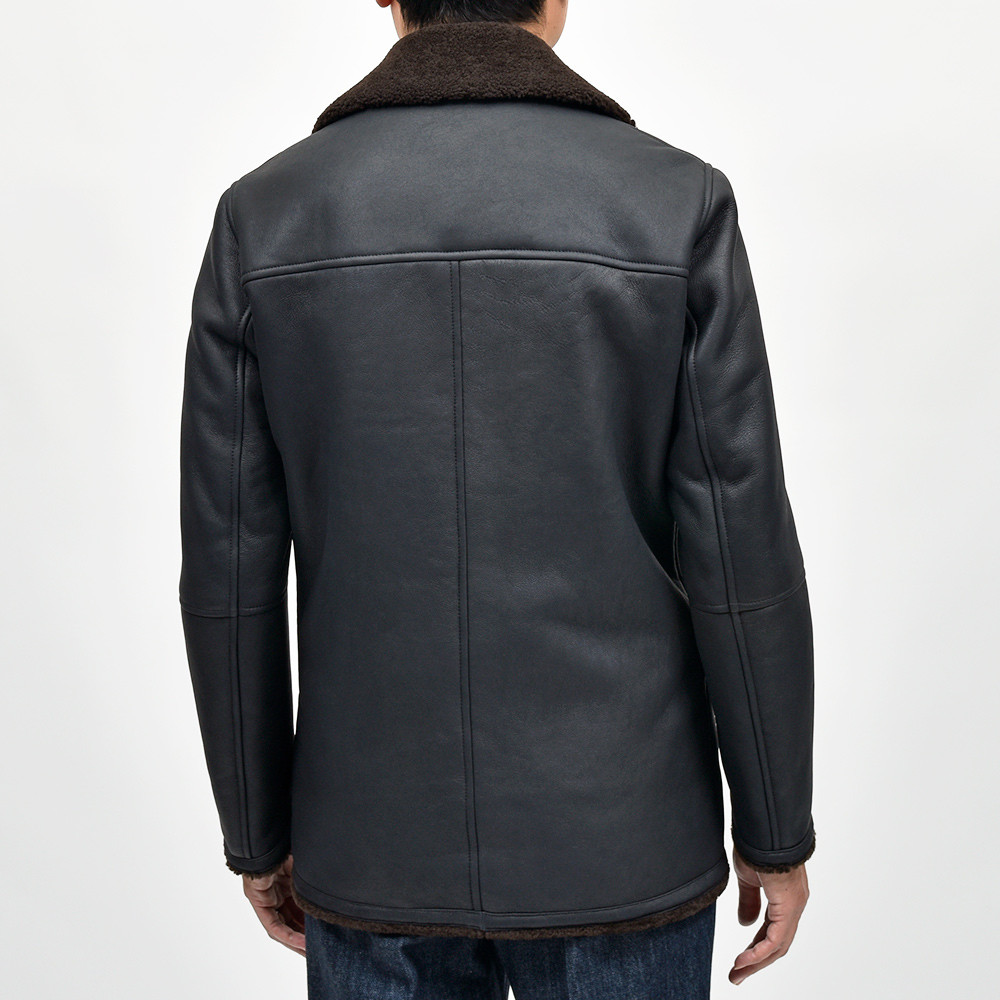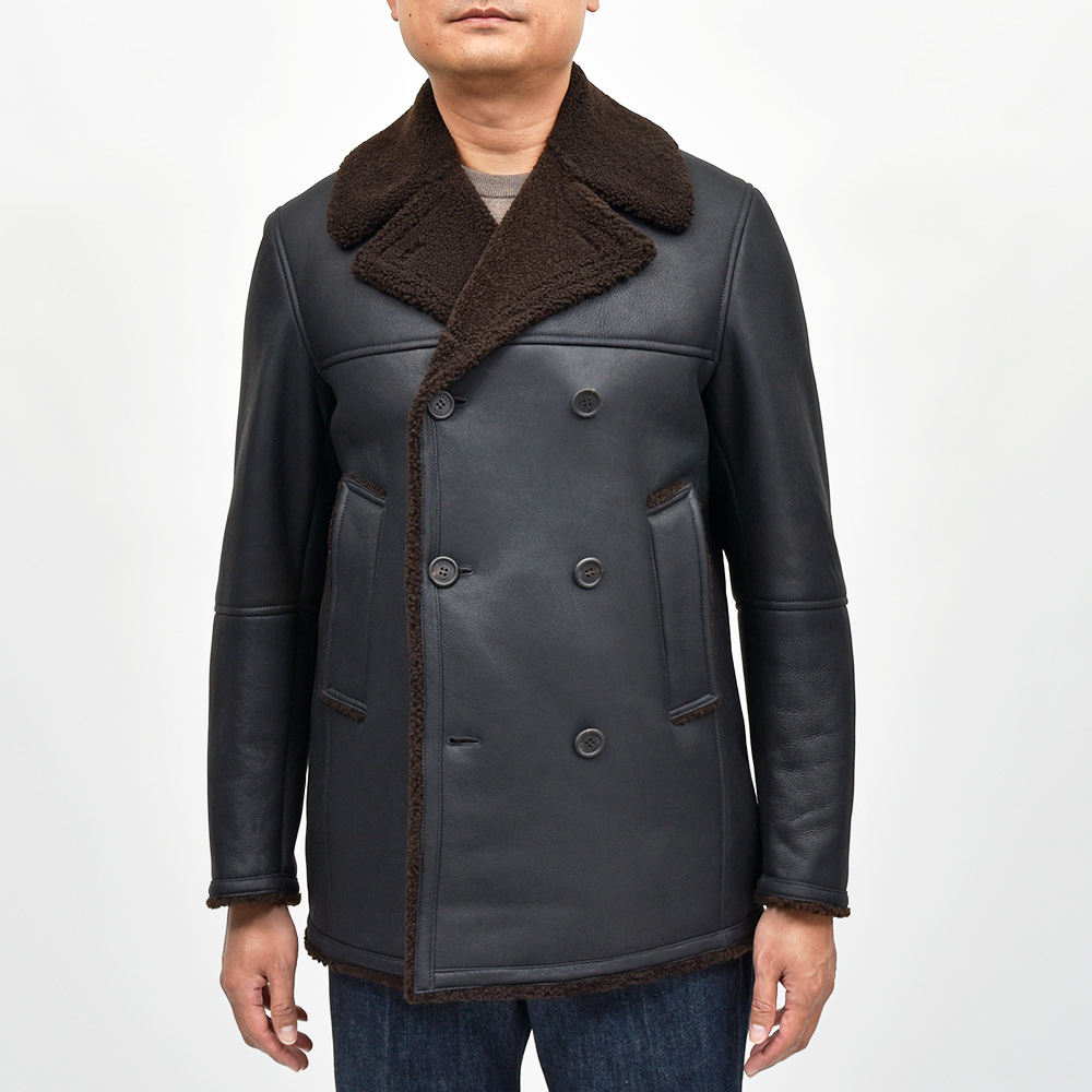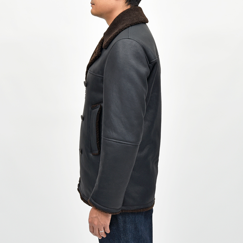 Pコートをベースとしたモデル"AVON(エイボン)"。コチラは、通常袖に付けられているストラップを取り除いたモデルになります。ややスリムなシルエットにシンプルなデザインは、切り返し部が程よいアクセントに。襟や袖口に裾といった端々から覗くムートンヘアーが、シックでエレガントな雰囲気を持ちつつも、タイリングのポイントとなってくれる丁度良い存在感です。