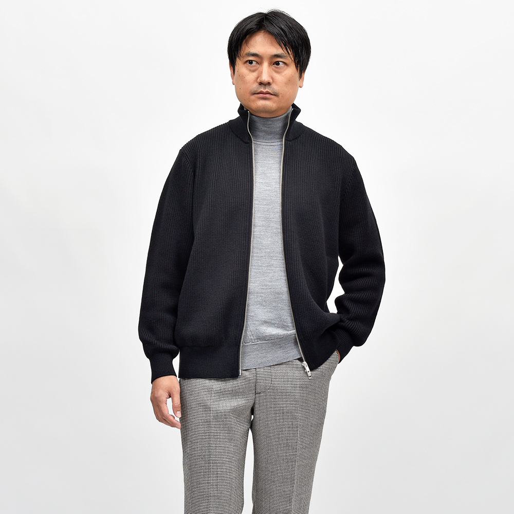 エクストラファインメリノウールを使用した7ゲージの畦編みドライバーズニット。シルクのような光沢感とカシミヤのような滑らかな肌触りを持つ高級ウールを贅沢に編み込んでいます。毛玉が起きにくく、また手洗いで洗濯ができる汎用性。こちらは片畦編みすることで軽量化し、日常使いしやすい一着となっています。