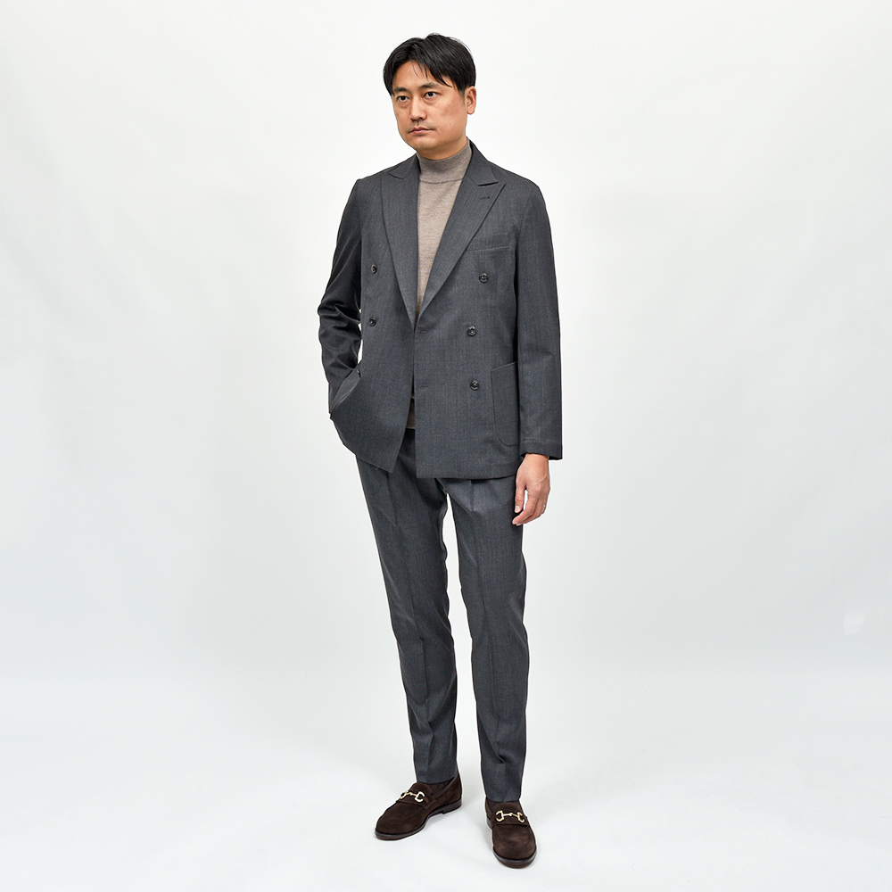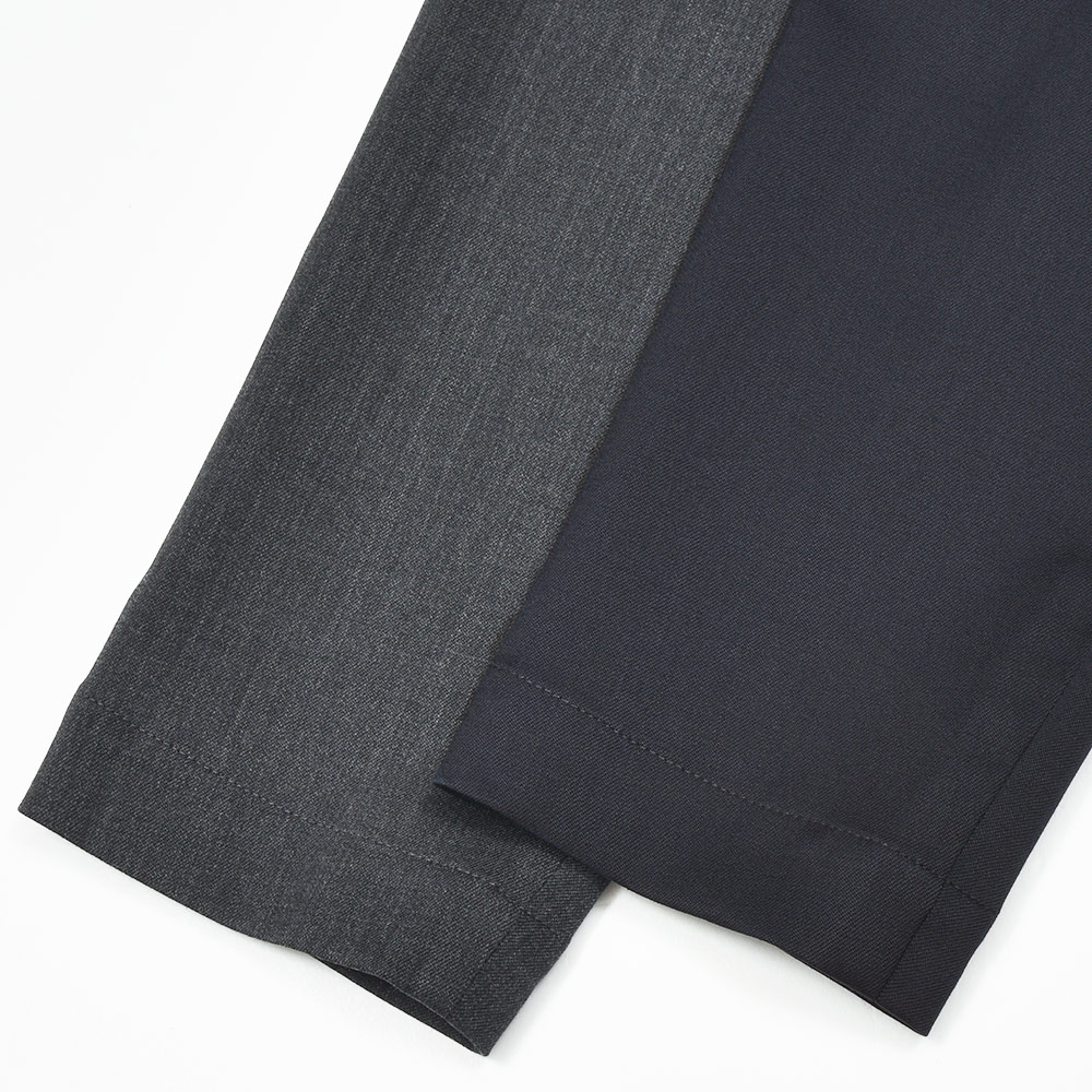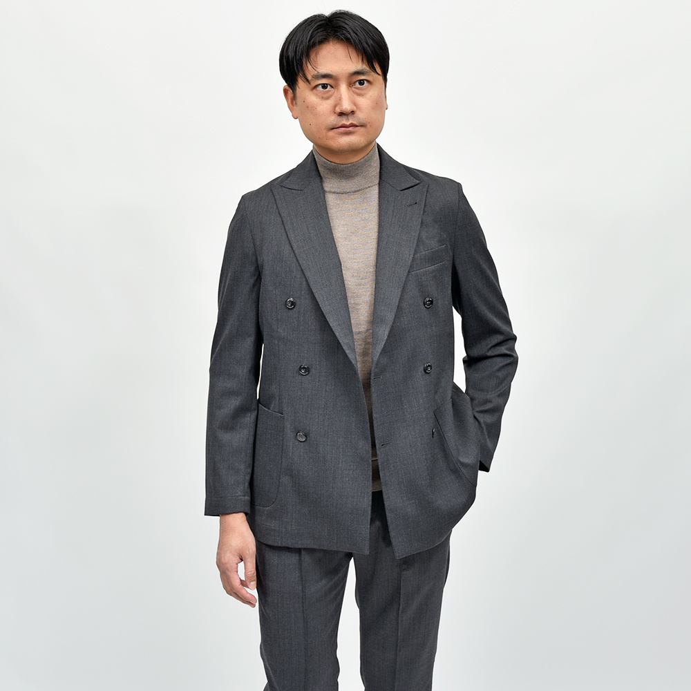 通常のラインよりもラグジュアリーなファブリックを使用したgiabsarchivioのハイエンドライン“giabsarchivio GOLD”。コチラは真夏以外で着用できるサージ生地のテクノウールになります。目付け275gと汎用性の高いややライトな生地に、高級感のある艶感。ほとんど起毛感のないサージですので、秋から春までの長い期間で着用可能です。また、ウォッシャブルですので家庭での洗濯が可能となった、非の打ち所がない逸品となっています。